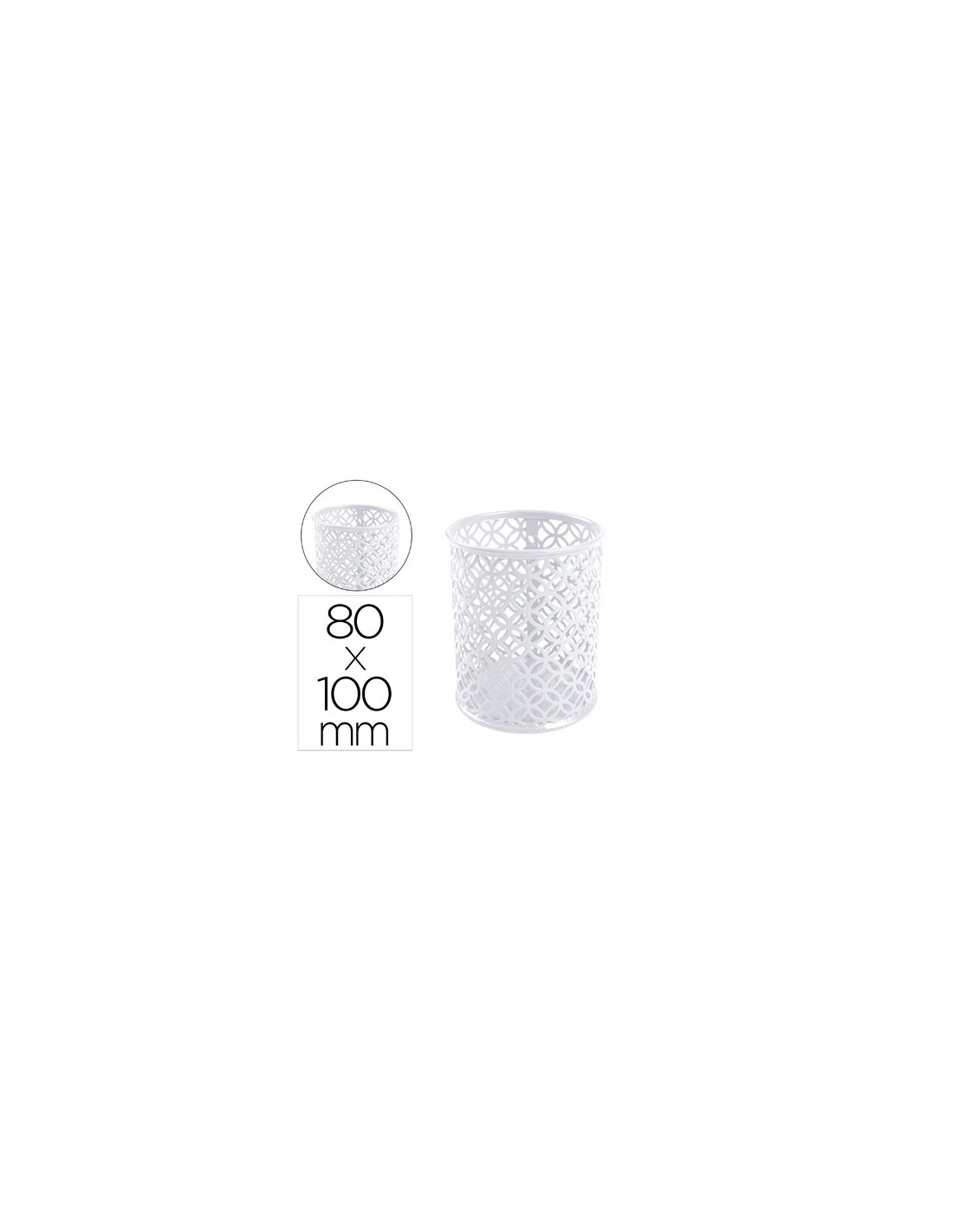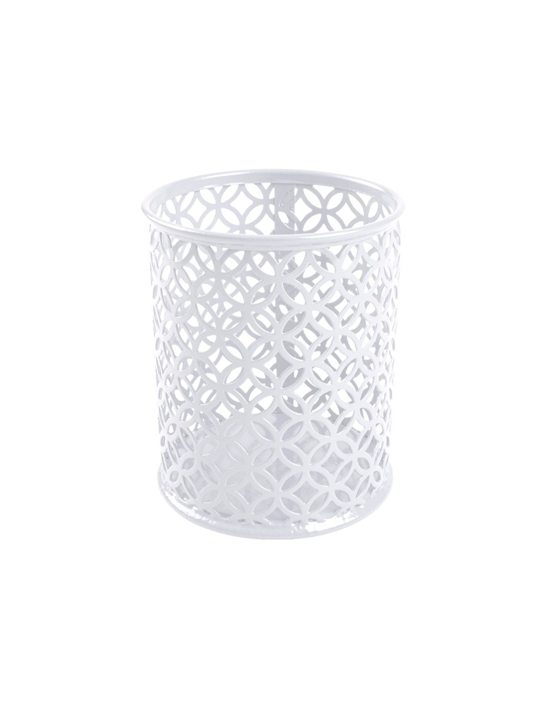 Cubilete redondo de metal con diseño de rejilla en círculos. Perfecto para alojar lápices, rotuladores, bolígrafos. No incluye accesorios. Medidas: Ø 80 x 100 mm.
