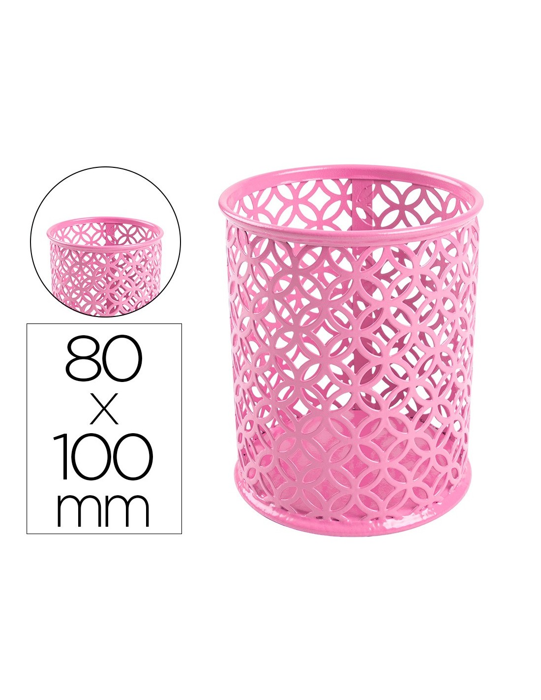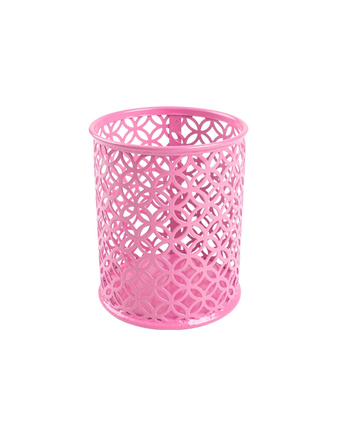 Cubilete redondo de metal con diseño de rejilla en círculos. Perfecto para alojar lápices, rotuladores, bolígrafos. No incluye accesorios. Medidas: Ø 80 x 100 mm.