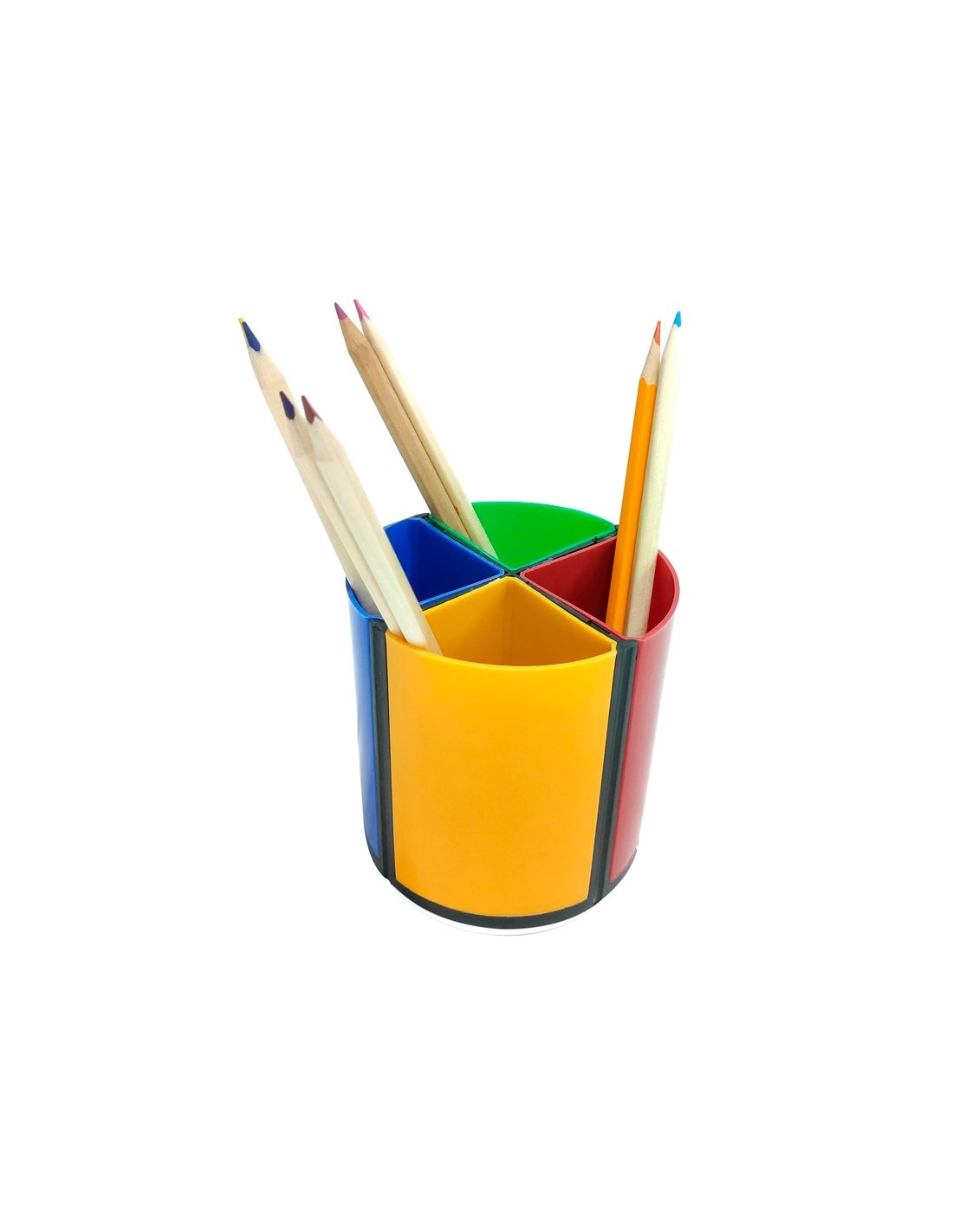Cubilete portalápices redondo fabricado en plástico resistente. Giratorio. Dividido en 4 compartimentos de 4 colores distintos ideal para separar los bolígrafos, lápices, rotuladores, etc. No incluye accesorios. Medidas: Ø110 x 110 mm.
