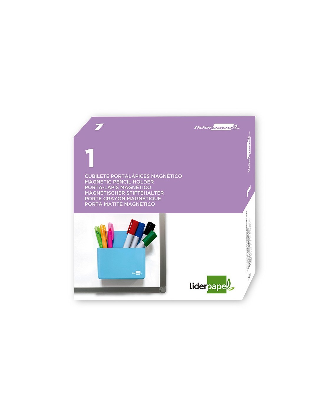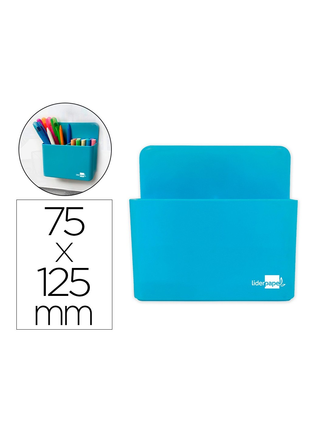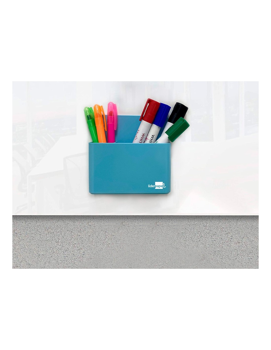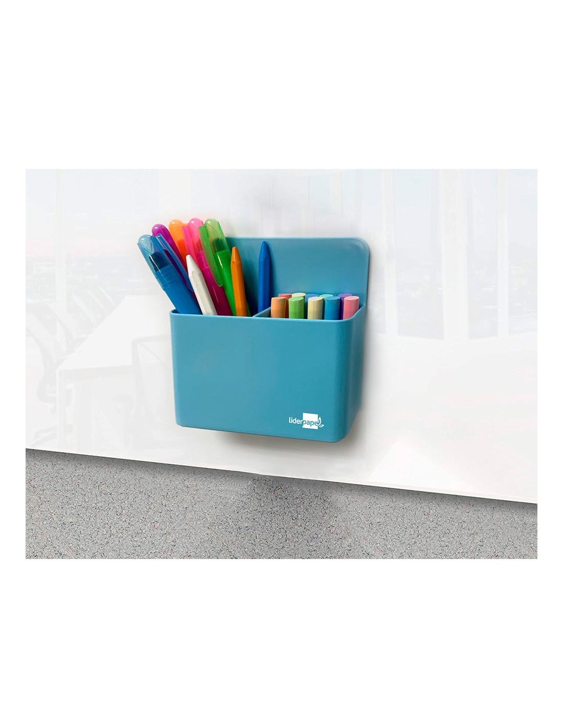 Cubilete magnético con imán muy potente, para superficies de metal como pizarras blancas o armarios. 100% reciclable. 2 compartimentos móviles para mantener elementos rectos. Medidas interiores: 125 x 75 x 40 mm.