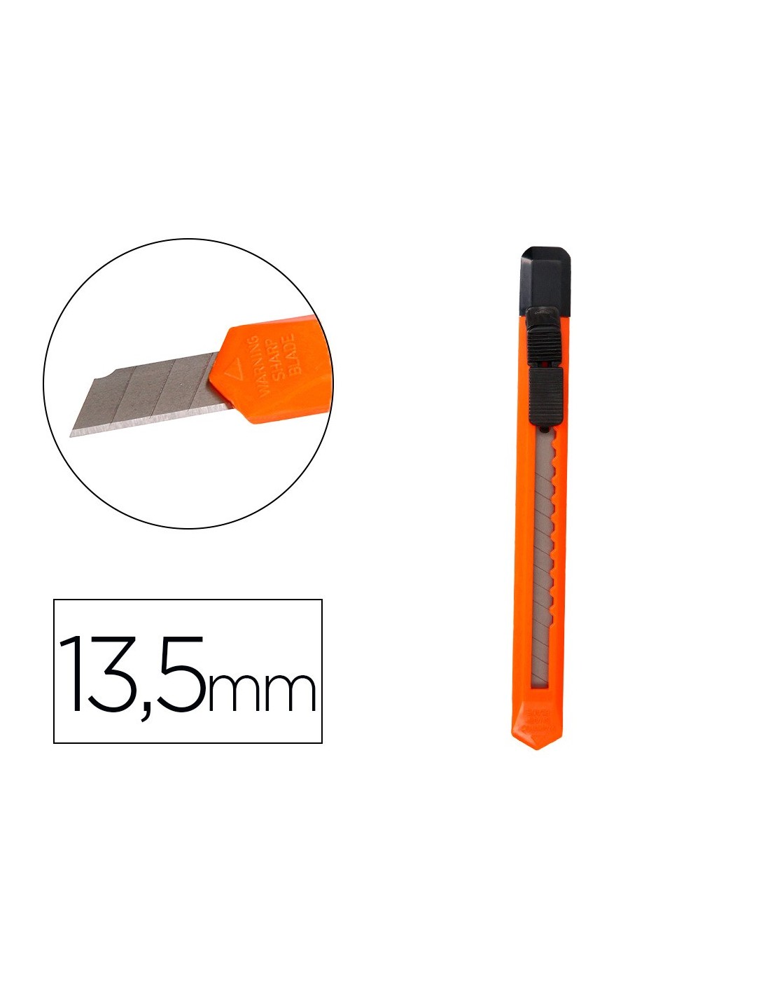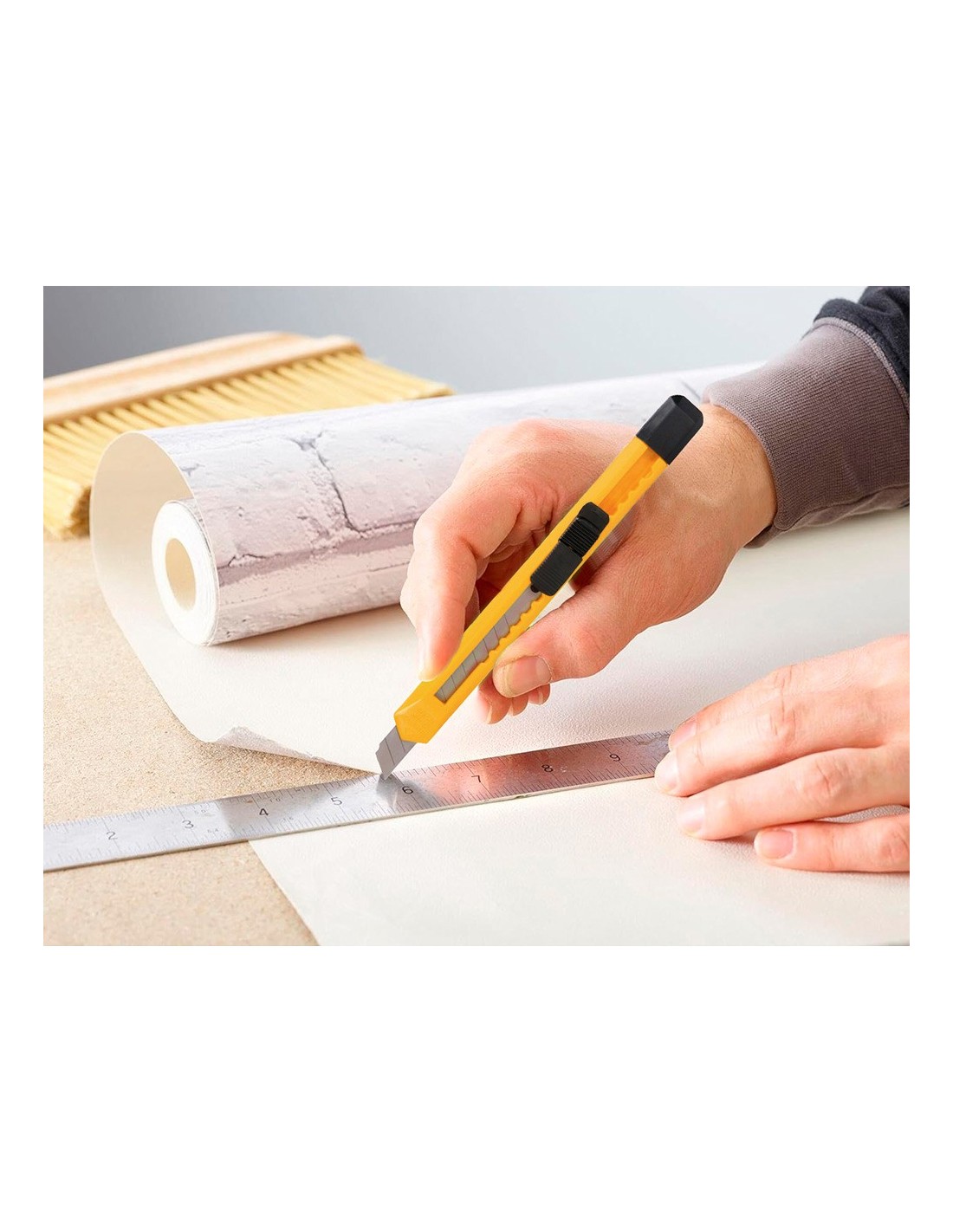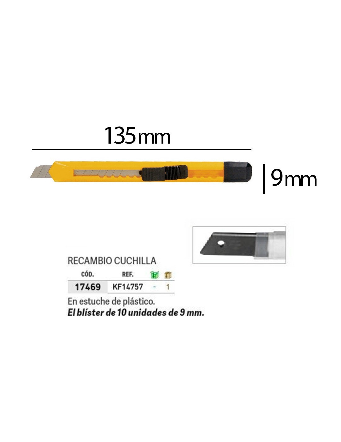 Retráctil e intercambiable. Con clip de sujeción. Cuchilla de acero precortado y freno de seguridad. Cuchilla de 9 mm de ancho. Longitud: 135 mm. El blíster de 1 unidad.