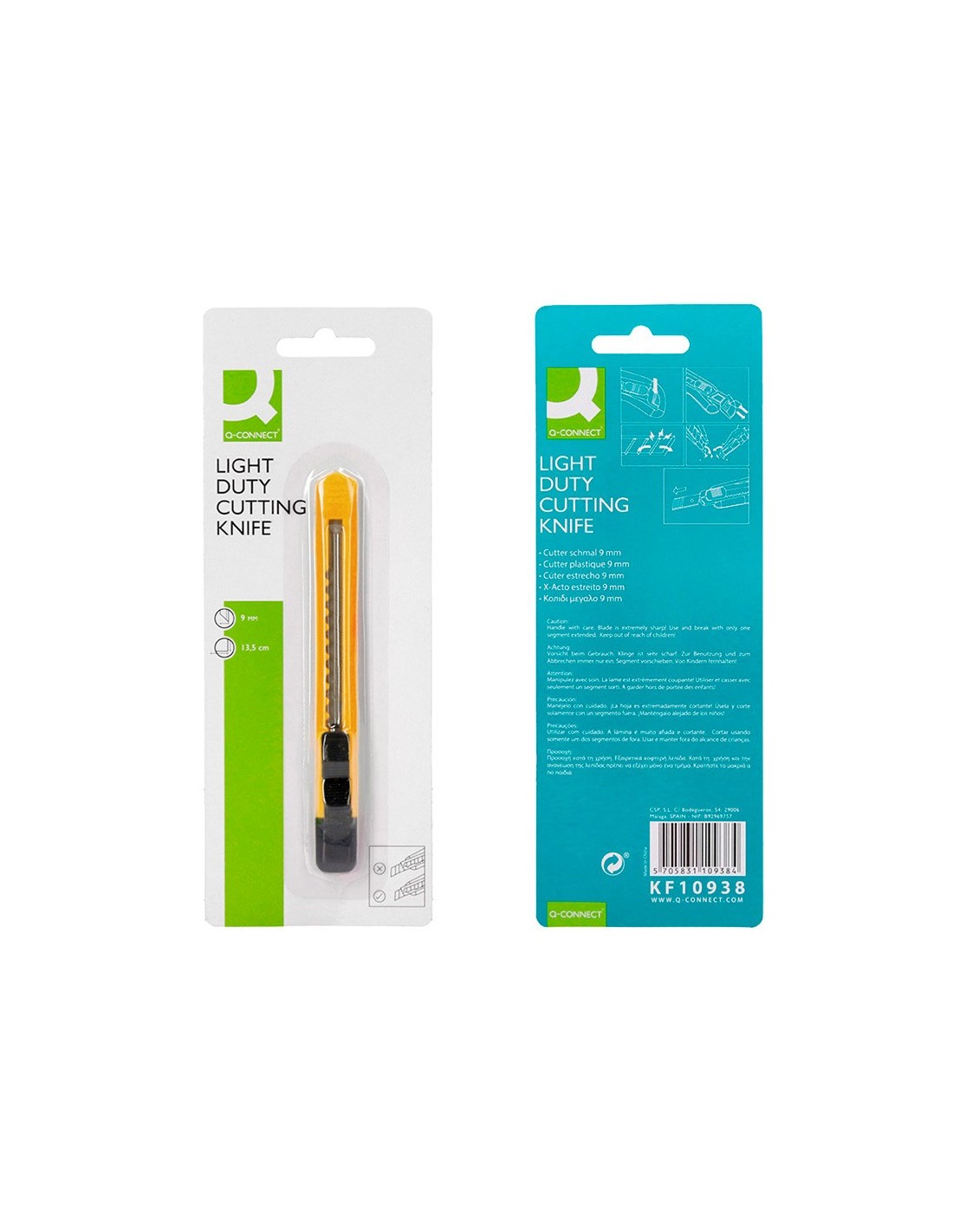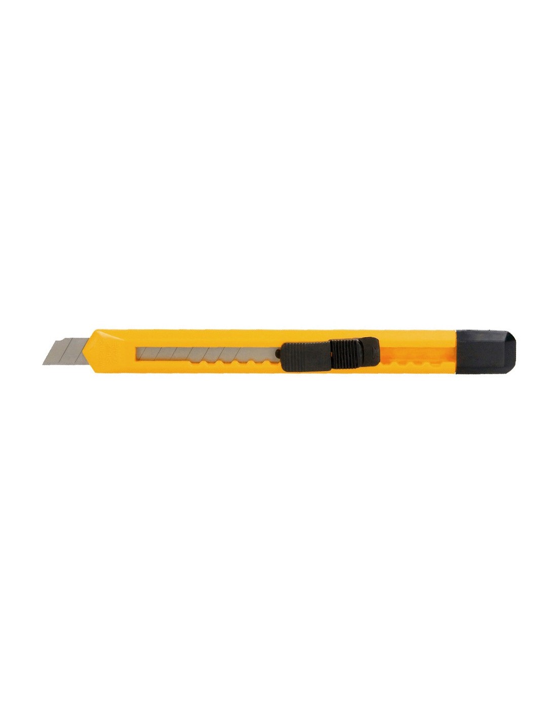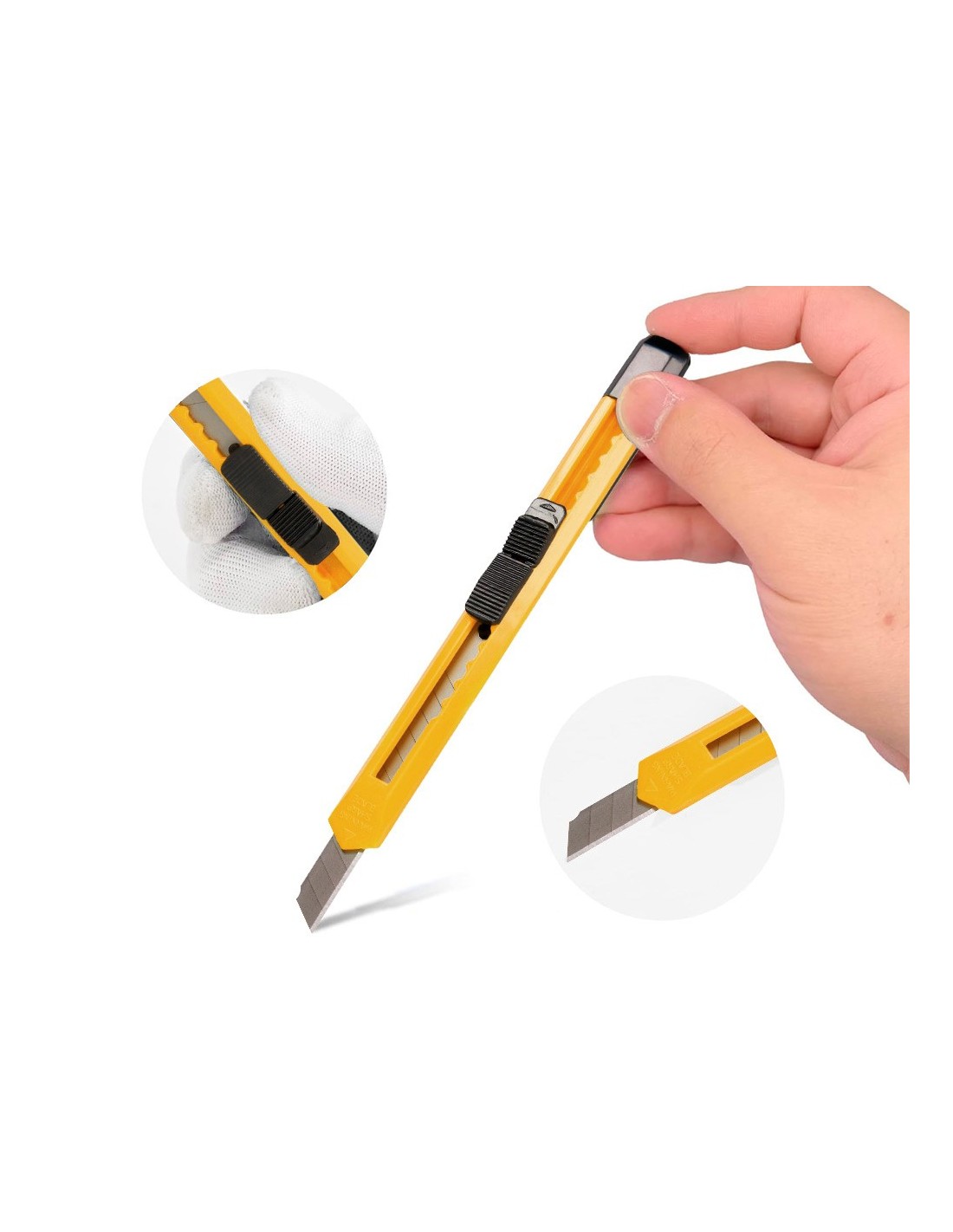 Retráctil e intercambiable. Con clip de sujeción. Cuchilla de acero precortado y freno de seguridad. Cuchilla de 9 mm de ancho. Longitud: 135 mm. El blíster de 1 unidad.