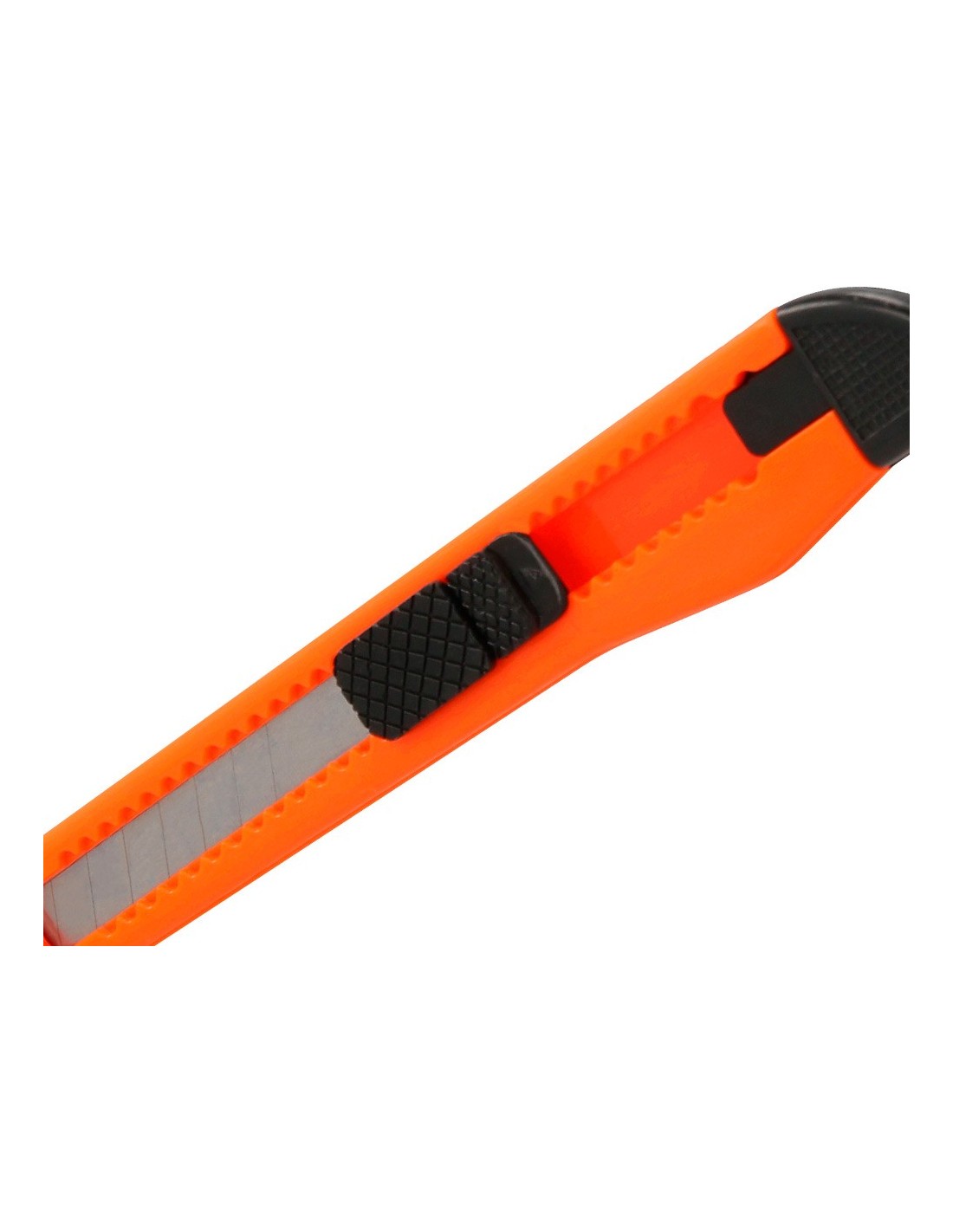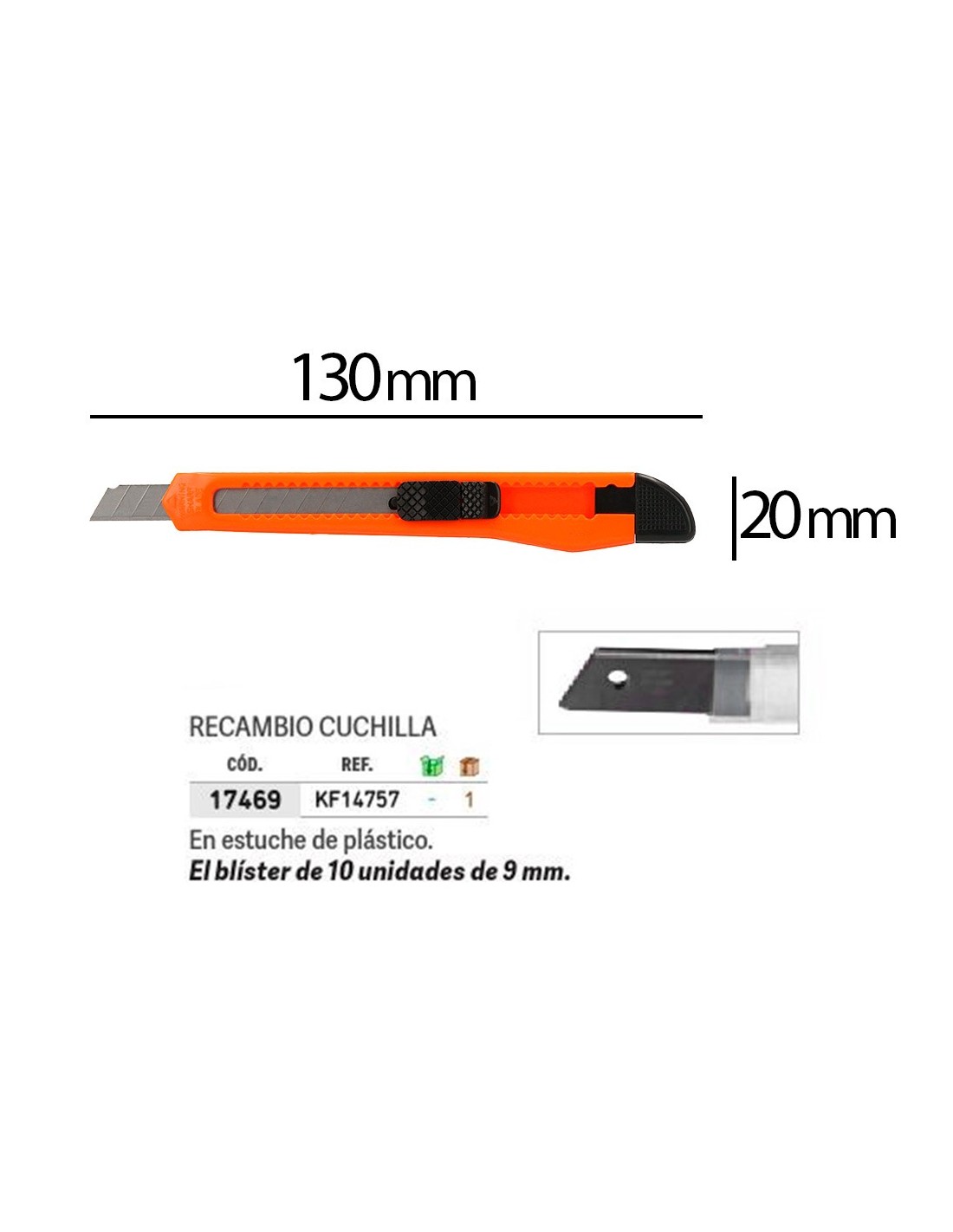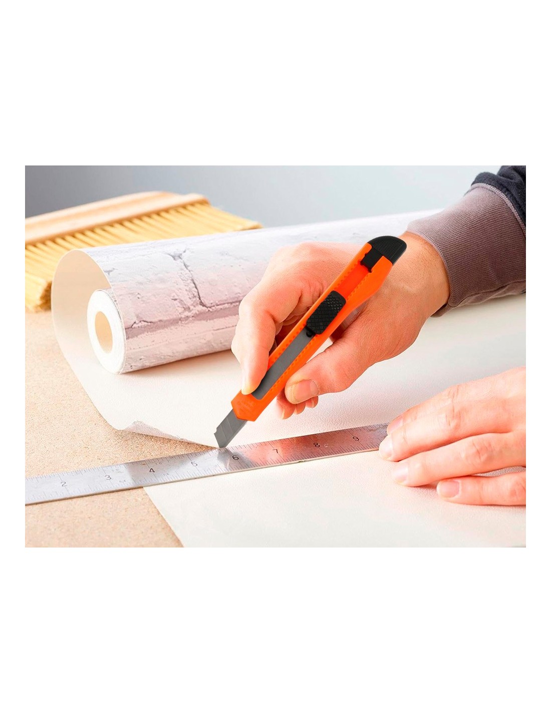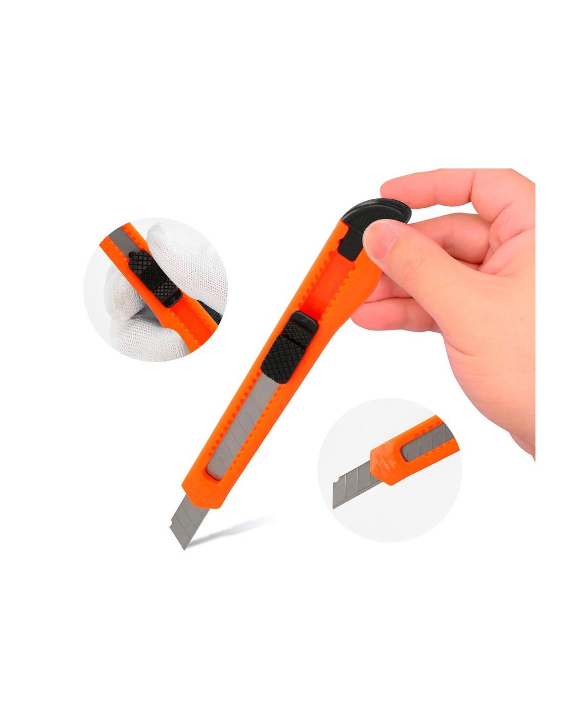Retráctil e intercambiable. Cuchilla de acero precortado y freno de seguridad. Cuchilla de 9 mm de ancho. Longitud: 130 mm. El blíster de 1 unidad.