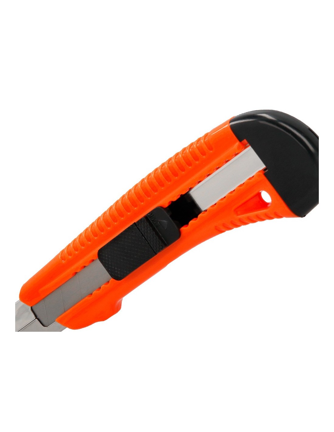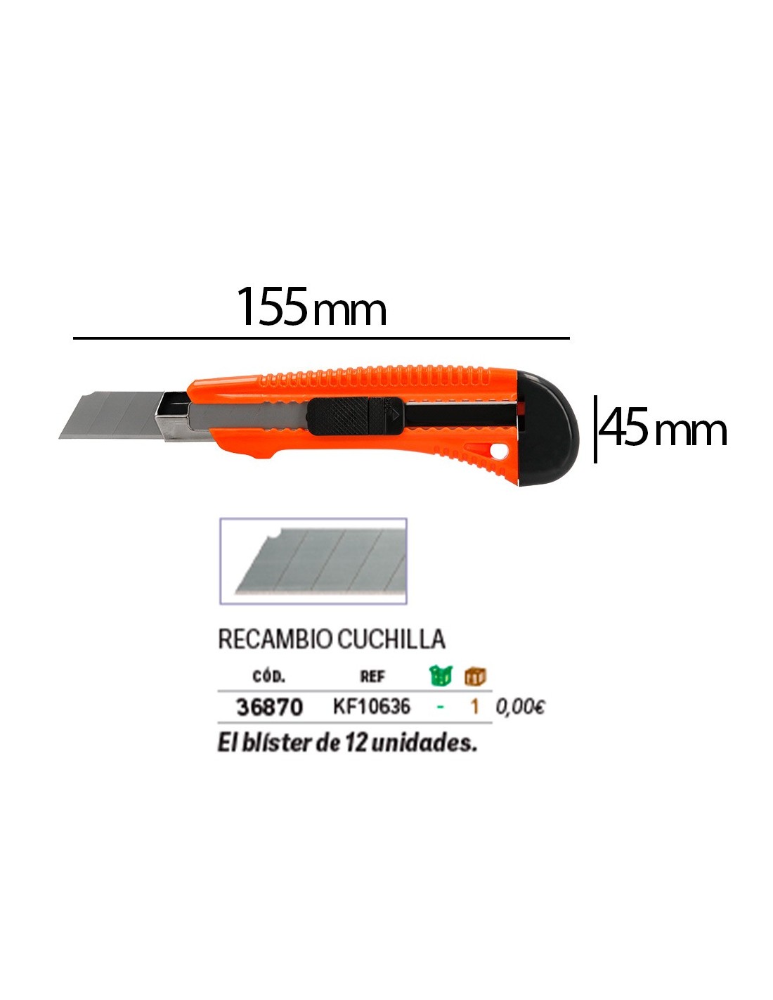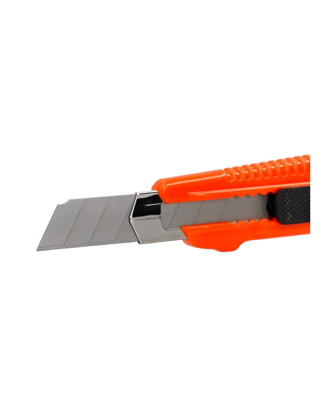 Retráctil e intercambiable. Protector metálico para cuchilla de acero precortado y freno de seguridad. Especial para cortar embalajes de cartón. Cuchilla de 18 mm de ancho. Longitud: 155 mm. El blíster de 1 unidad.