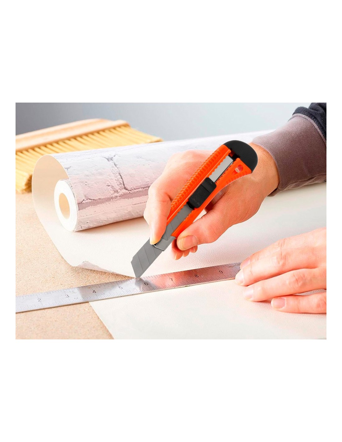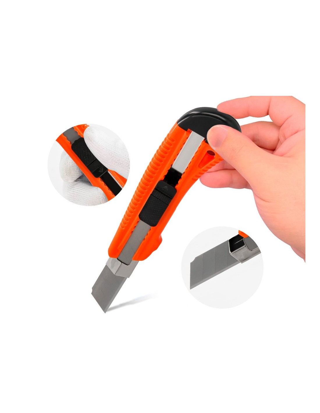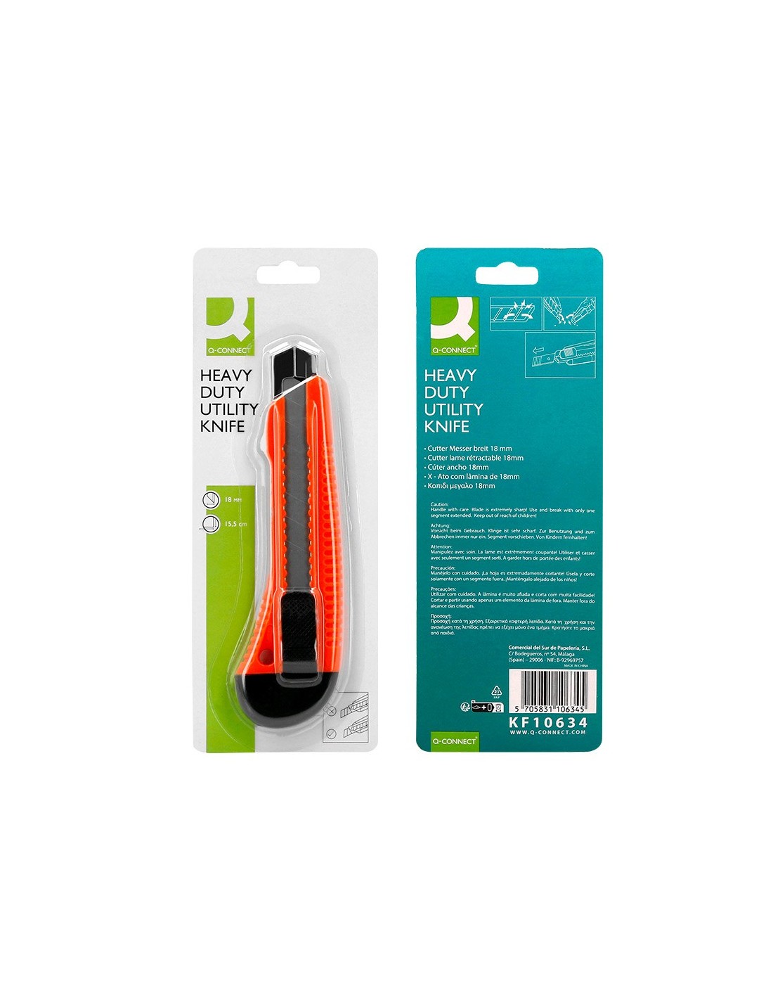 Retráctil e intercambiable. Protector metálico para cuchilla de acero precortado y freno de seguridad. Especial para cortar embalajes de cartón. Cuchilla de 18 mm de ancho. Longitud: 155 mm. El blíster de 1 unidad.