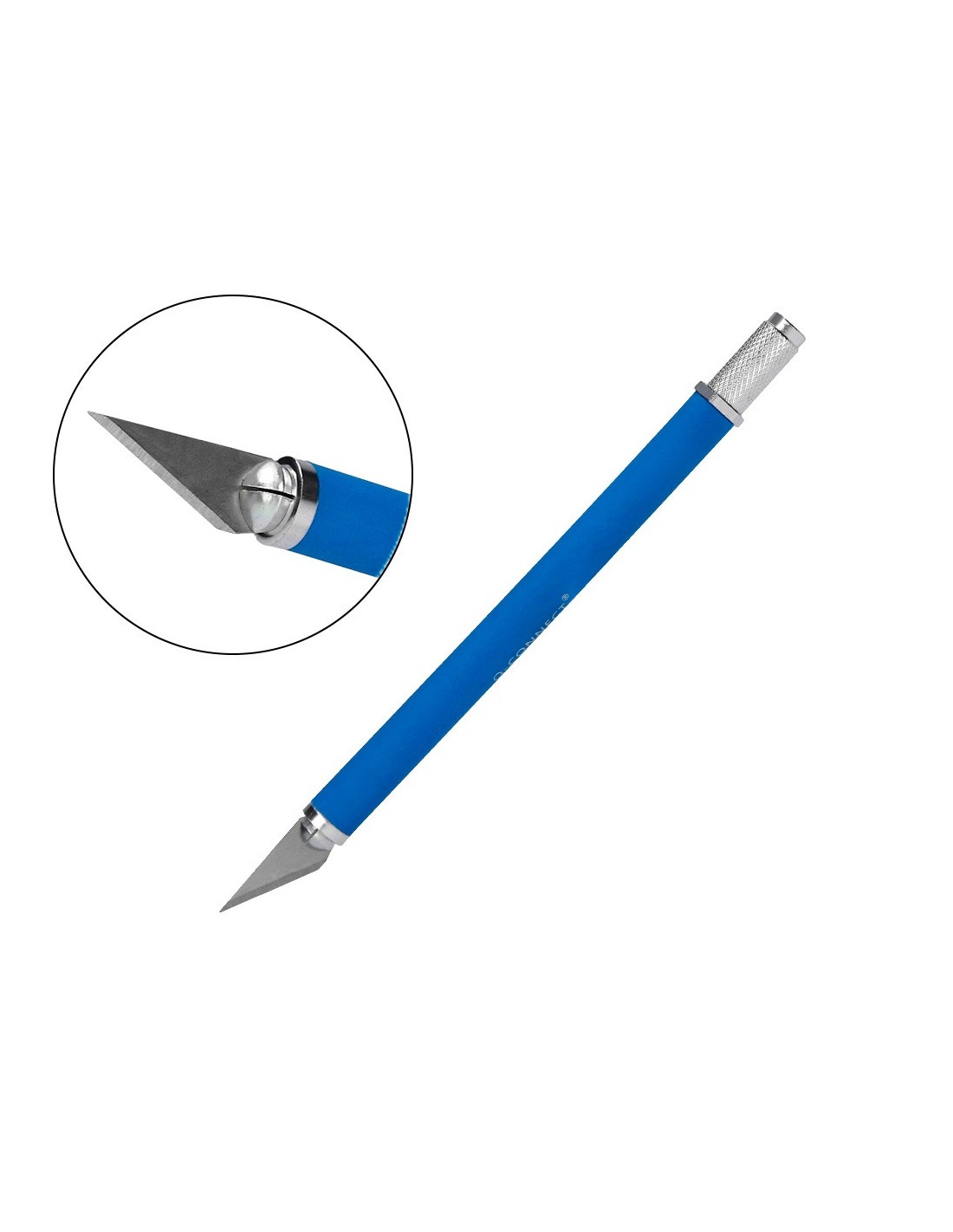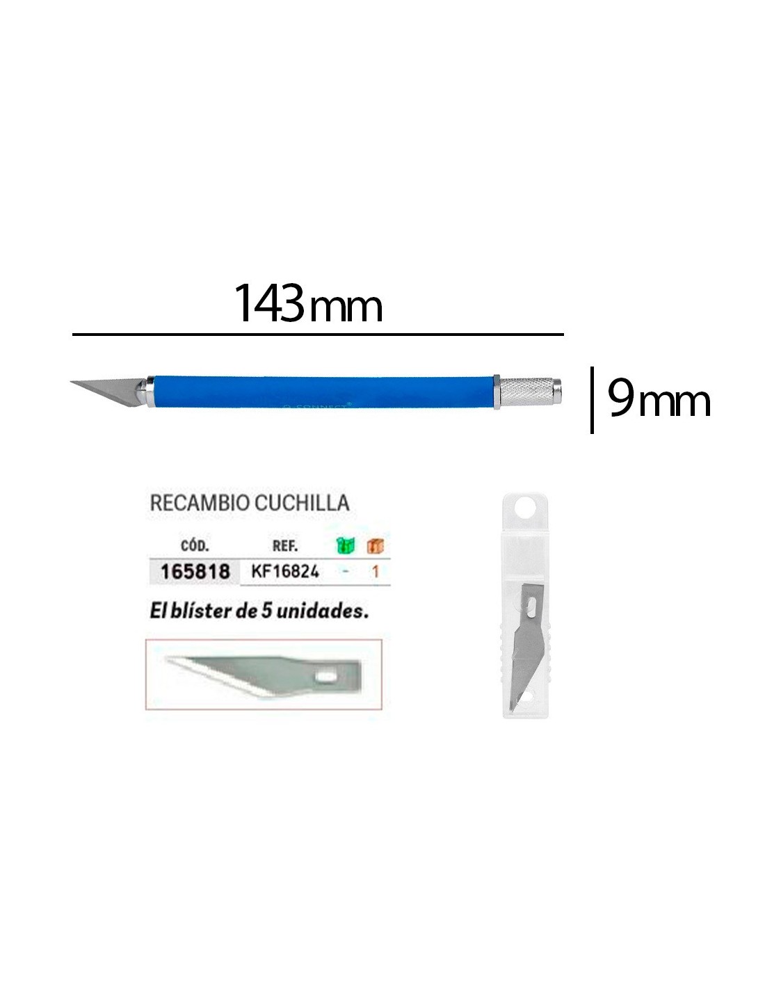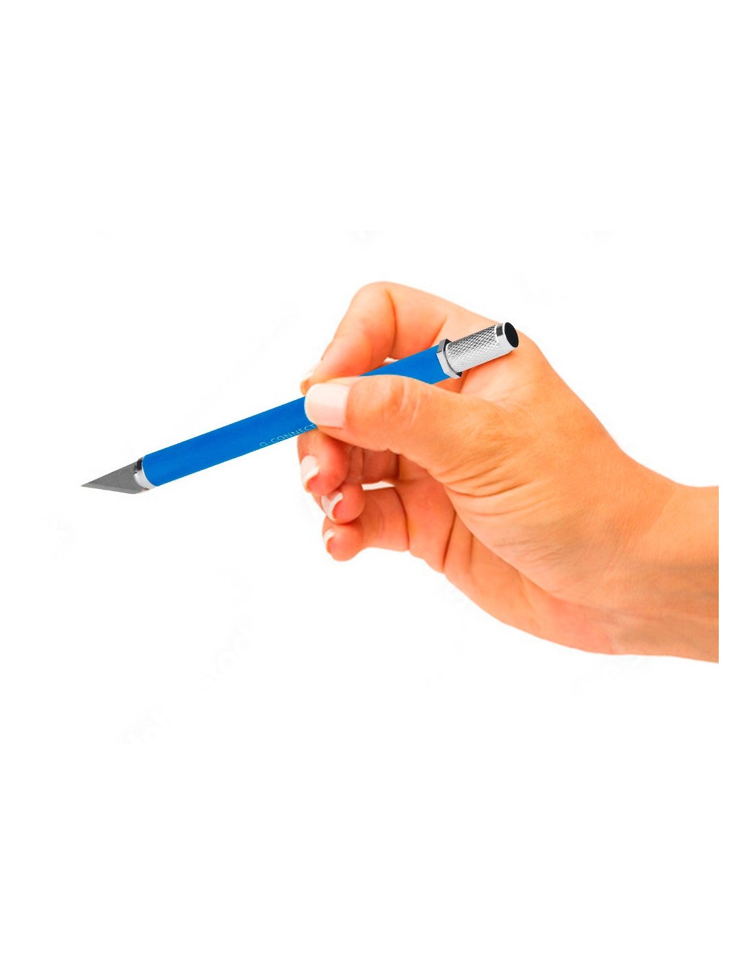 Con mango suave. Incluye tres cuchillas de repuesto y tapón de seguridad. Cuchillas de 6 mm. El blíster de 1 unidad.
