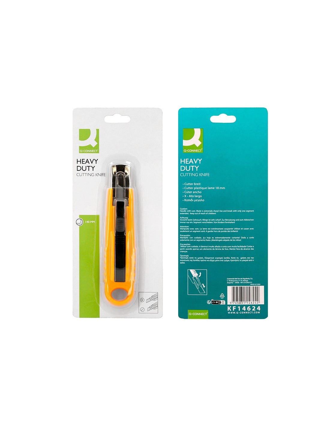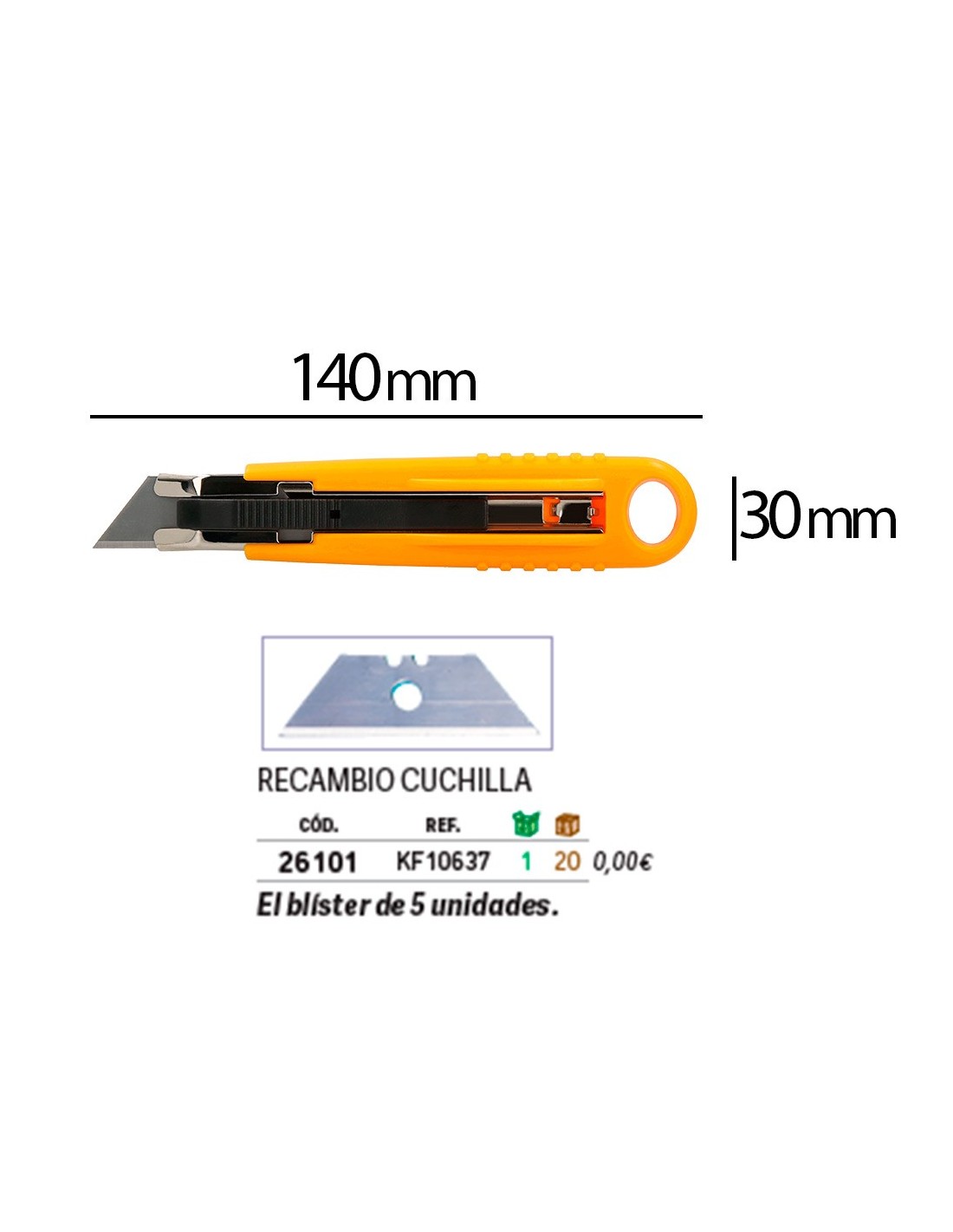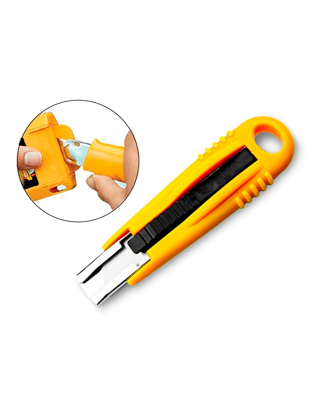 Fabricado en plástico y acero. Cuchilla retráctil de seguridad: la cuchilla solo sale al exterior cuándo se pulsa el mecanismo negro y vuelve al interior en el momento en que se deja de presionar, para así evitar que la cuchilla quede en el exterior cuando no se esté usando. Cuchilla de acero de 18 mm de ancho. Color amarillo. Recomendado pARA GRAN PÚBLICO Y PROFESIONales. Longitud: 140 mm. El blíster de 1 unidad.