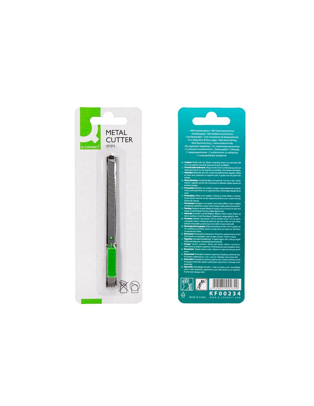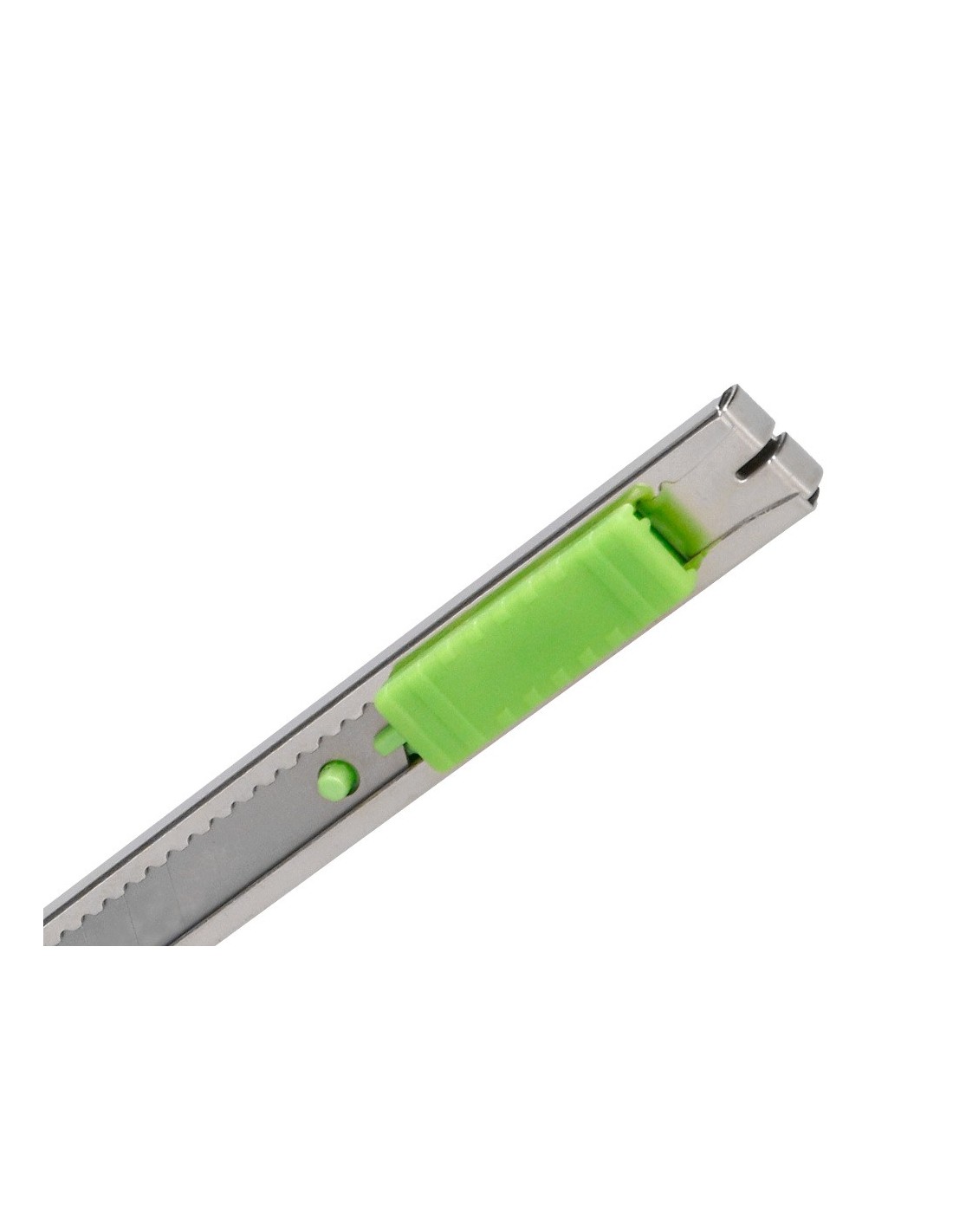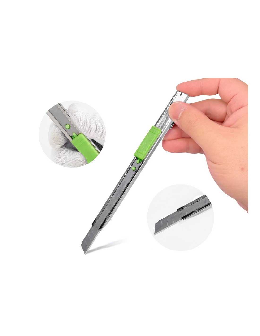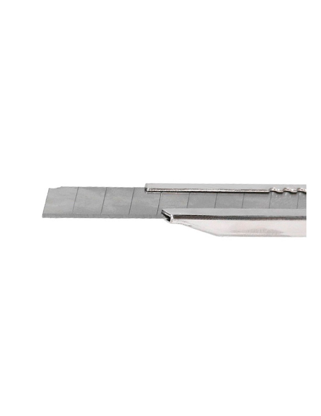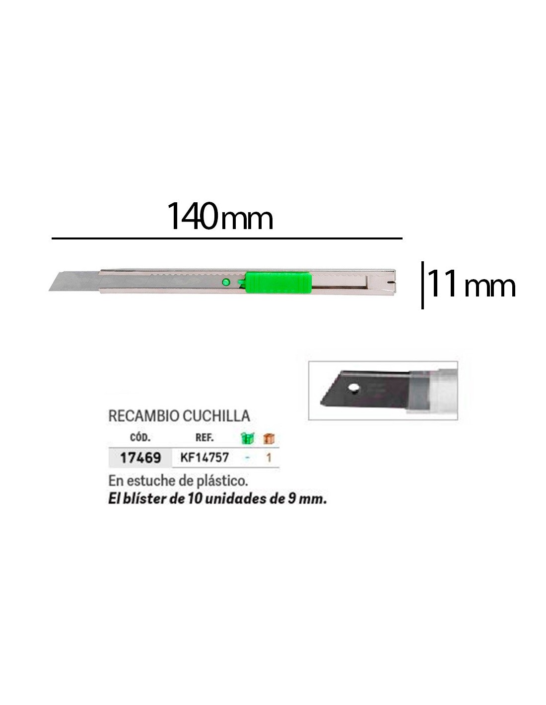 Retráctil. Cuchilla de acero precortado. Cuchilla de 9 mm de ancho. Longitud: 140 mm. El blíster de 1 unidad.
