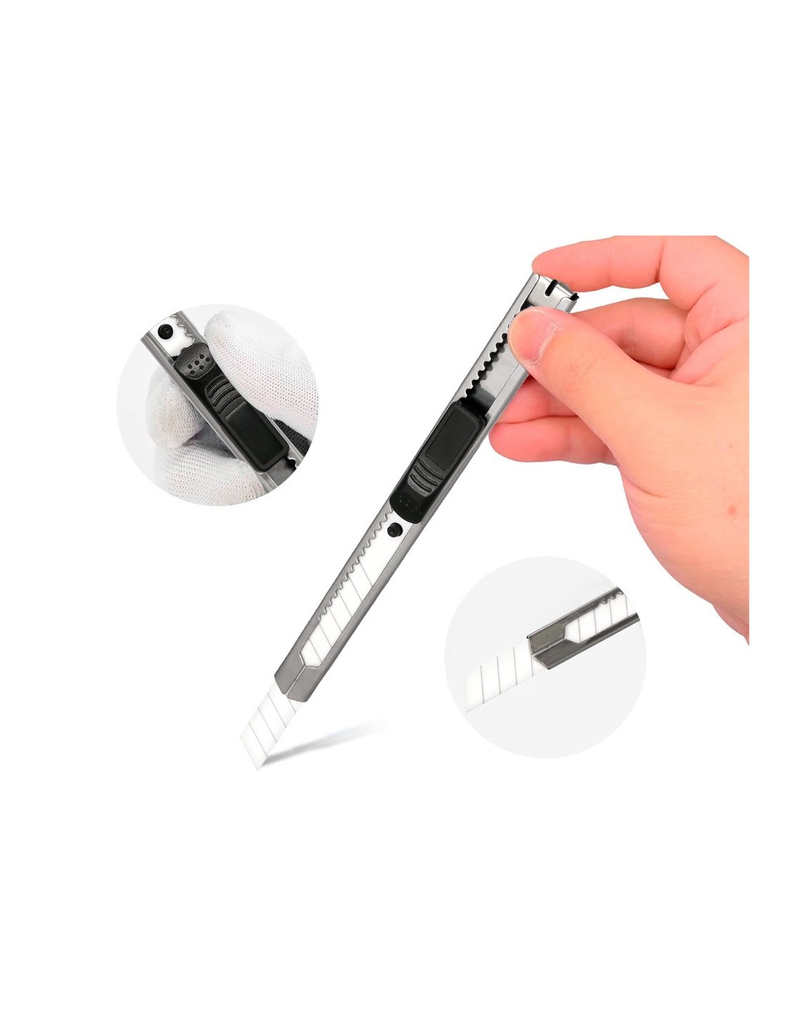 Con freno de seguridad, cuchilla de cerámica precortada. Cuchilla de 9 mm de ancho. Longitud: 122 mm.