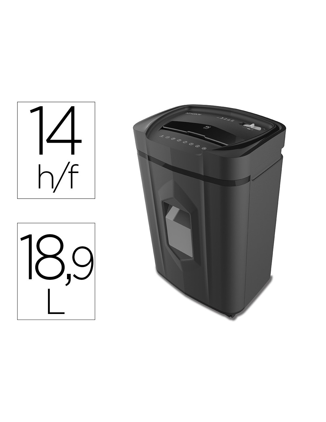 Destructora de uso frecuente. Capacidad de corte: 14 hojas. Corte en partículas de 4 x 25 mm. Nivel de seguridad P-4. Sistema antiatascos. Tapa de seguridad. Destruye clips, grapas, CD y tarjetas de crédito. Papelera de 18,9 litros. Medidas: 366 x 491 x 280 mm. Peso: 12,5 kg.