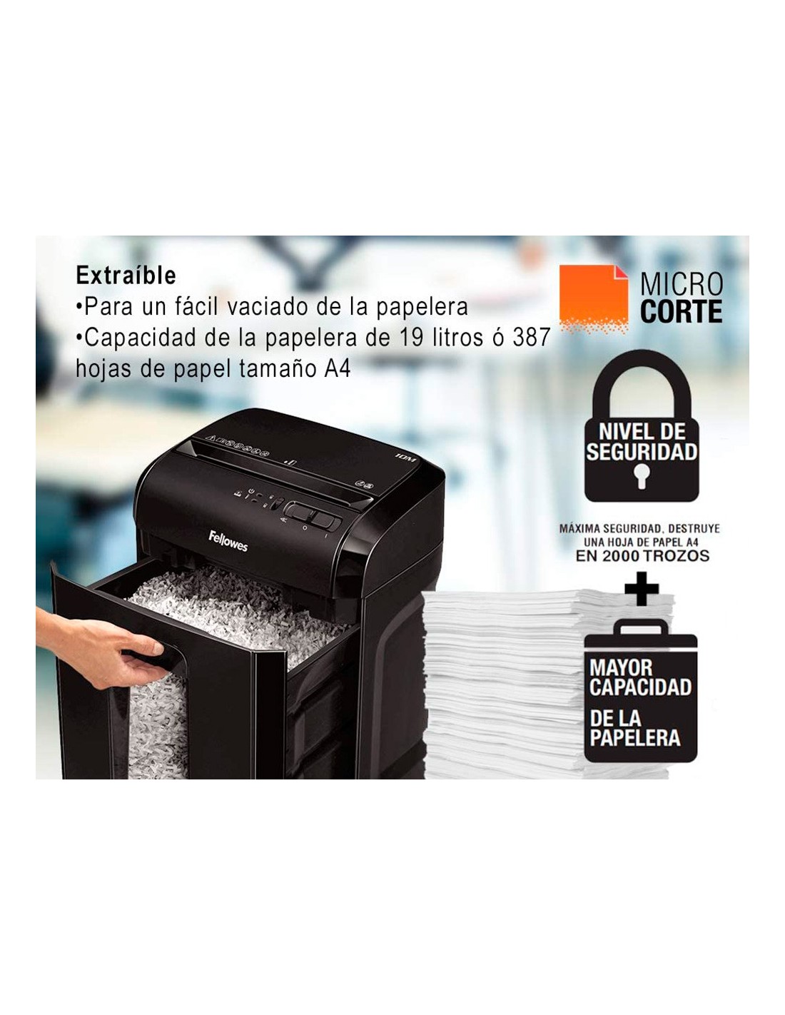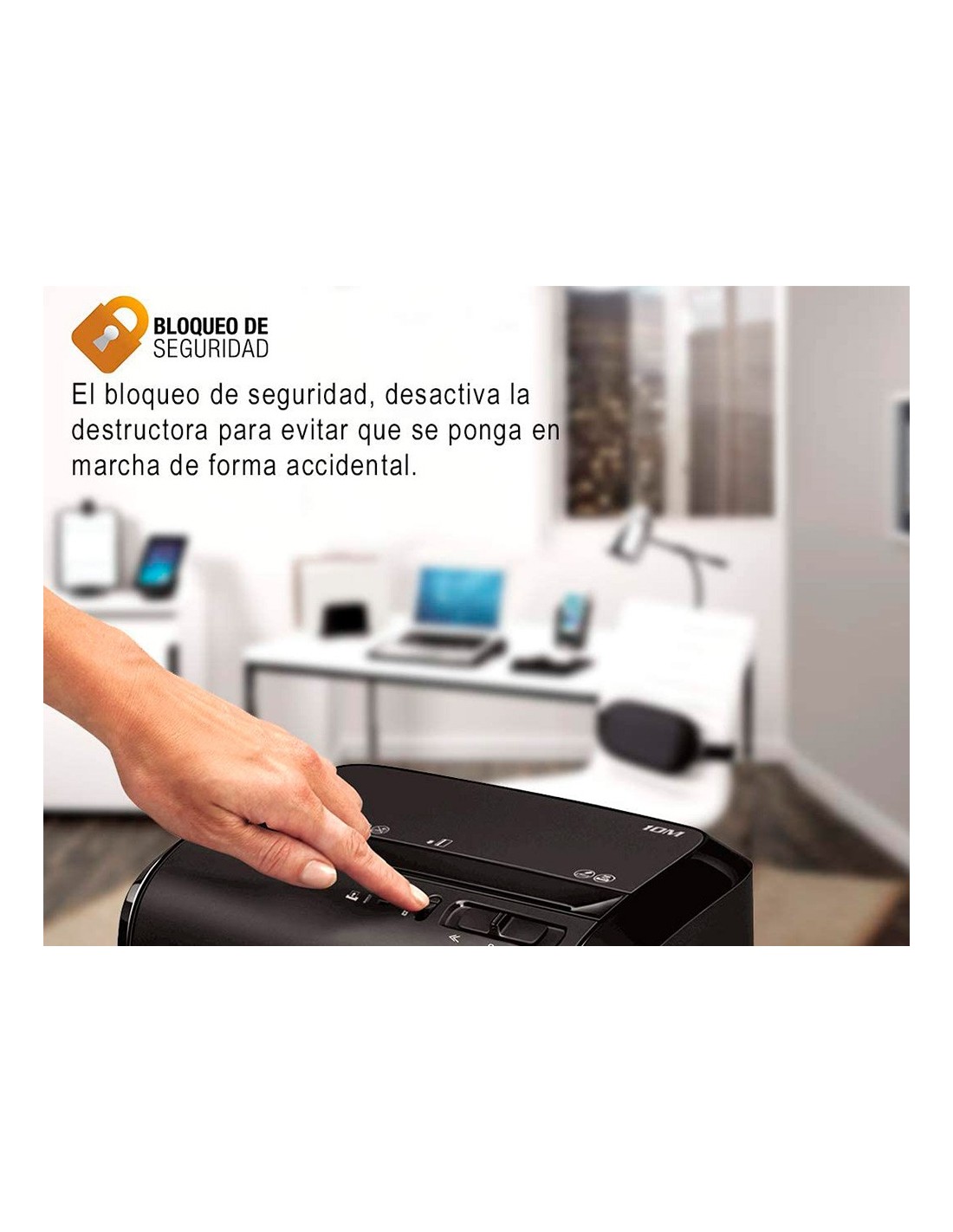 Destructora de microcorte que ofrece la máxima seguridad de destrucción. Destruye una hoja de papel en 2000 trozos. Capacidad de corte: hasta 10 hojas en partículas de 2 x 12 mm. Nivel de seguridad P-5. Destruye grapas y tarjetas de crédito. Ciclo de trabajo de 10 minutos. Bloqueo de seguridad para evitar accidentes. Papelera de 19 litros con ventanilla transparente. Medidas: 343 x 498 x 251 mm. Peso: 7,85 kg.