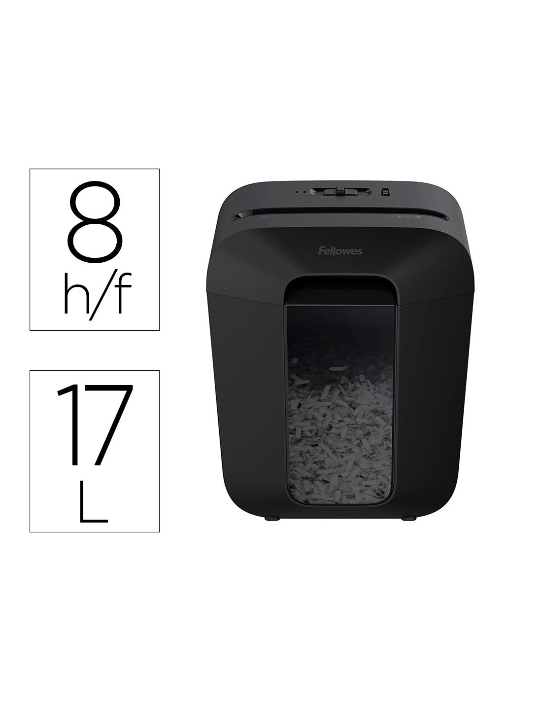 Capacidad de corte: 8 hojas. Corte en partículas de 4 x 37 mm. Nivel de seguridad P-4. Bloqueo de seguridad para evitar accidentes. Destruye de manera continua durante 6 minutos con un tiempo de enfriamiento de 20 minutos. Destruye grapas, clips y tarjetas de crédito. Papelera con capacidad para 17 litros. Medidas: 401 x 310 x 220 mm. Peso: 4,1 kg.