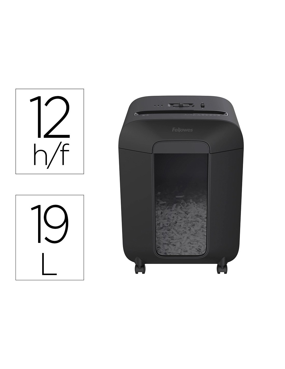Capacidad de corte: 12 hojas en partículas de 4 x 40 mm. Nivel de seguridad P-4. Destruye de manera continua durante 20 minutos, ideal para destruir grandes volúmenes de papel. Cuenta con Tecnología SafeSense de desconexión automática cuando la mano toca la boca de entrada. Esta destructora de papel de Fellowes también destruye grapas, clips y tarjetas de crédito. Su papelera tiene una capacidad de 19 litros. Medidas: 246 x 341 x 469 mm. Peso: 6,6 kg.