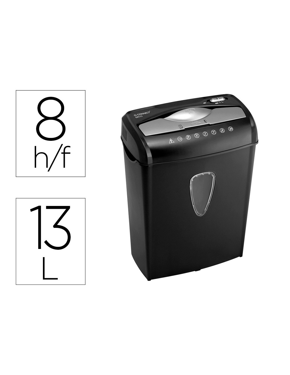 Capacidad de corte: 8 hojas. Corte en partículas de 5,6 x 47 mm. Nivel de seguridad P-3. Ancho de entrada: 220 mm. Arranque y parada automáticos. Marcha atrás para eliminar atascos. Protección contra sobrecalentamiento. Destruye grapas, clips, tarjetas de crédito. Con sistema ShredSafe. Papelera de 13 litros con ventana. Medidas: 306 x 425 x 171 mm. Peso: 4,17 kg.