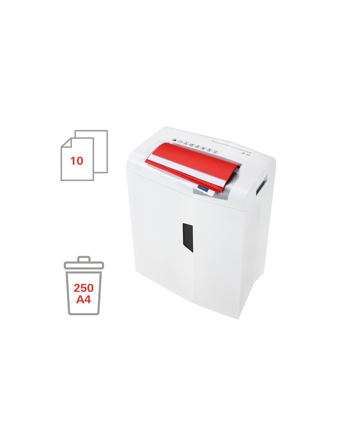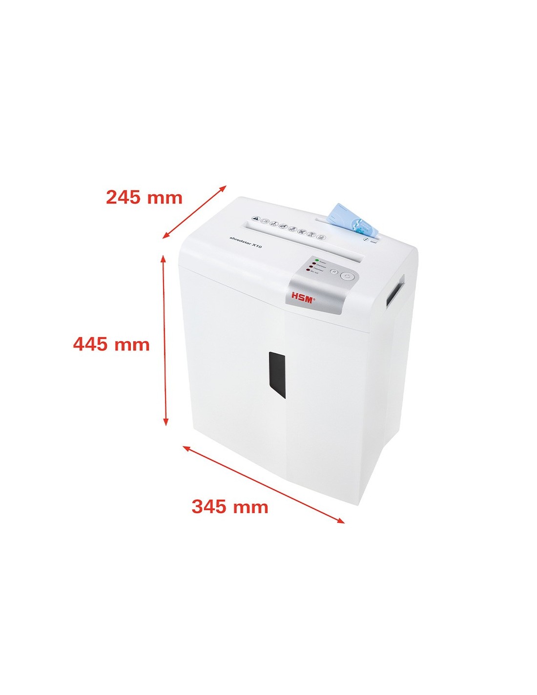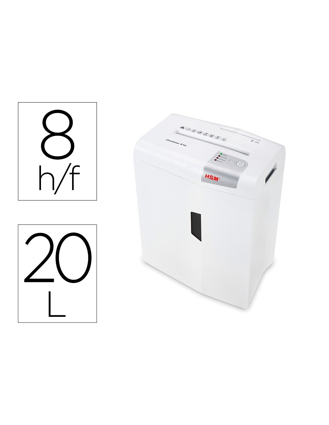 Protección de datos profesional y silencioso en el lugar de trabajo. Capacidad de corte: 10 hojas en partículas de 4,5 x 30 mm. Nivel de seguridad P-4. Destruye grapas, CD, clips y tarjetas de crédito. Mecanismo de corte independiente para CD. Indicador LED y de nivel. Inicio/paro automático con célula fotoeléctrica. Vaciado fácil. Ancho de entrada: 220 mm. Papelera de 20 litros. Medidas: 345 x 445 x 245 mm. Peso: 6 kg.