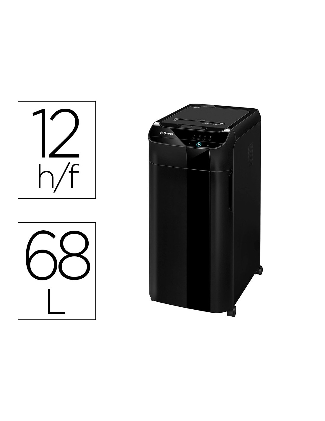 Destructora automática de ciclo continuo para uso de más de 5 usuarios. Capacidad de corte: hasta 350 hojas en partículas de 4 x 38 mm. Sistema antiatascos total Auto Reverse. Sistema de bloqueo con PIN de 4 dígitos. Entrada adicional de 230 mm para destruir manualmente pequeñas cantidades de papel (hasta 12 hojas). Admite casi todo tipo de papel (arrugado, impreso por 1 o ambas caras, papel Glossy, papel continuo, etc.). Sistema automáticode reposo. Destruye clips, grapas, tarjetas de crédito y CD. Papelera ext raíble de 68 litros de capacidad. Medidas: 390x578x813 mm. Peso: 31,8 KG.