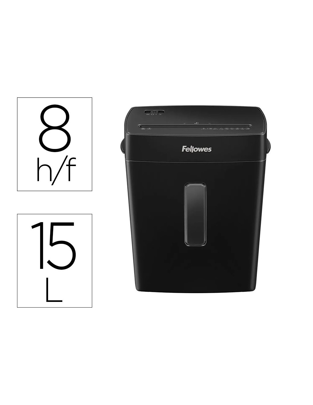 Destructora de uso personal. Destruye hasta 8 hojas en particulas de 4x34 mm. Nivel de seguridad P-4. Bloqueo de seguridad para evitar posibles accidentes. Ciclo de trabajo 5 minutos. Destruye grapas y tarjetas de crédito.Papelera de 15 litros de capacidad con cabezal fácilmente extraible. Medi das 298x198x376 mm. Peso: 3,9 kg.