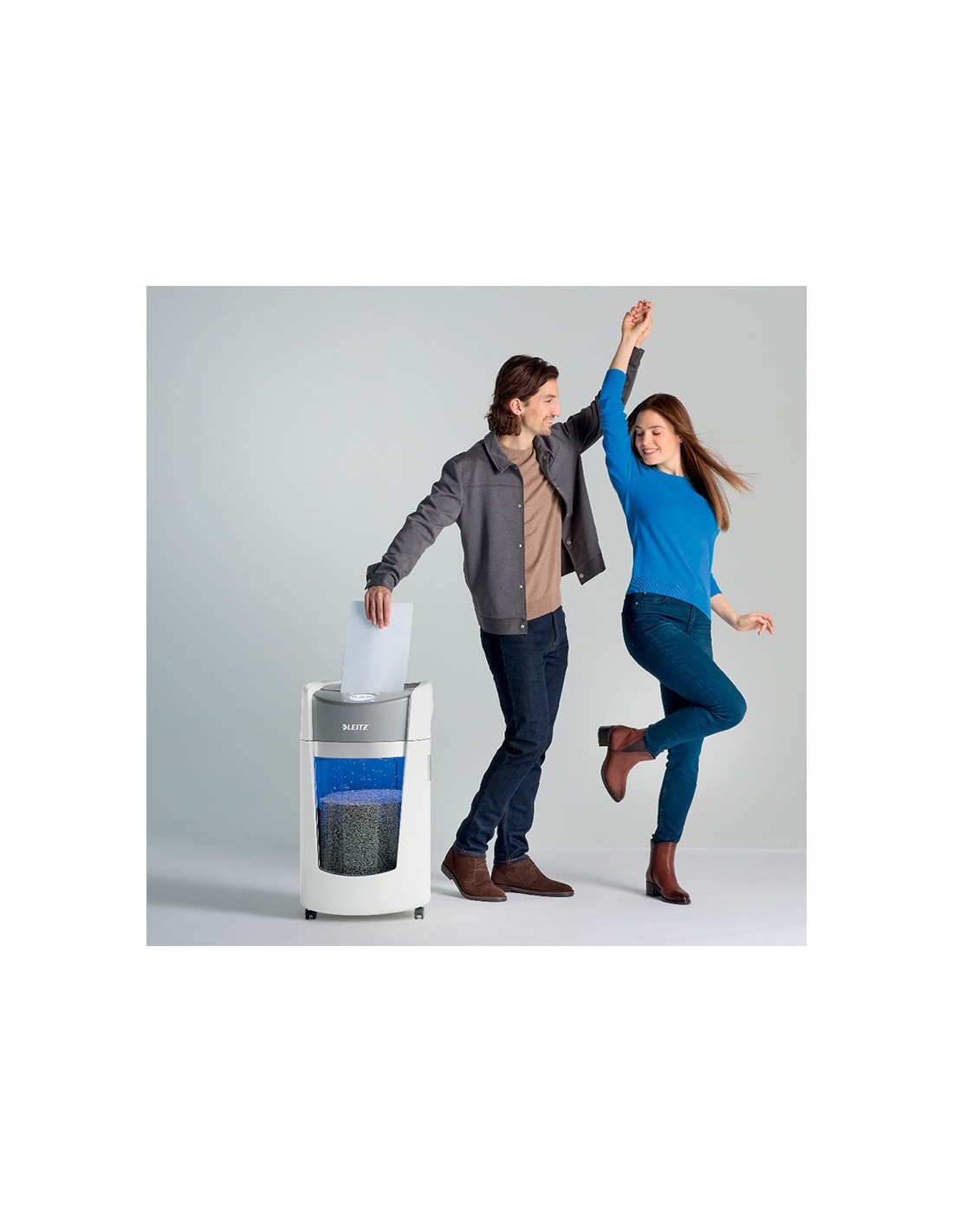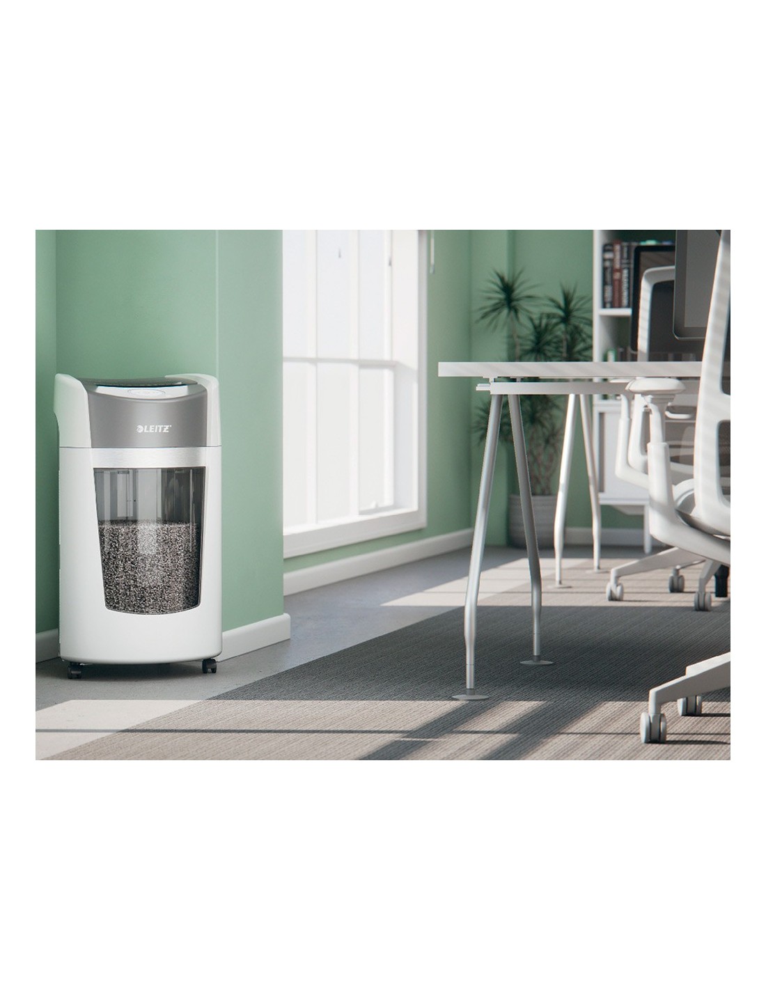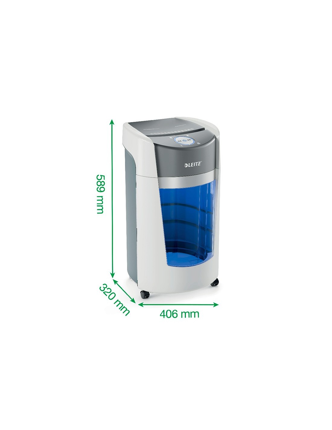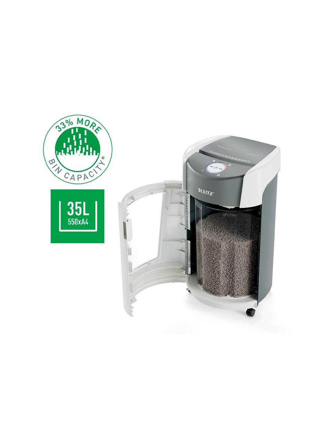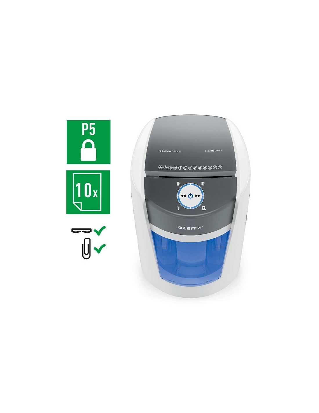 La destructora de documentos Leitz IQ OptiMax Office ofrece una solución de destrucción innovadora y elegante, al tiempo que garantiza una seguridady tranquilidad excepcionales. Esta destructora de papel DIN P5 de alta se guridad tritura sin esfuerzo hasta 10 hojas A4 a la vez en microcortes. LaIQ OptiMax incorpora la exclusiva tecnología de giro de papelera (BRT), q ue maximiza la capacidad en un +33%. La papelera giratoria garantiza una distribución plana y uniforme del papel para evitar que los trozos de papelformen un pico en la papelera, lo que permite triturar 140 hojas A4 adici onales antes de tener que vaciarla. BRT significa que no hay necesidad de sacar o agitar la papelera, el indicador de papelera llena solo se activa va cuando alcanza el 100% de su capacidad. La generosa papelera de 35 litros tiene capacidad para 550 hojas A4 y se ilumina en azul durante su uso para ofrecer la mejor experiencia de destrucción. La intuitiva pantalla LEDincluye indicaciones de advertencia en