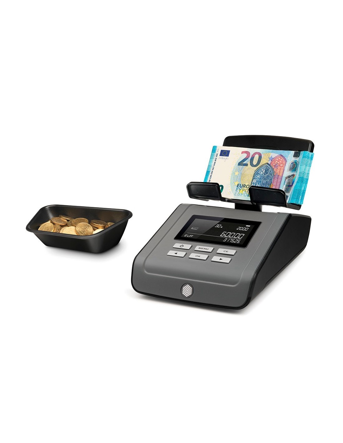 Cuenta monedas, billetes, cartuchos de monedas y billetes en fajos. 13 divisas preinstaladas: EUR, USD, GBP, HF, PLN, HUF, SEK, NOK, DKK, BGN, CZK, RON, AUD. Cuenta una caja registradora en menos de 2 minutos. Reloj de tiempo real. Tamaño compacto, ideal para oficinas o tiendas minoristas. Funcionamiento silencioso. Función de agregar automáticamente: agrega automáticamente los billetes y monedas contados al total después de retirar los billetes o monedas de la plataforma. Función de pasar a la siguiente denominación después de retirar los billetes o monedas de la plataforma. Calibración automática continua de la balanza. Actualizaciones de divisas gratuitas. Medidas: 223 x 142 x 147 mm. Peso: 0,66 kg.
