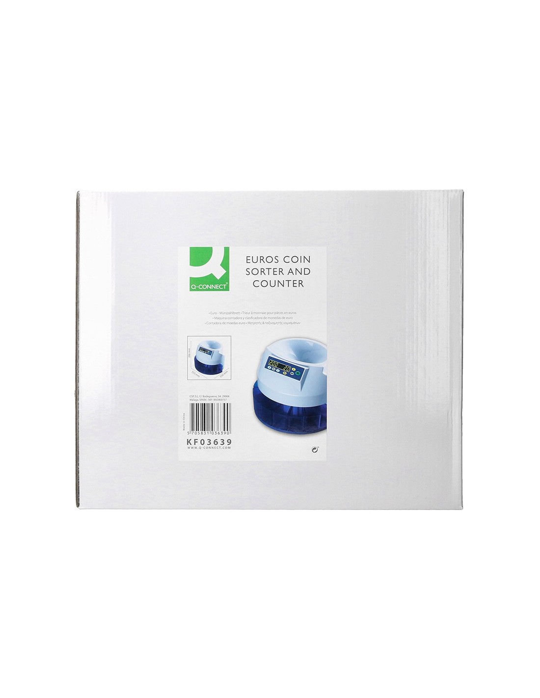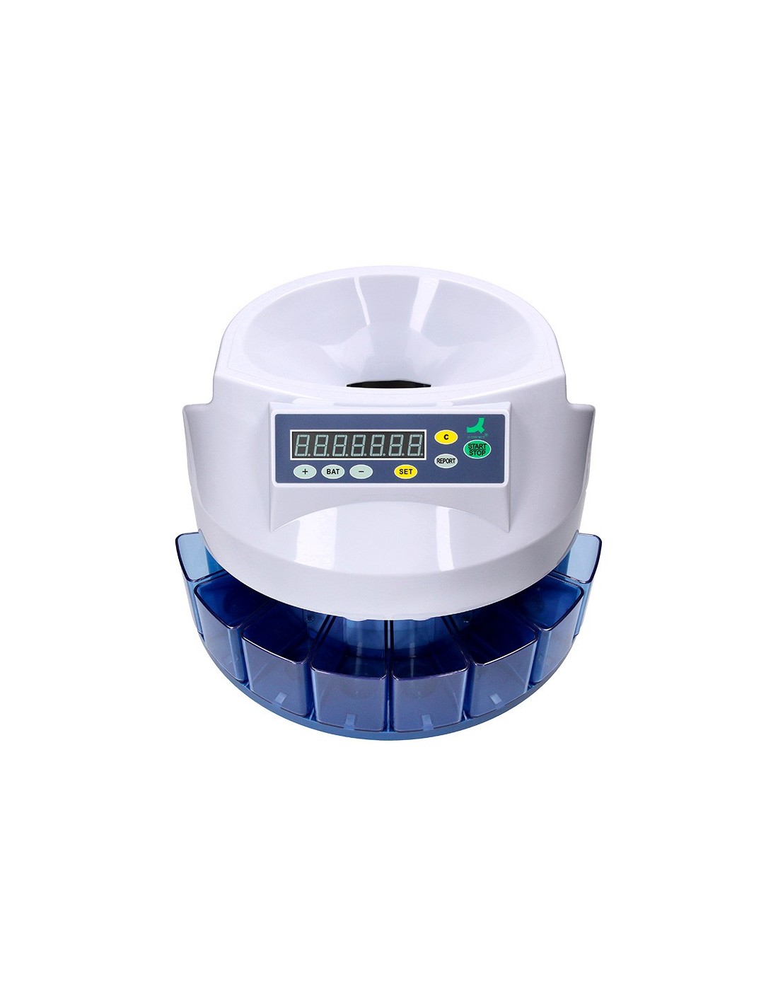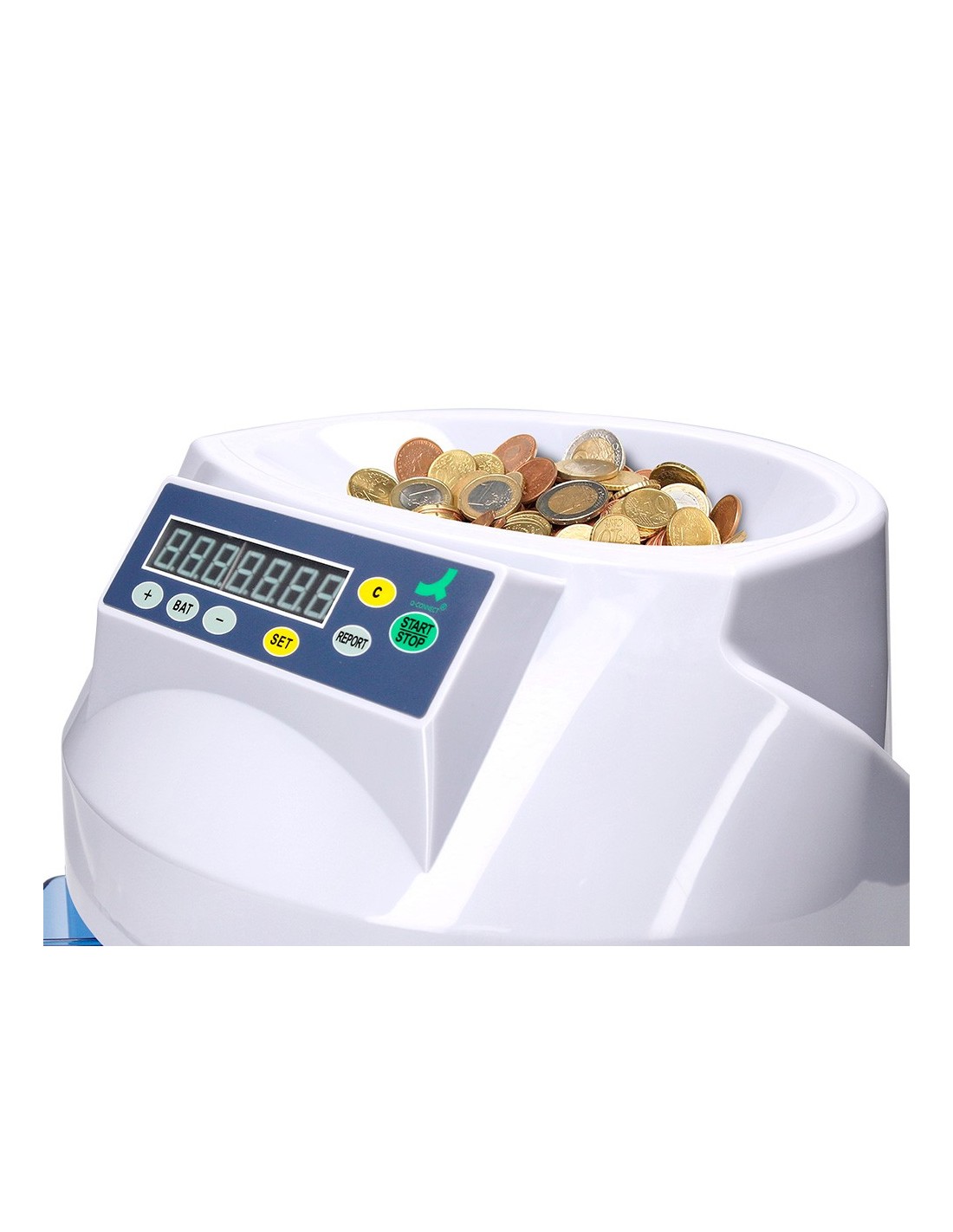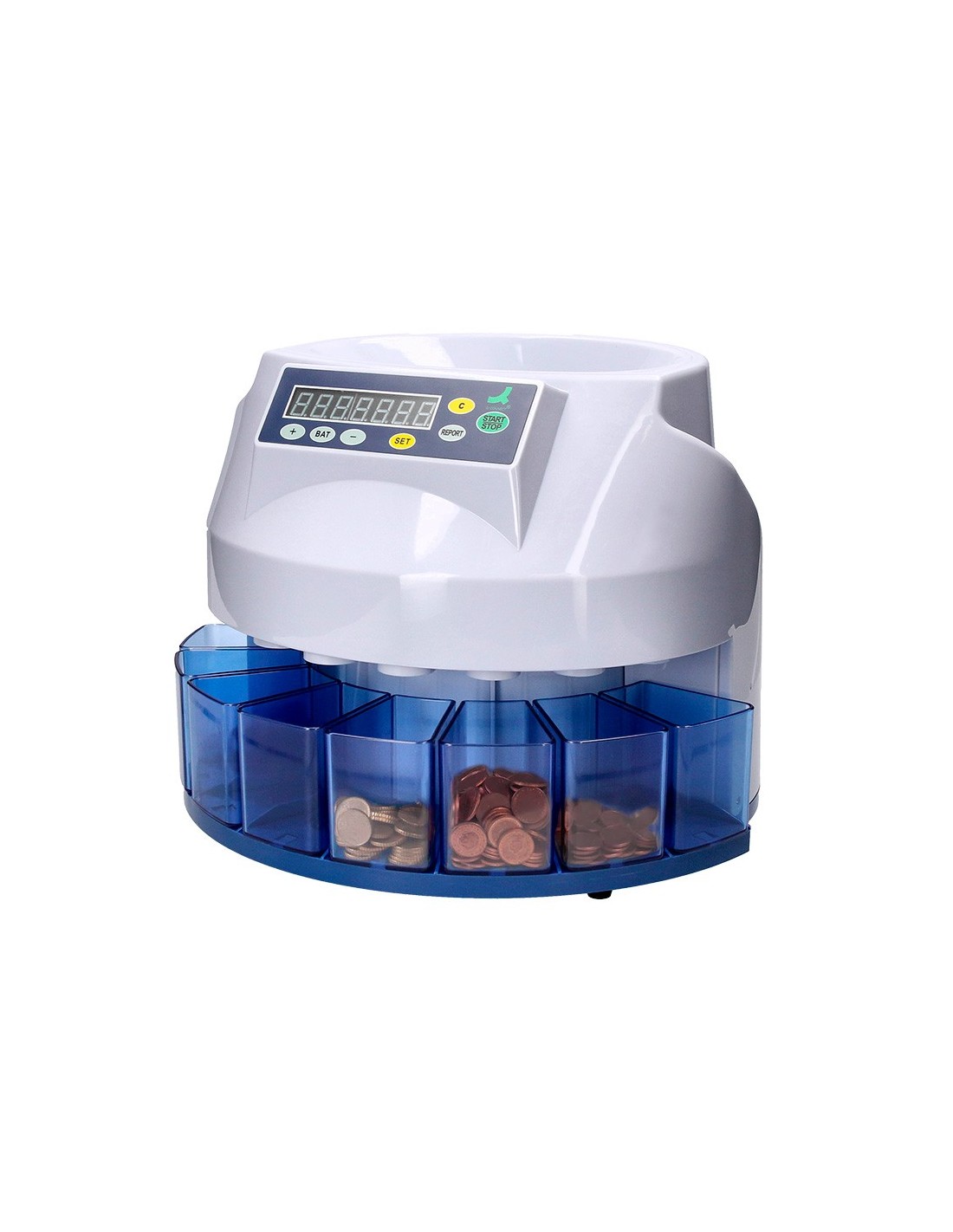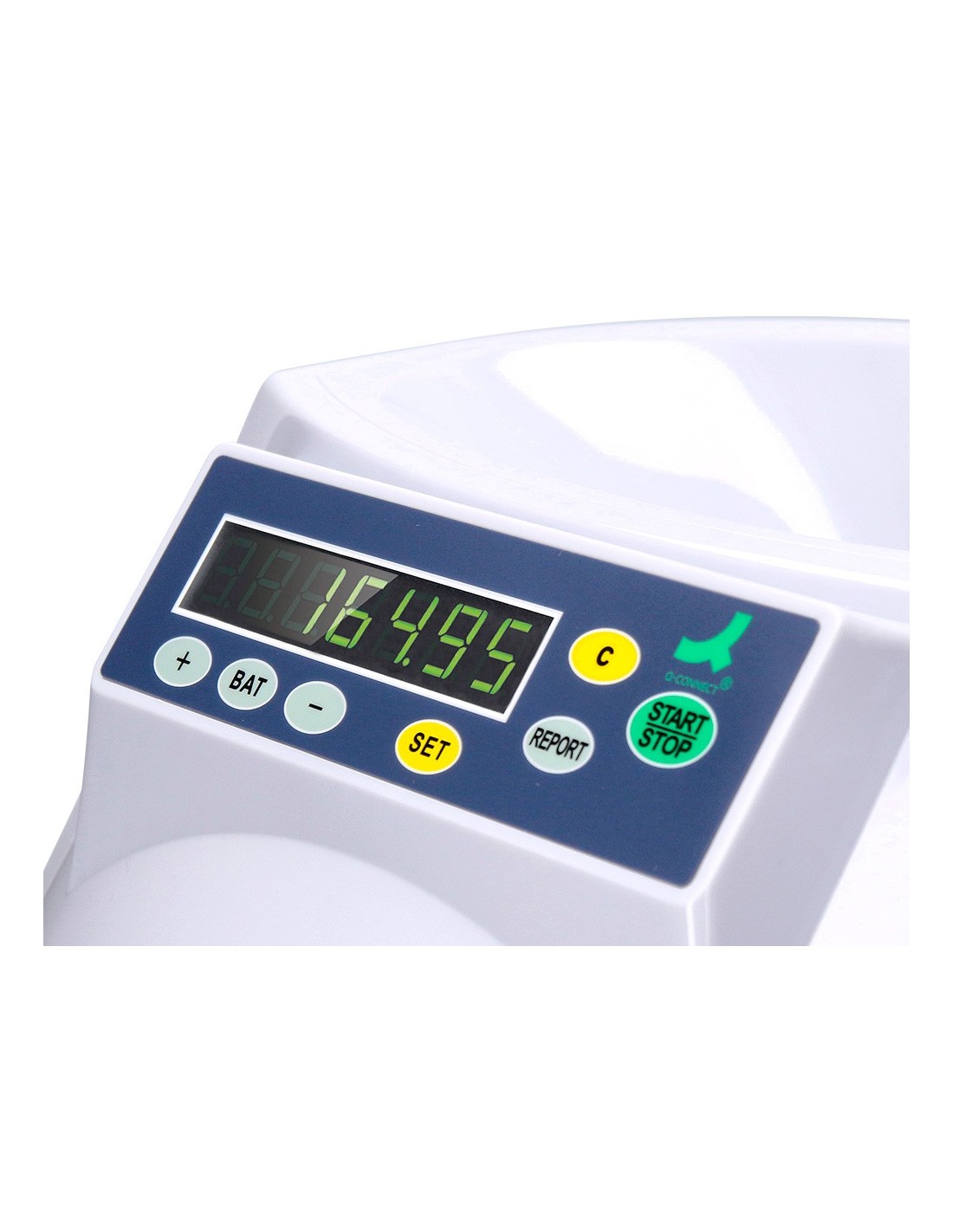 Dos modalidades de conteo. Libre: cuenta todas las monedas que están en la bandeja de entrada sin parar, hasta que una de las bandejas de salida esté llena. Con este modo la máquina predetermina por sí sola el número de lote. Conteo por lote: cuenta el lote de monedas del mismo valor que se ha predeterminado previamente. El resultado que da el contador es la cantidad de monedas y el valor que suponen. Velocidad de conteo: 216 uds./minuto. Capacidad de la bandeja de entrada: 300 - 500 uds. Capacidad de la bandeja de salida: 80-150 uds. Lote en pantalla: 3 dígitos LED. Número de conteo en pantalla: 4 dígitos LED. Medidas: 355 x 266 x 330 mm. Peso neto: 4,5 kg.