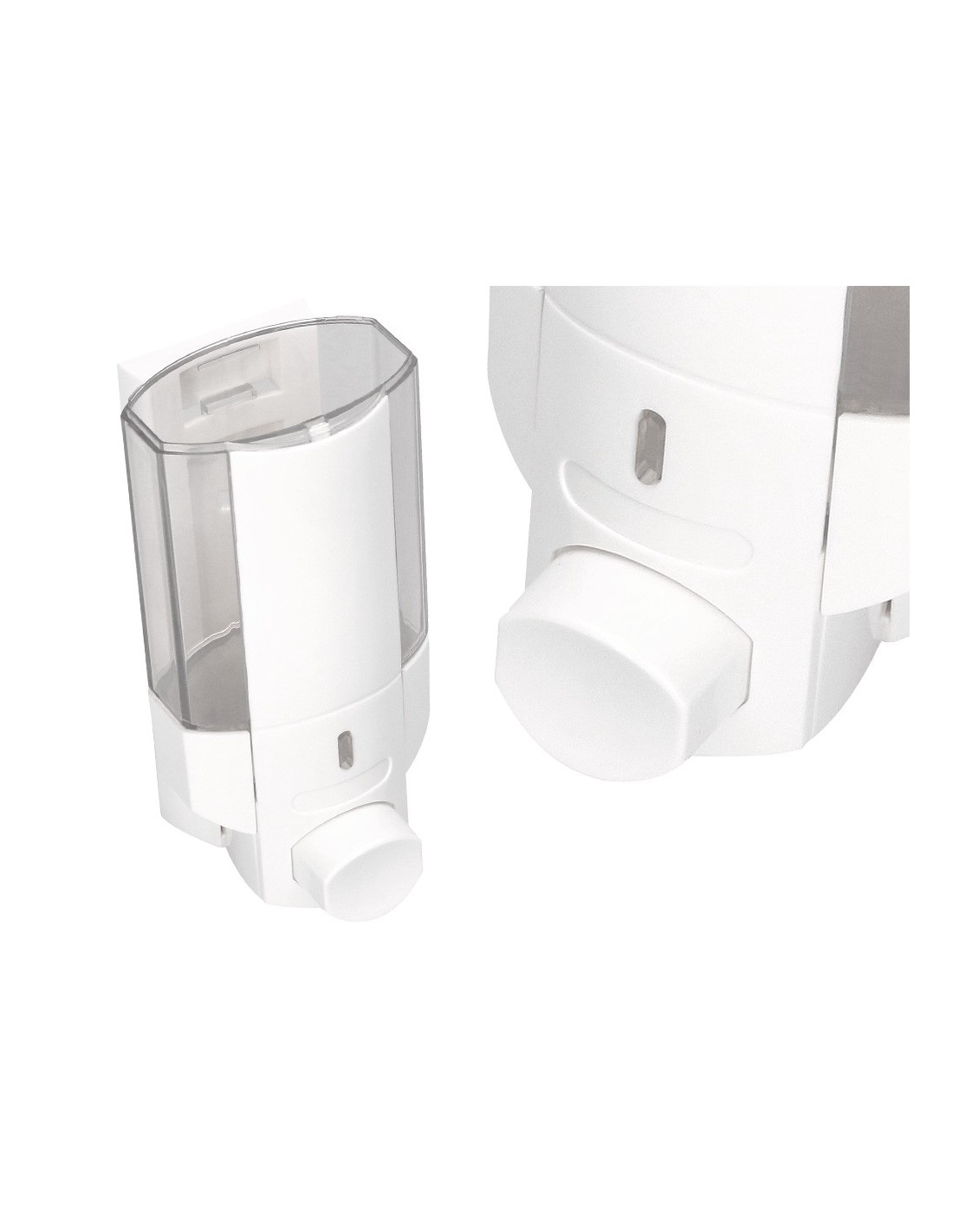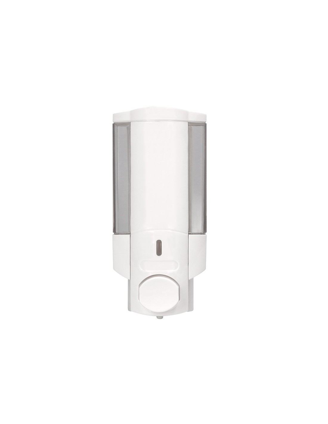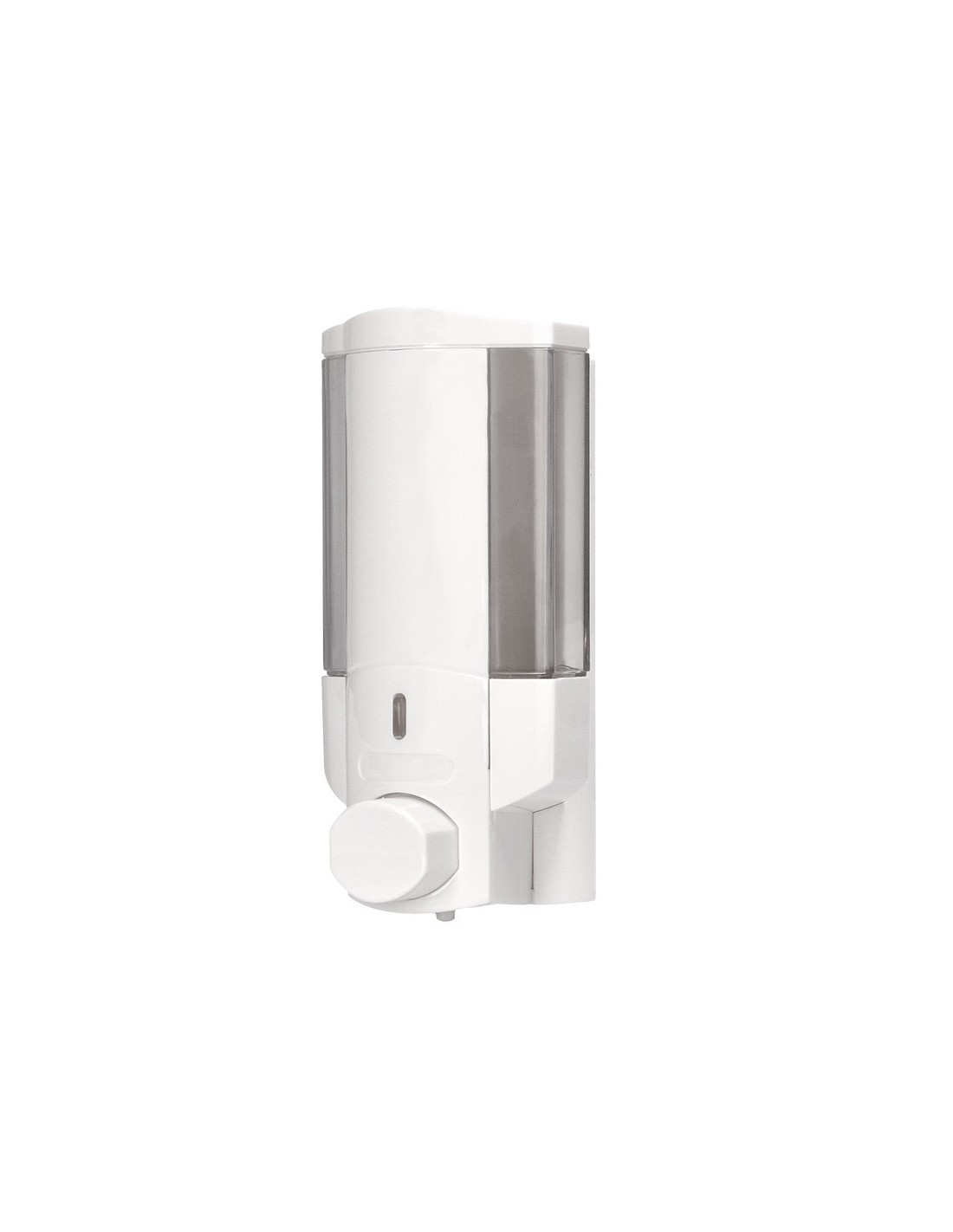 Dispensador manual, con visor azul transparente que permite ver el nivel de jabón. Color blanco. Capacidad: 350 ml. Medidas: 80 x 90 x 190 mm.