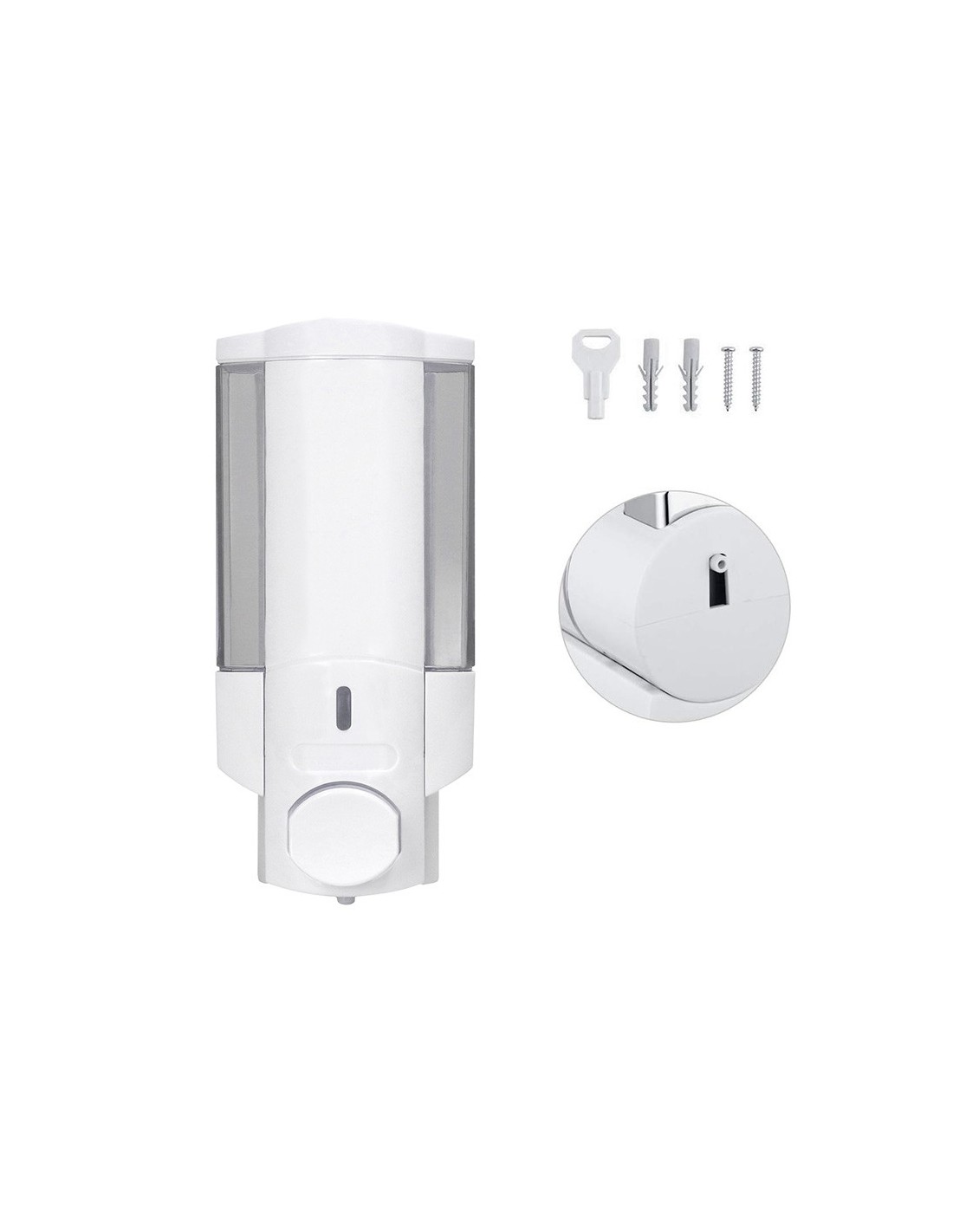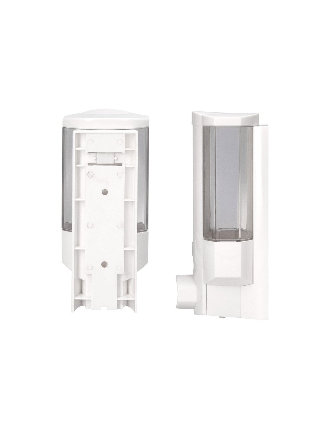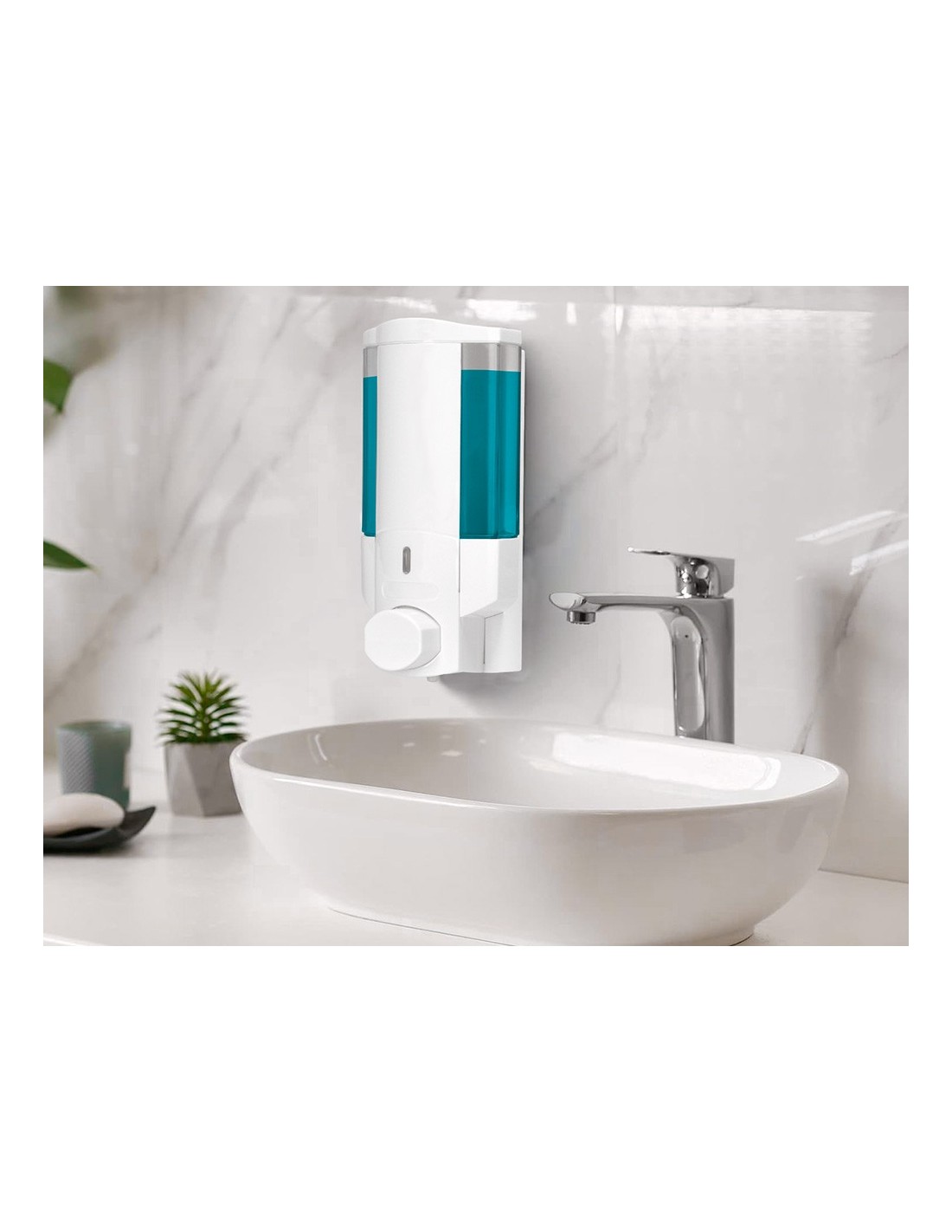 Dispensador manual, con visor azul transparente que permite ver el nivel de jabón. Color blanco. Capacidad: 350 ml. Medidas: 80 x 90 x 190 mm.