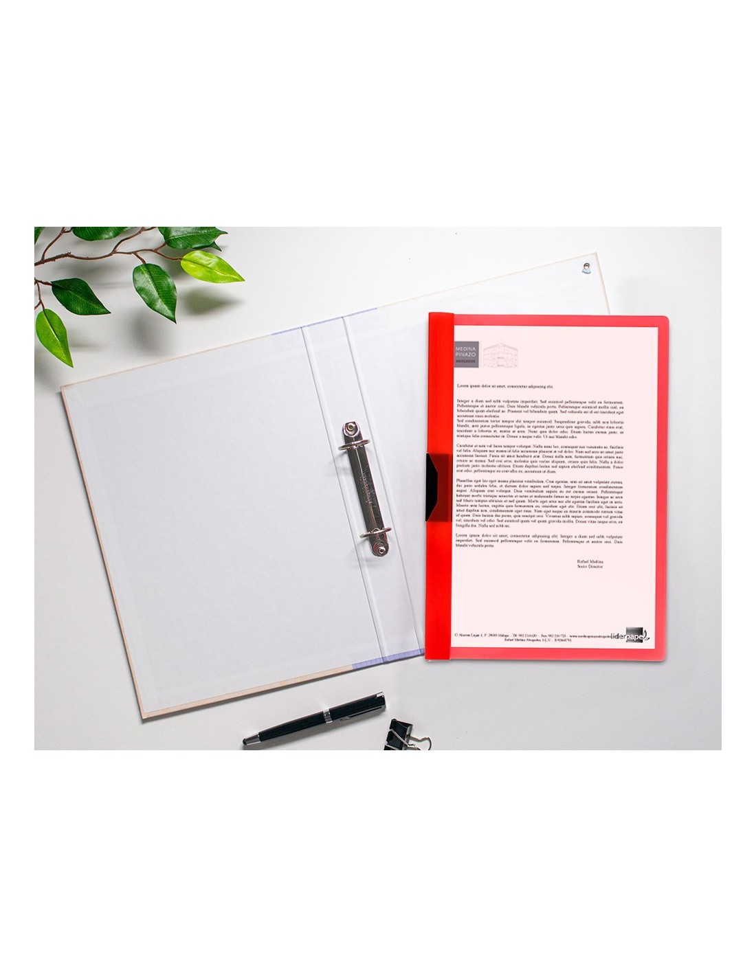 Fabricada en polipropileno. Pinza deslizante central. Portada transparente de 180 micras y contraportada opaca. 400 micras. Formato DIN A4.