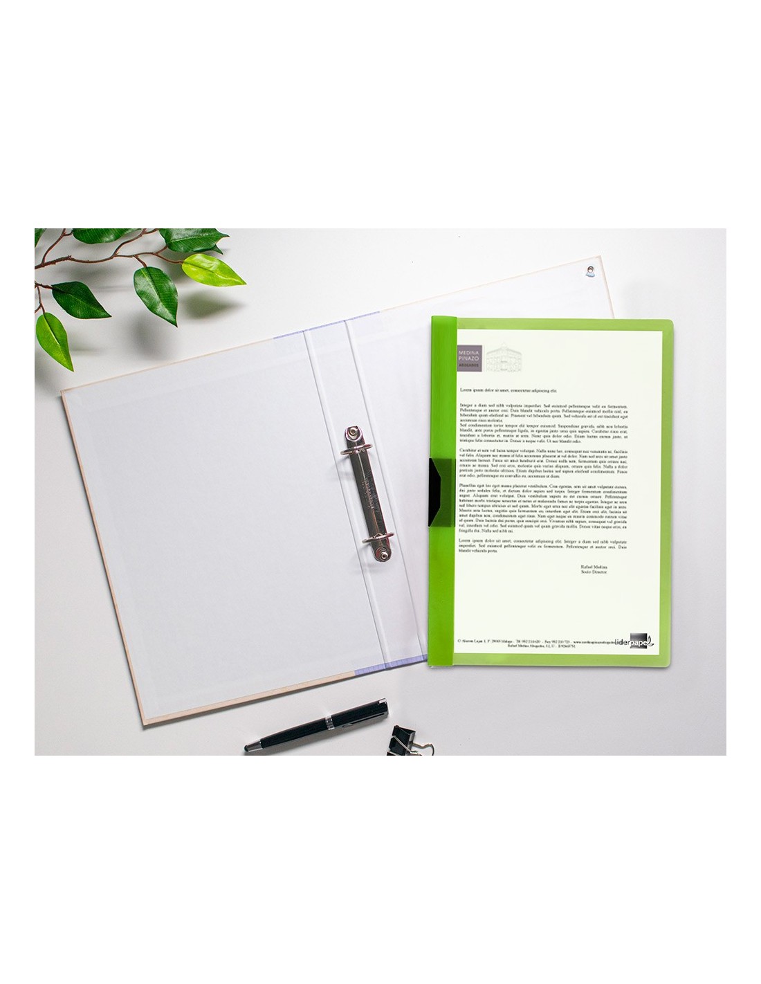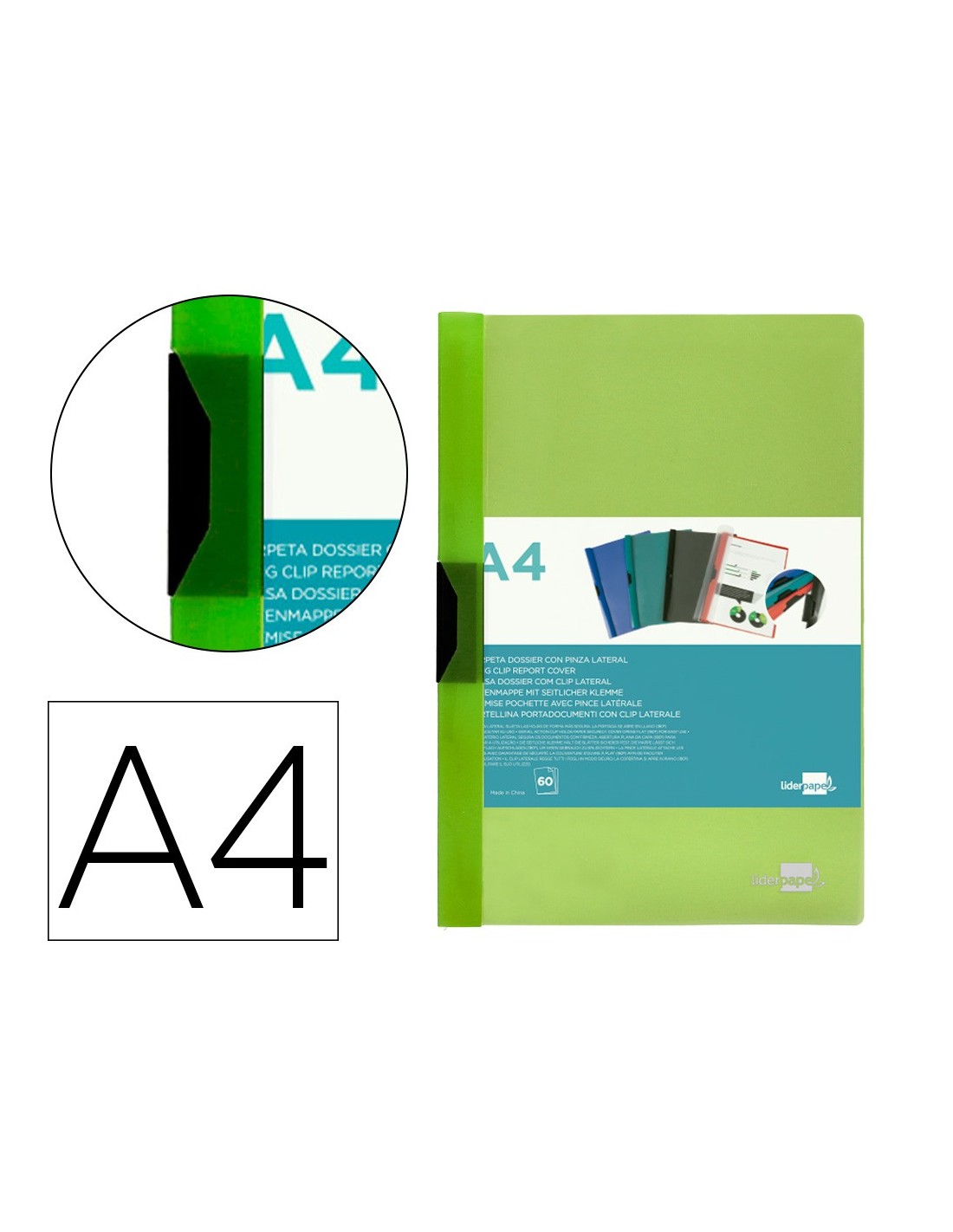 Fabricada en polipropileno. Pinza deslizante central. Portada transparente de 180 micras y contraportada opaca. 400 micras. Formato DIN A4.