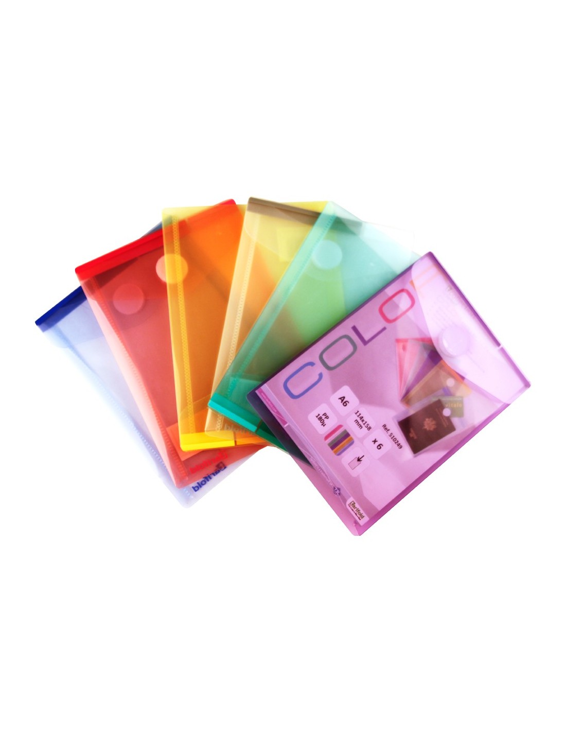 Expositor de sobremesa compuesto por 60 sobres plásticos formato DIN A6 vertical, con práctico cierre mediante solapa y velcro. Contiene 6 colores traslúcidos y surtidos (transparente, azul, rosa, amarillo, verde y violeta). Perfectos para guardar tarjeta bono transporte, DNI, pasaporte, tickets, etc. Fabricados en plástico polipropileno 100% reciclable de 200 micras. Liso y brillante. Colores surtidos. La caja de 60 unidades.
