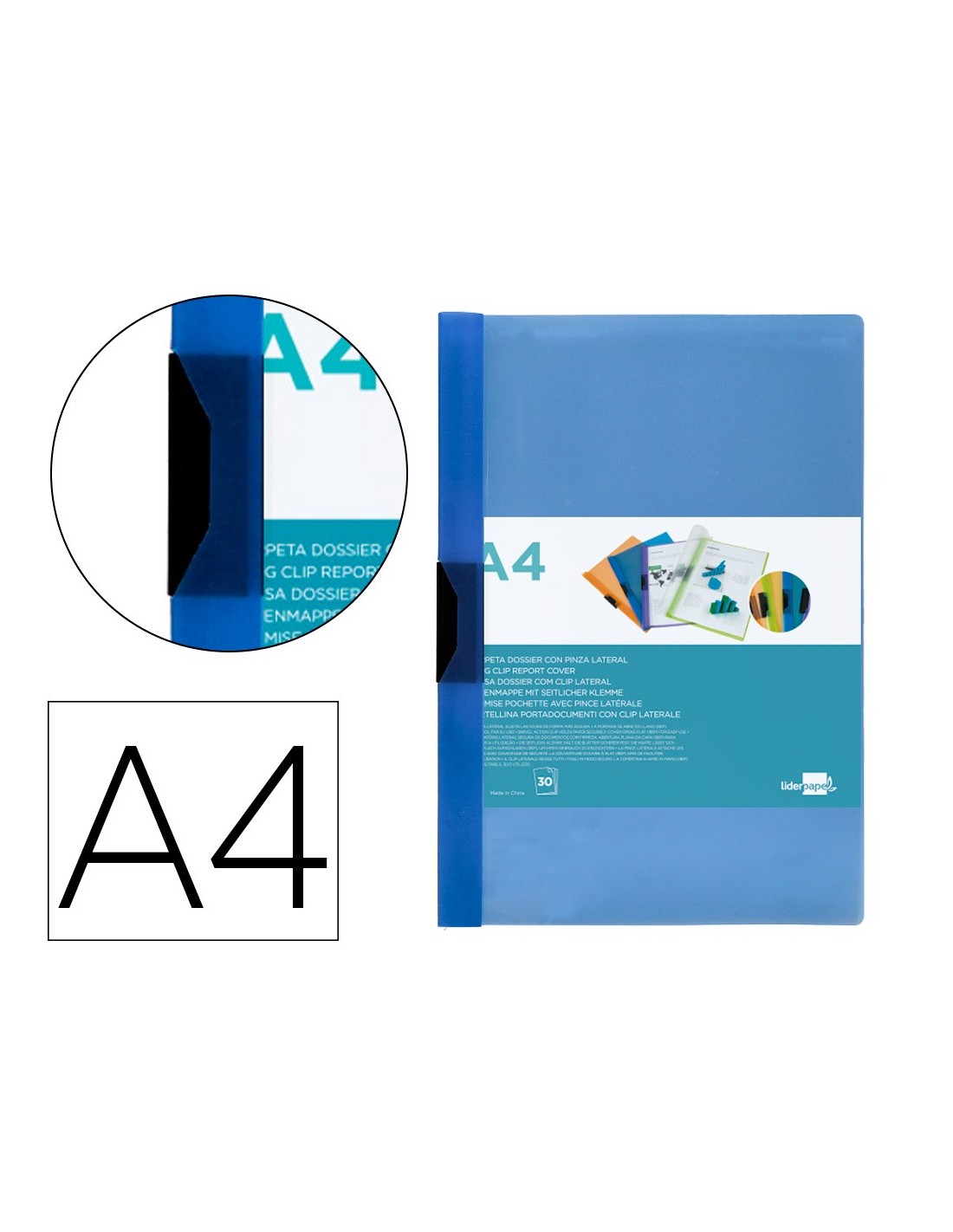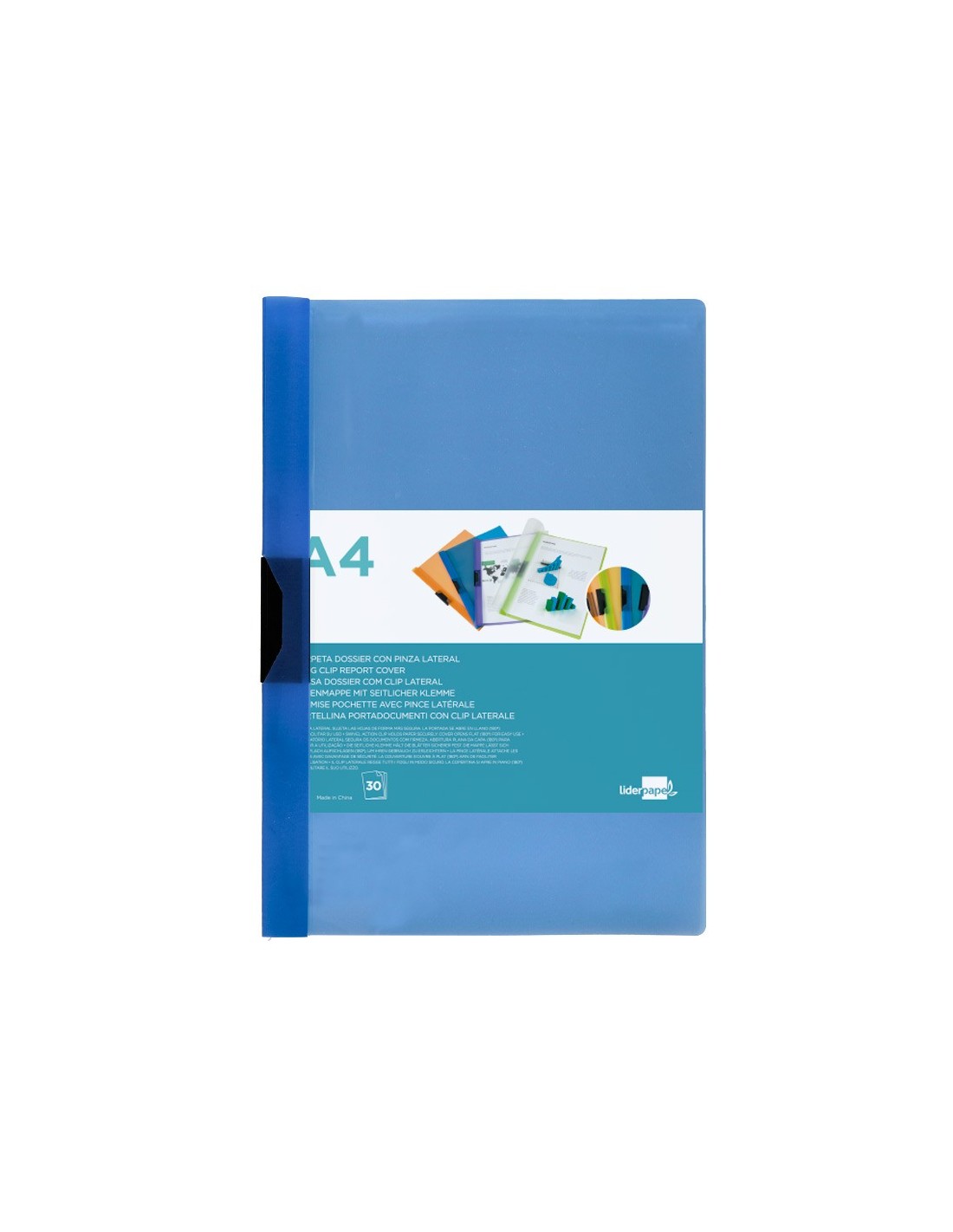 Fabricada en polipropileno. Pinza deslizante central. Portada transparente de 180 micras y contraportada opaca. 400 micras. Formato DIN A4.