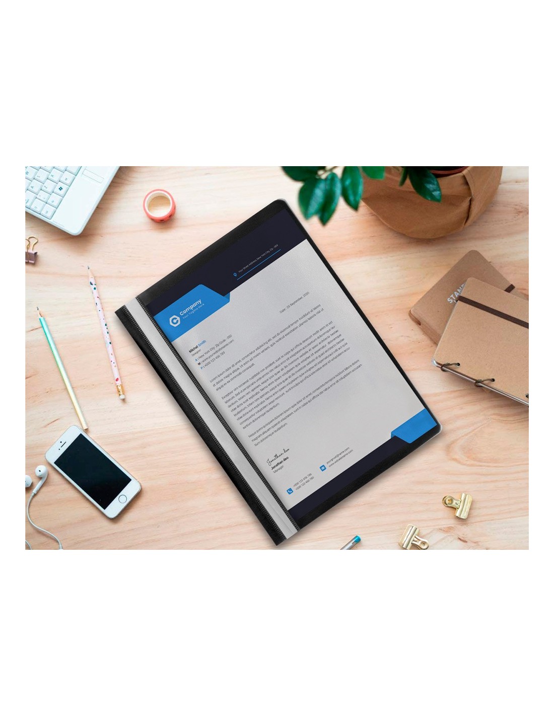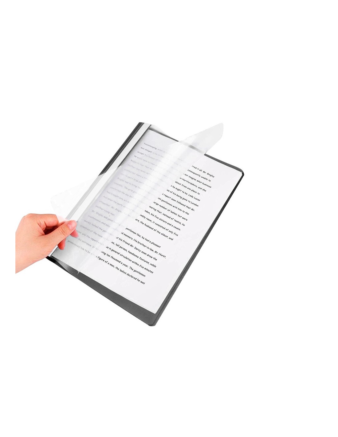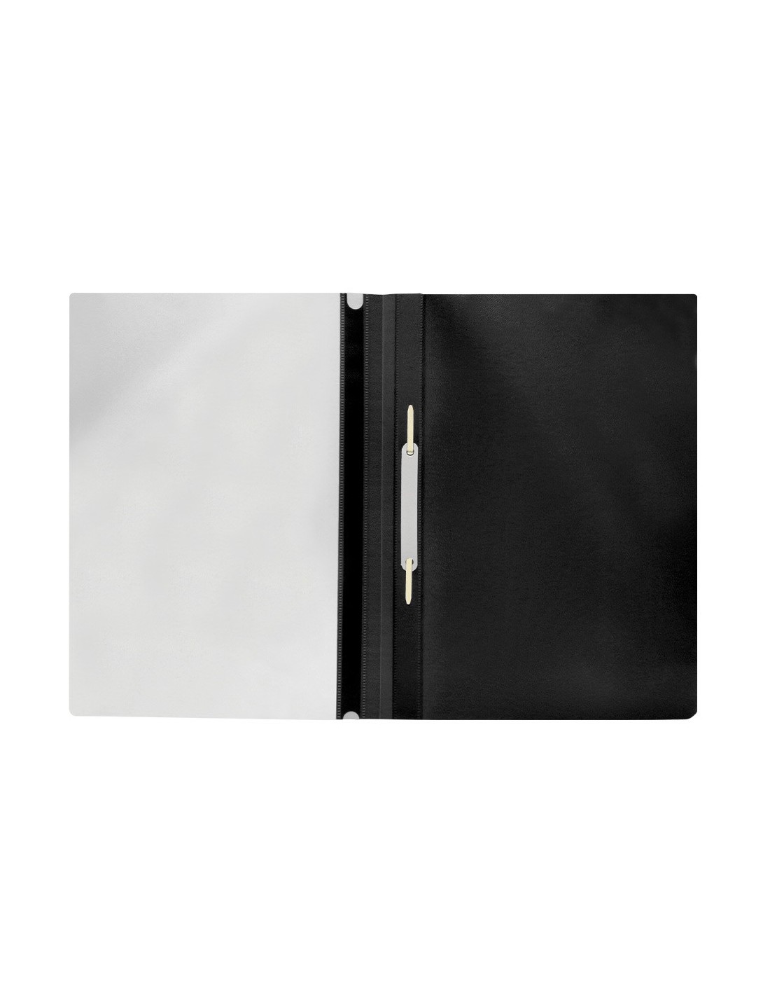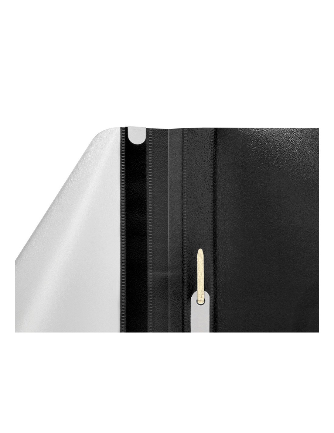 Fabricada en PVC, con fástener metálico, cubierta transparente y trasera opaca. Ventana con tira de papel en el lomo para personalizar el trabajo. Formato DIN A4. Tapa de 110 micras. Contratapa de 180 micras.