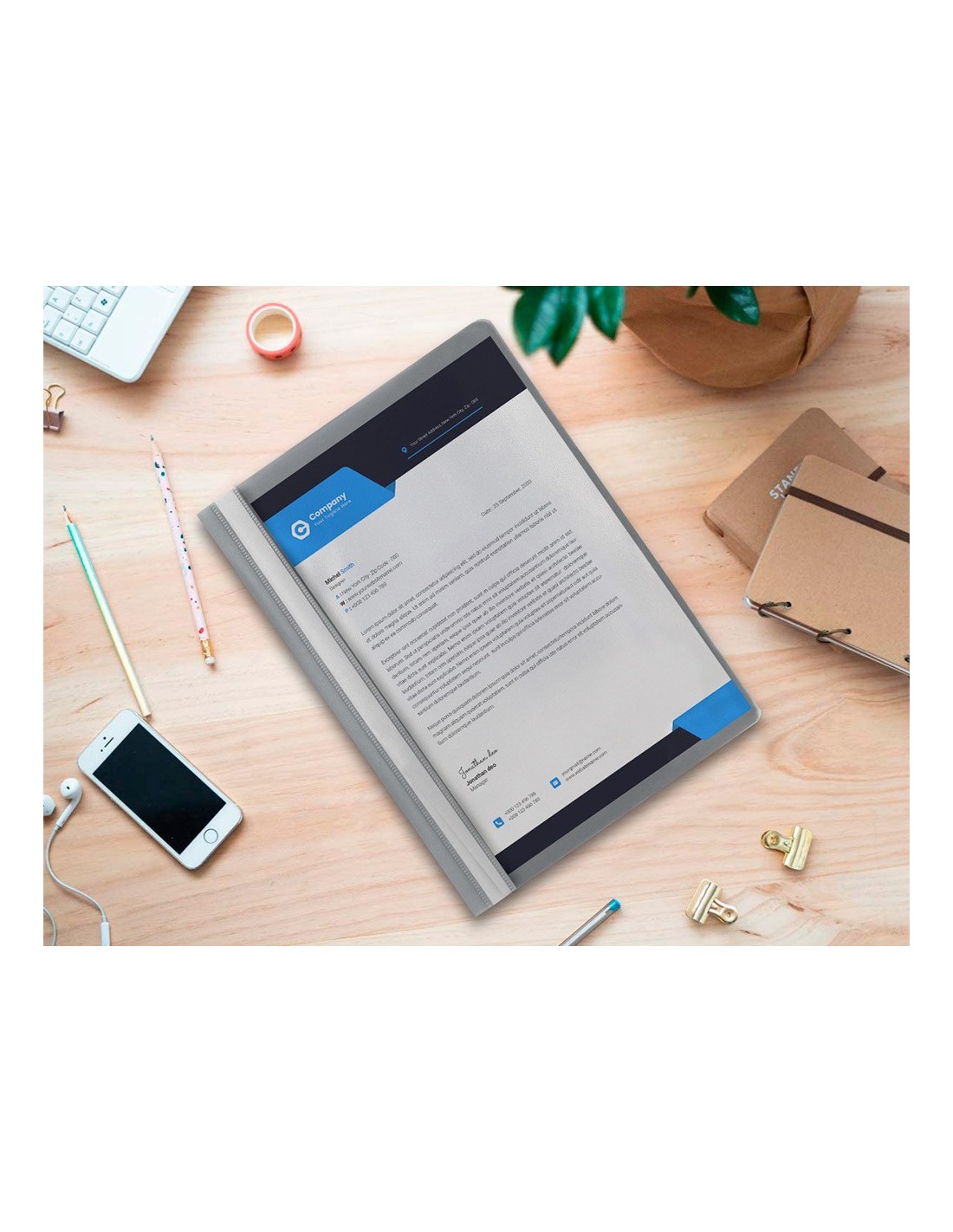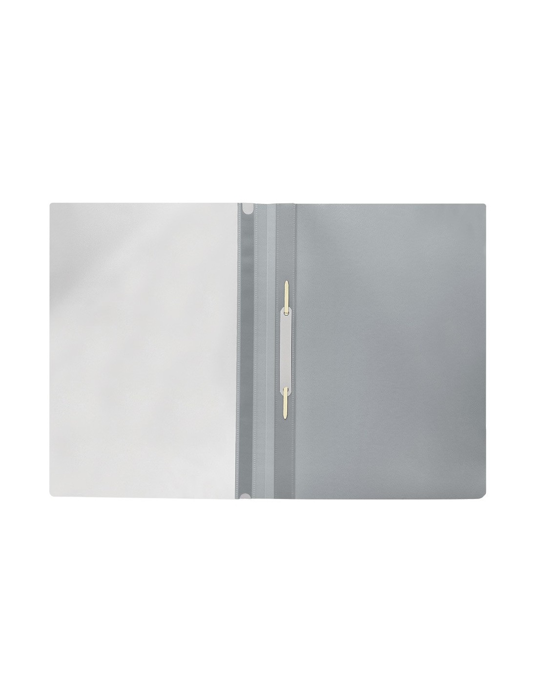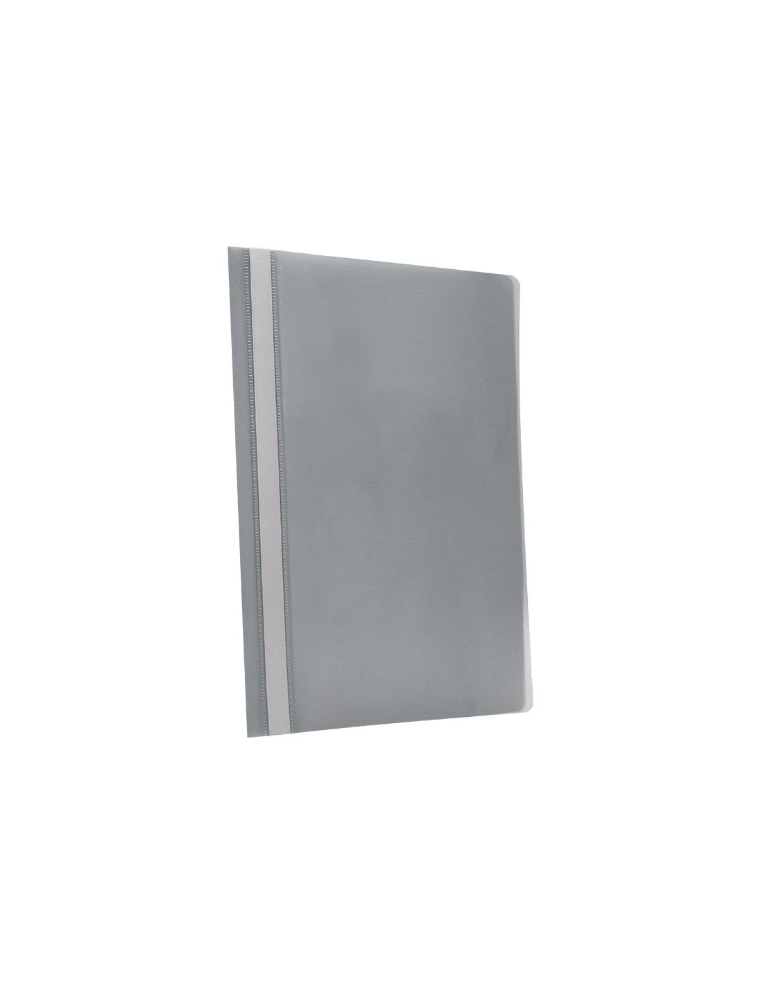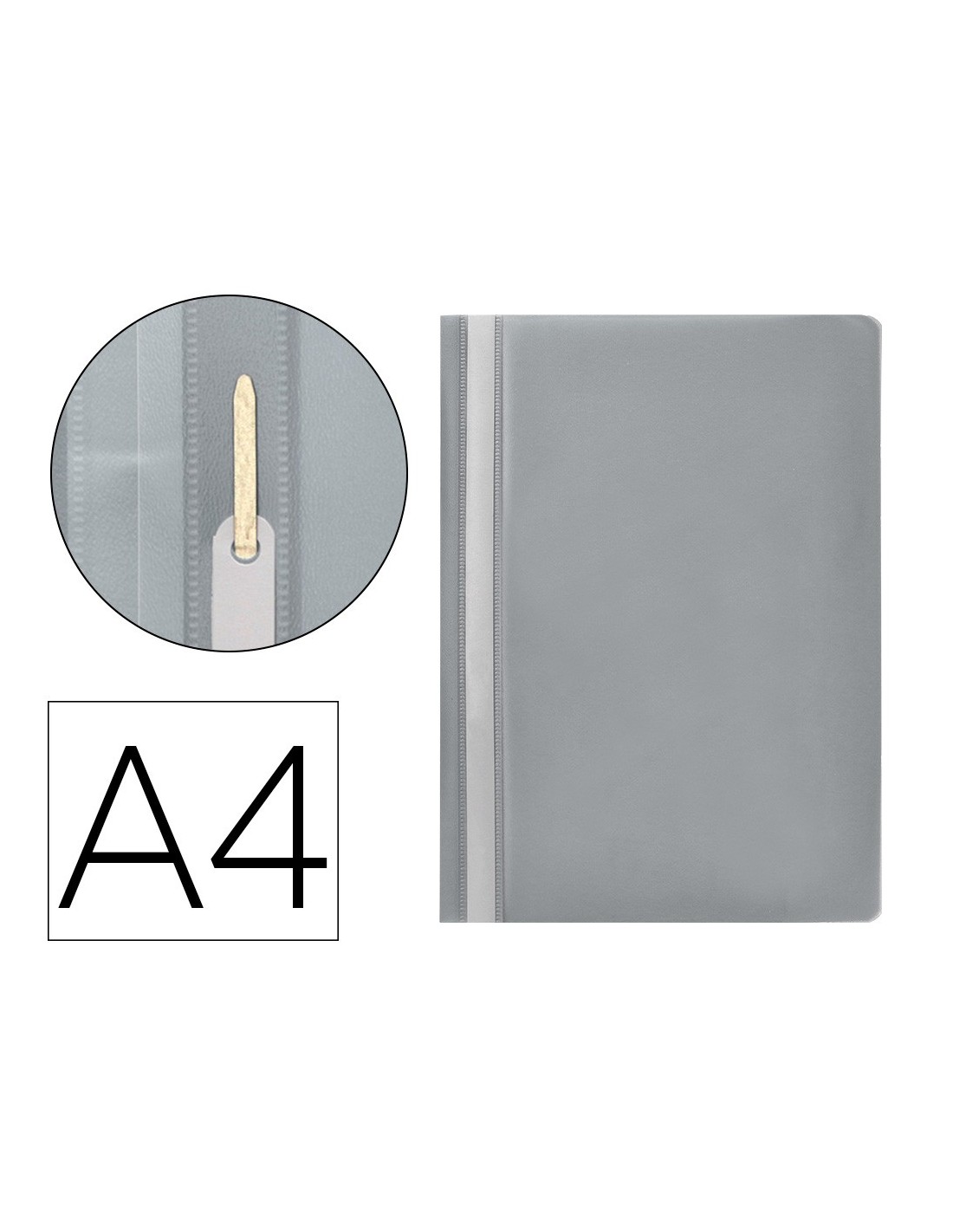 Fabricada en PVC, con fástener metálico, cubierta transparente y trasera opaca. Ventana con tira de papel en el lomo para personalizar el trabajo. Formato DIN A4. Tapa de 110 micras. Contratapa de 180 micras.