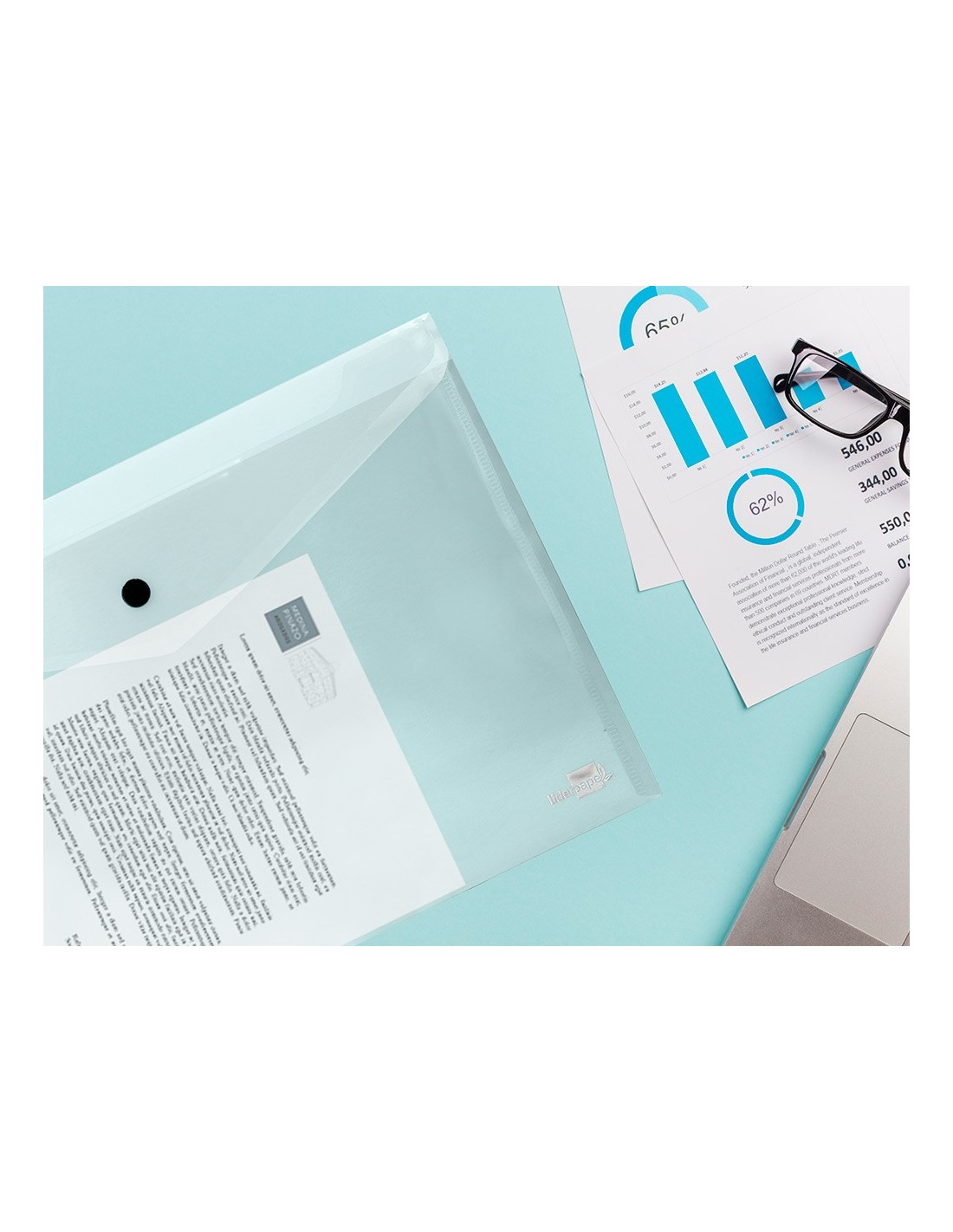Fabricada en polipropileno muy resistente. Capacidad hasta 50 hojas. 180 micras.