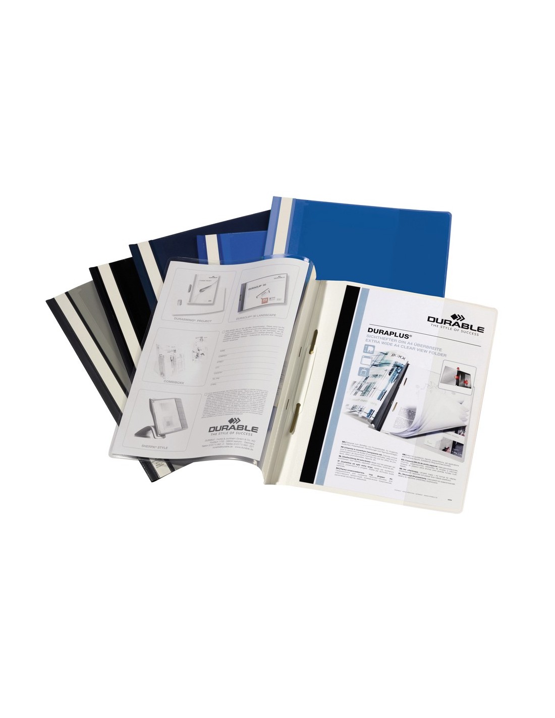 Dossier Duraplus® Durable. Fabricada en plástico, con fástener metálico con cierre de plástico, cubierta transparente y trasera opaca. Ventana con tira de papel en el lomo para personalizar el trabajo. Formato DIN A4. Tapa de 120 micras. Contratapa de 180 micras.