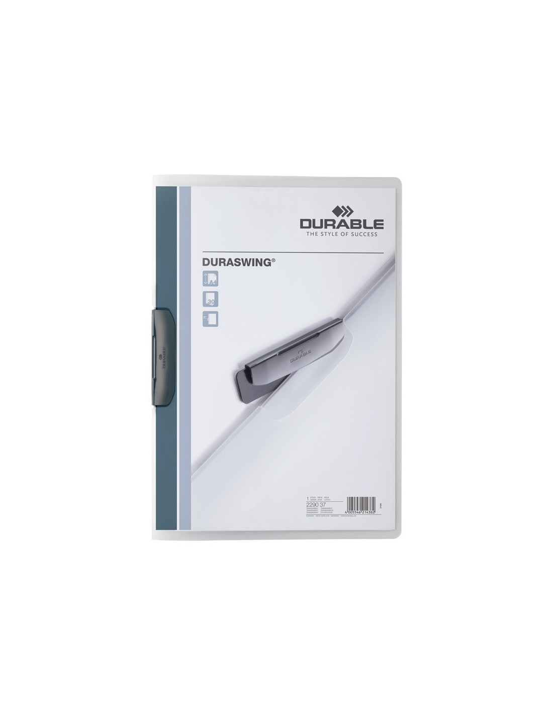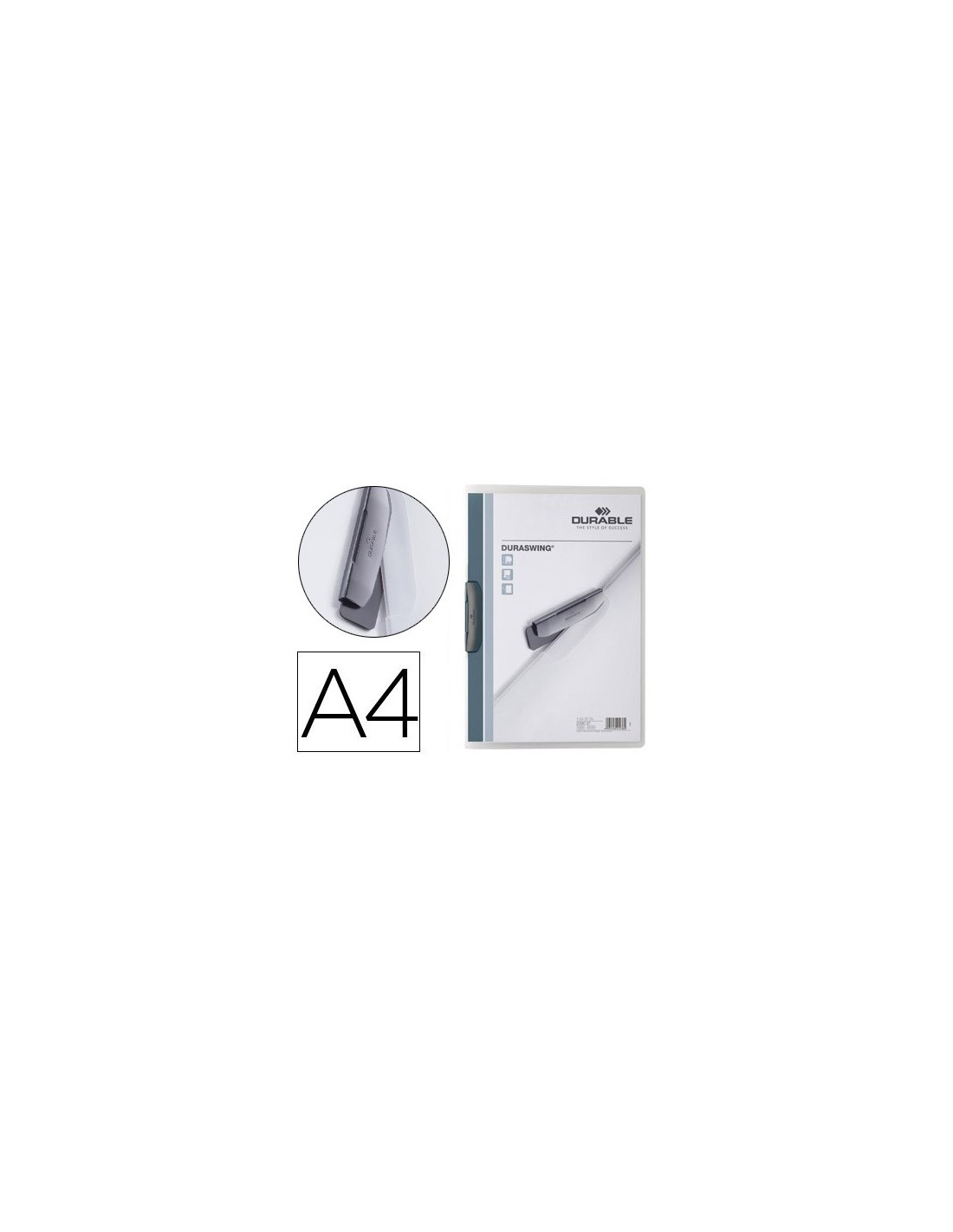 Carpeta de polipropileno translúcido con pinza giratoria de apertura lateral. Fácil de usar, sin grapas ni perforaciones. Capacidad: 30 hojas. Color grafito. Formato DIN A4. 440 micras.