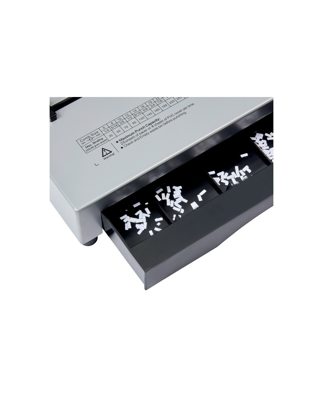 La CombBind CB25 Pro es una encuadernadora de canutillo manual fiable y resistente, diseñada para agilizar tus tareas cotidianas en la oficina, en casa y el colegio. Las espigas selectoras ajustables permiten adaptarse sinesfuerzo a tamaños de papel de hasta A4, con la flexibilidad de personali zar la profundidad de los márgenes. Diseñada para facilitar su uso, cuentacon una práctica bandeja de recogida de recortes para un acceso rápido. C on capacidad para perforar hasta 25 hojas A4 de 70 g/m², esta resistente encuadernadora A4 puede encuadernar hasta 500 hojas a la vez con espirales de 51 mm, lo que la convierte en la opción ideal para organizar documentosde forma eficaz. Color plateado.