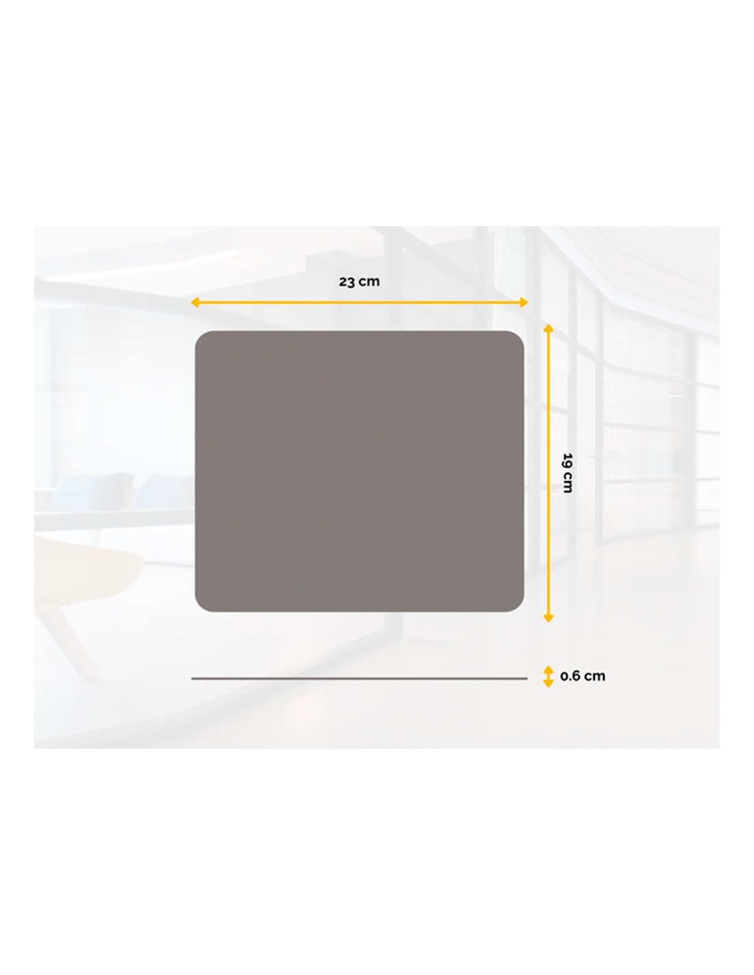 Alfombrilla con base de 5 mm de grosor en goma espuma antideslizante, con esquinas redondeadas. Superficie fabricada en poliéster para un buen rodamiento del ratón. Fabricadas con material recilado 50%. Color gris.