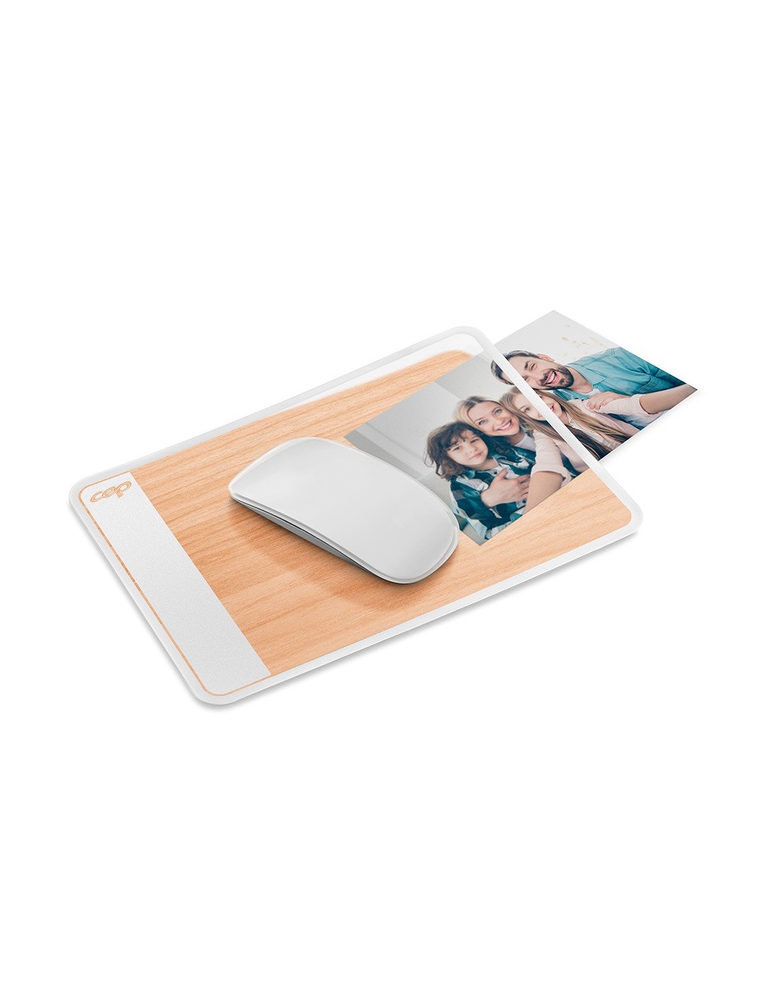 Alfombrilla de ratón con un diseño limpio. Solapa antideslumbrante para no perder de vista una foto y personalizar su espacio de trabajo. Base de impresión de madera de haya. Compatible con todo tipo de ratones. Parte inferior de espuma suave y antideslizante. Lavable por ambas caras. PVC sin ftalatos. Grosor 2 mm. Color haya. Medidas: 210 x 150 mm.