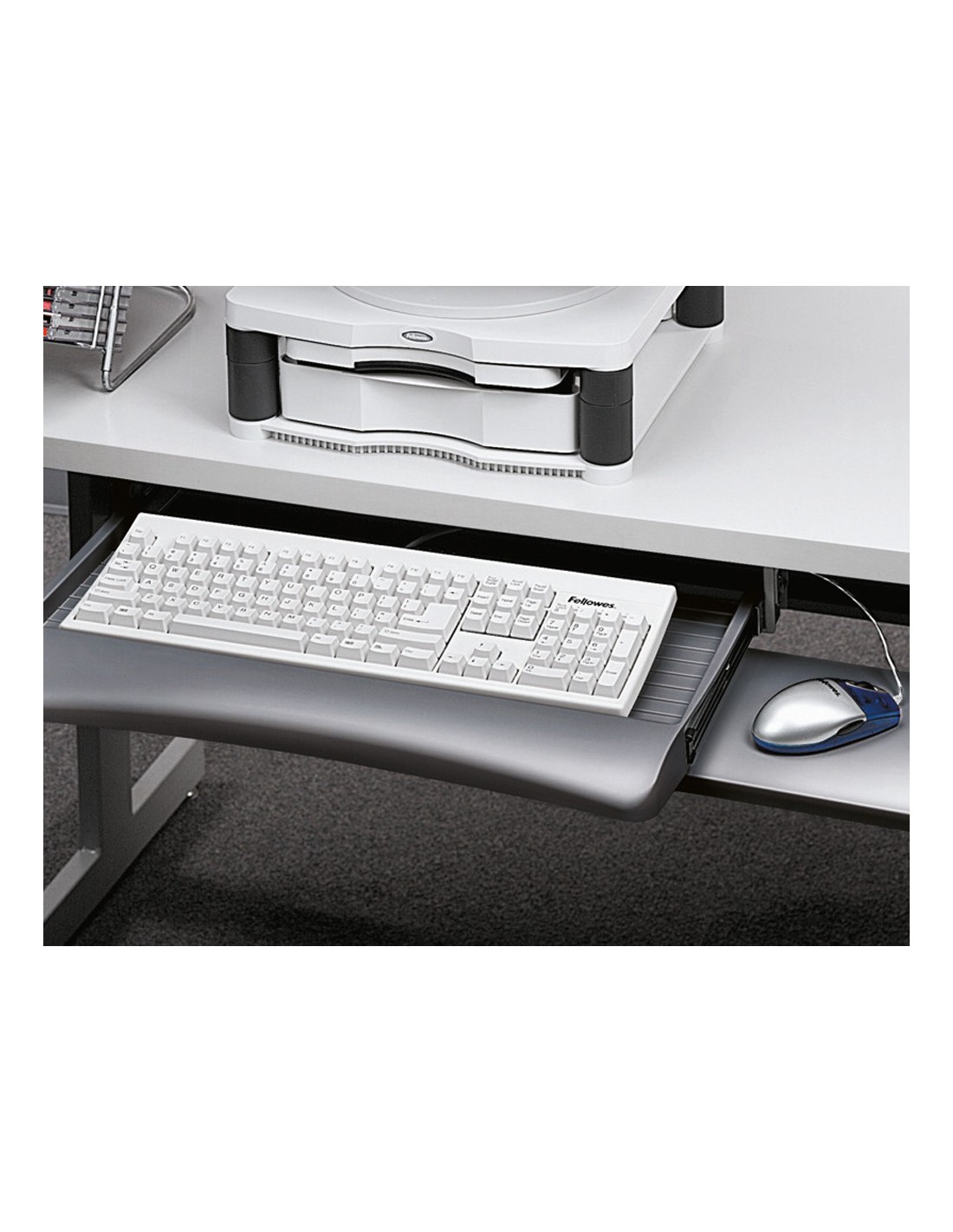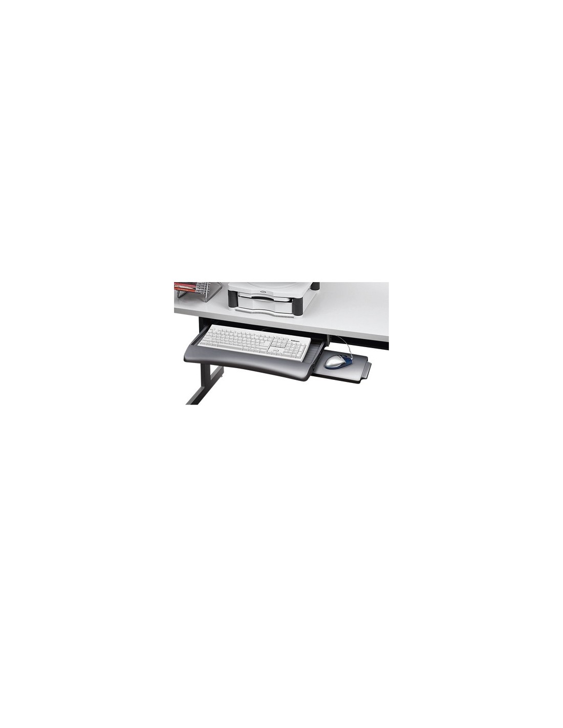 Bandeja para teclado bajo mesa, fabricada en plástico con reposamuñecas de espuma. Soporte para el ratón. Instalable a 3 alturas diferentes. Válida para cualquier tipo de teclado. Color gris grafito. Medidas: 300 x 535 x 54 mm.