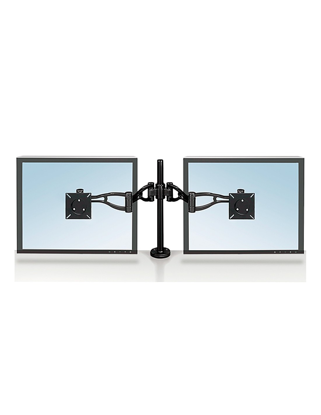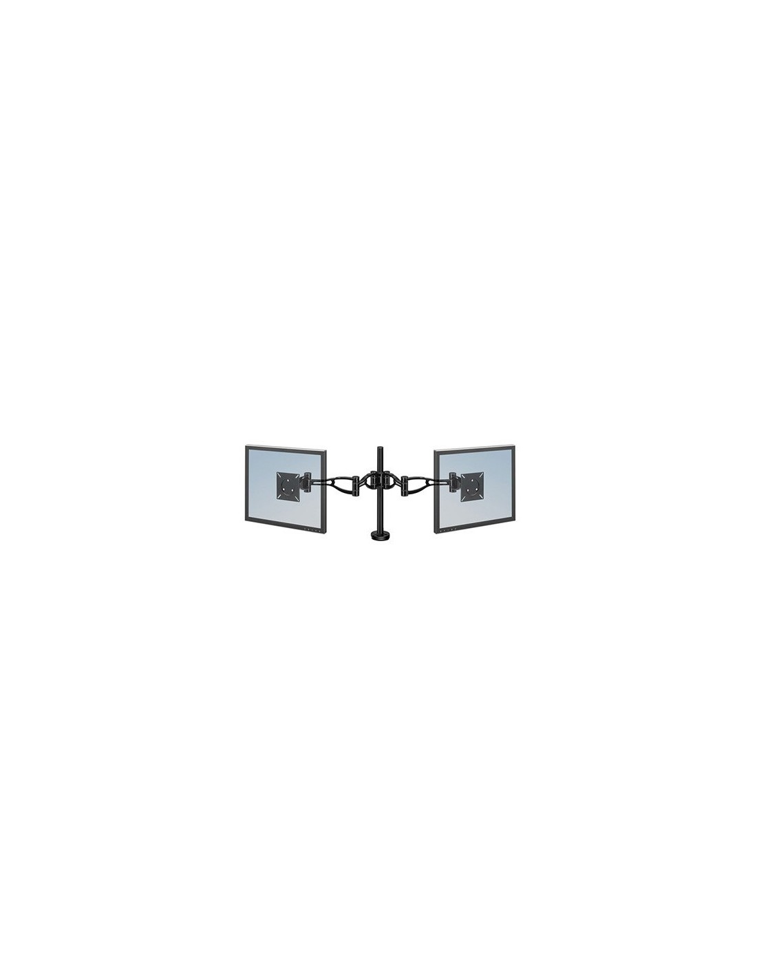 Soporte con brazo doble que permite colocar dos pantallas, reduciendo espacio y adaptando el puesto de trabajo a las necesidades del usuario. Ajustable en altura desde 8,9 cm a 41,9 cm. Regulable en profundidad (desde 6,3 a 68,6 cm). Permite inclinar la pantalla hacia arriba o hacia abajo ± 37º y un giro de pantalla de 360º. Válido para mesas de entre 2,54 cm a 7,6 cm de grosor. Cumple con especificaciones VESA. Fácil de montar con sistema de fijación de pinza o atornillado a la mesa. Medidas: 558 x 111 x 984 mm. Peso: 4,58 kg.