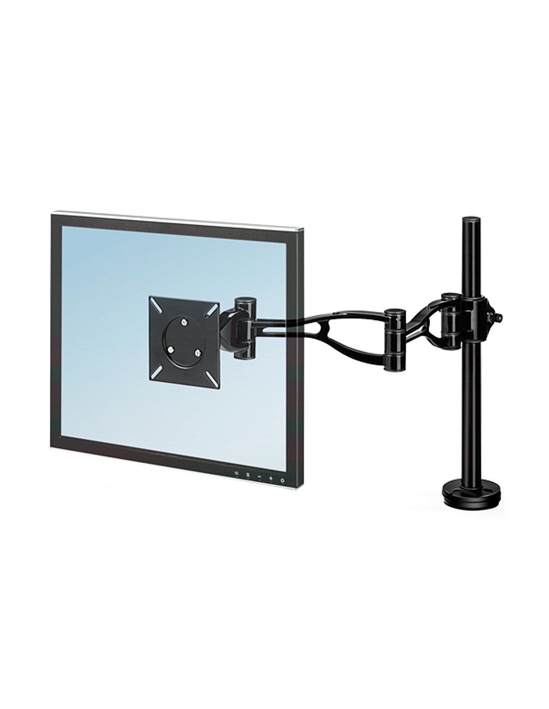 Brazo ligero que permite colocar la pantalla a la distancia correcta, evitando tensiones en cuello, ojos y brazos. Ajustable en altura desde 8,8 cm a 41,9 cm. Regulable en profundidad desde 6,3 a 68,6 cm. Permite inclinar la pantalla hacia arriba o hacia abajo ± 37º y un giro de pantalla de 360º. Válido para mesas de entre 2,54 cm a 7,6 cm de grosor. Soporta monitores de hasta 10 kg. Cumple con las especificaciones VESA. Fácil de montar con sistema de fijación de pinza, sin necesidad de utilizar herramientas. Medidas: 533 x 111 x 609 mm. Peso: 3,43 kg.