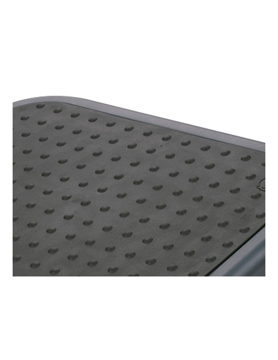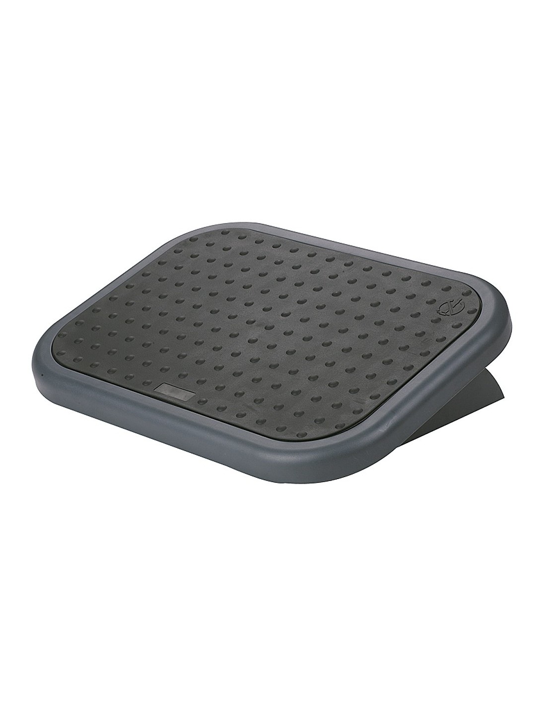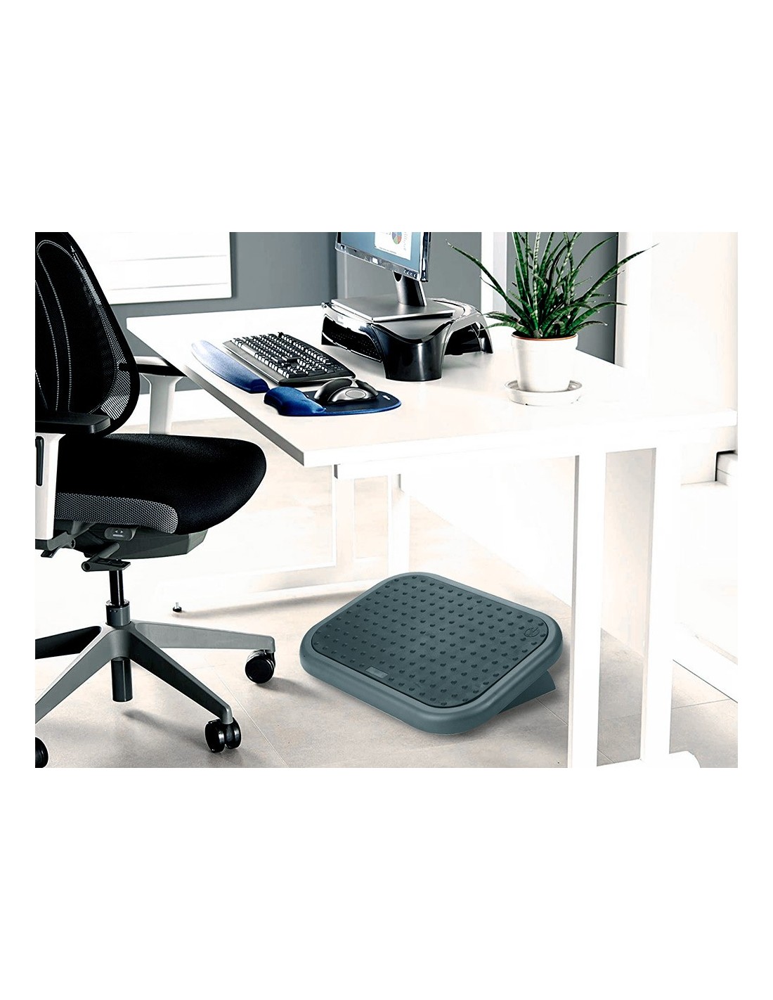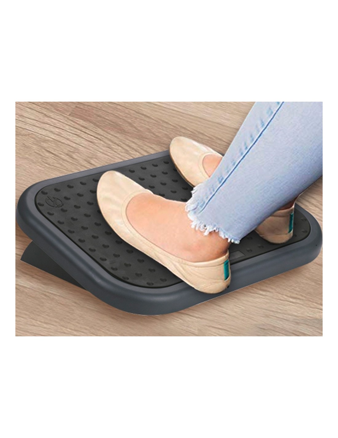 Reposapiés ajustable en altura. Con alfombrilla/base de caucho antideslizante. Superficie efecto masaje que favorece la circulación de la sangre en las piernas. Ángulo: 0-15º. Medidas: 450 x 90 x 330 mm.