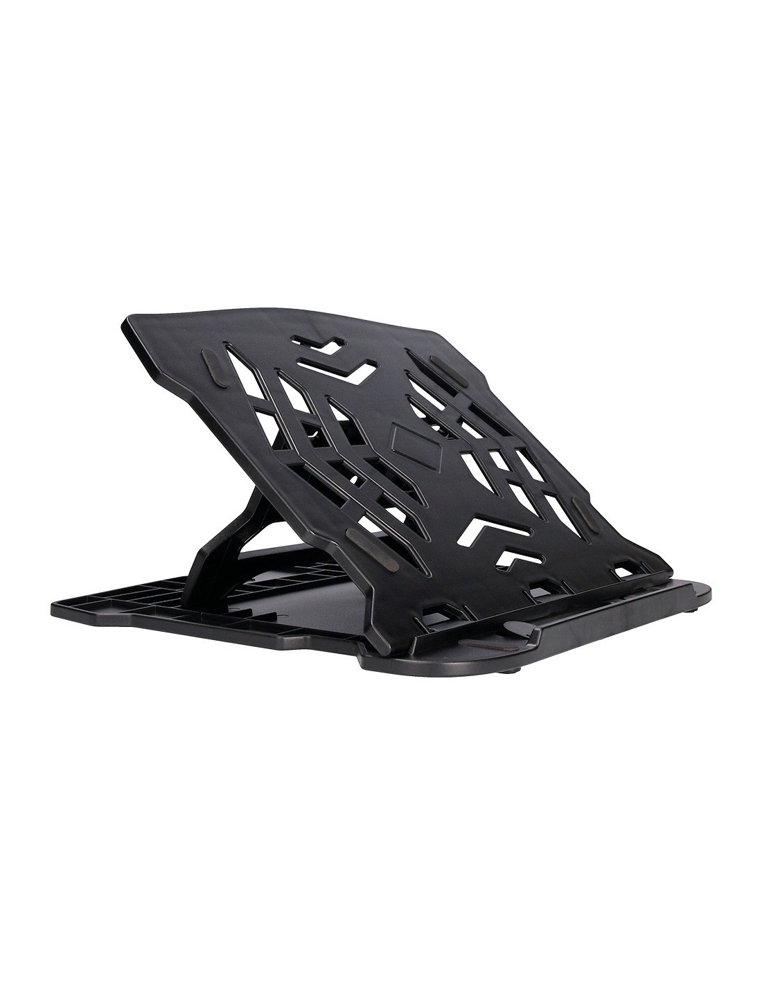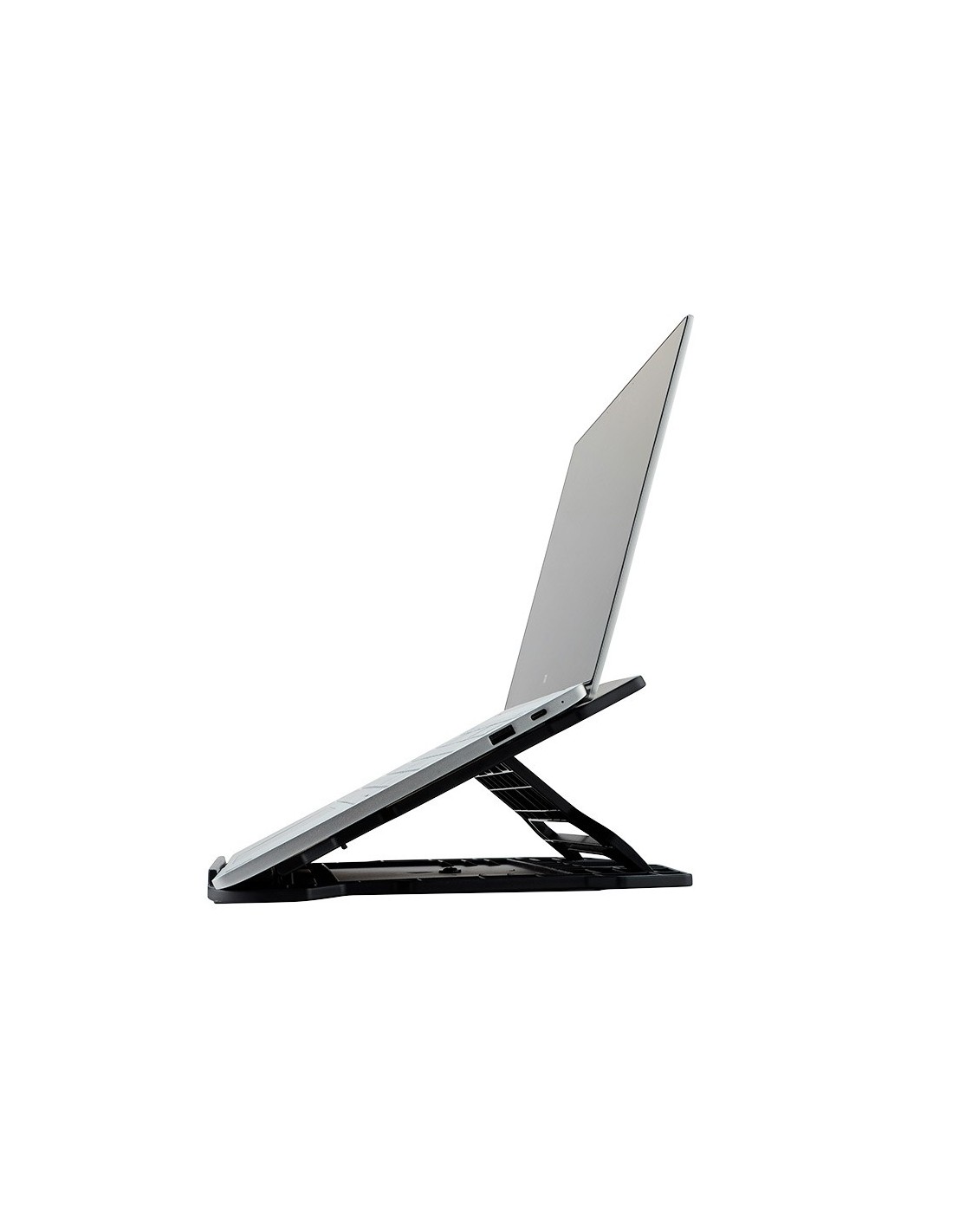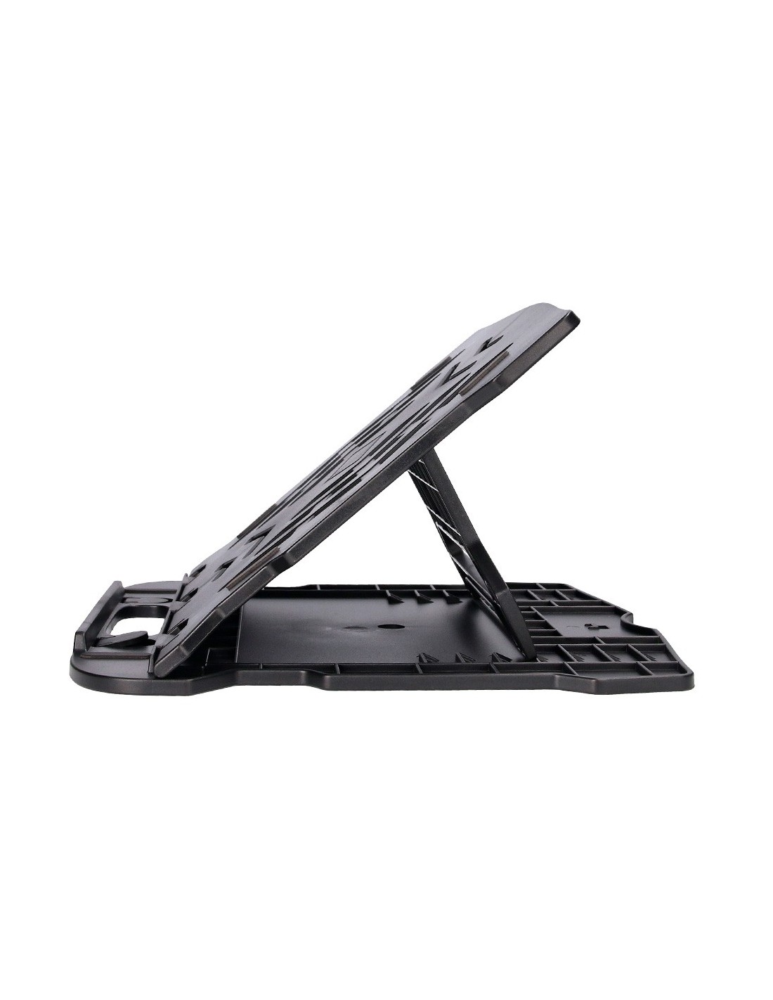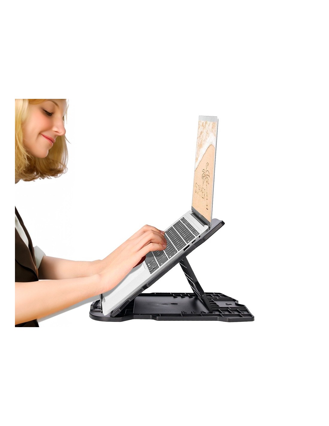 Soporte para portátil. Regulable en varias posiciones. Permite colocar el portátil en la posición deseada, hasta 7 posiciones. Para portátiles hasta 17 pulgadas o 5 kg. Su abertura permite la entrada de aire al portátil. Se pliega para un fácil transporte. Color negro. Medidas: 260 x 280 x 60 mm. Peso: 0,46 kg.