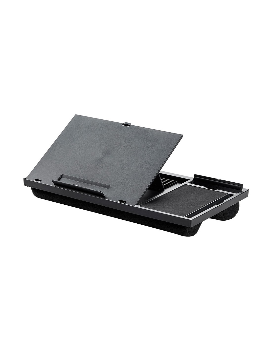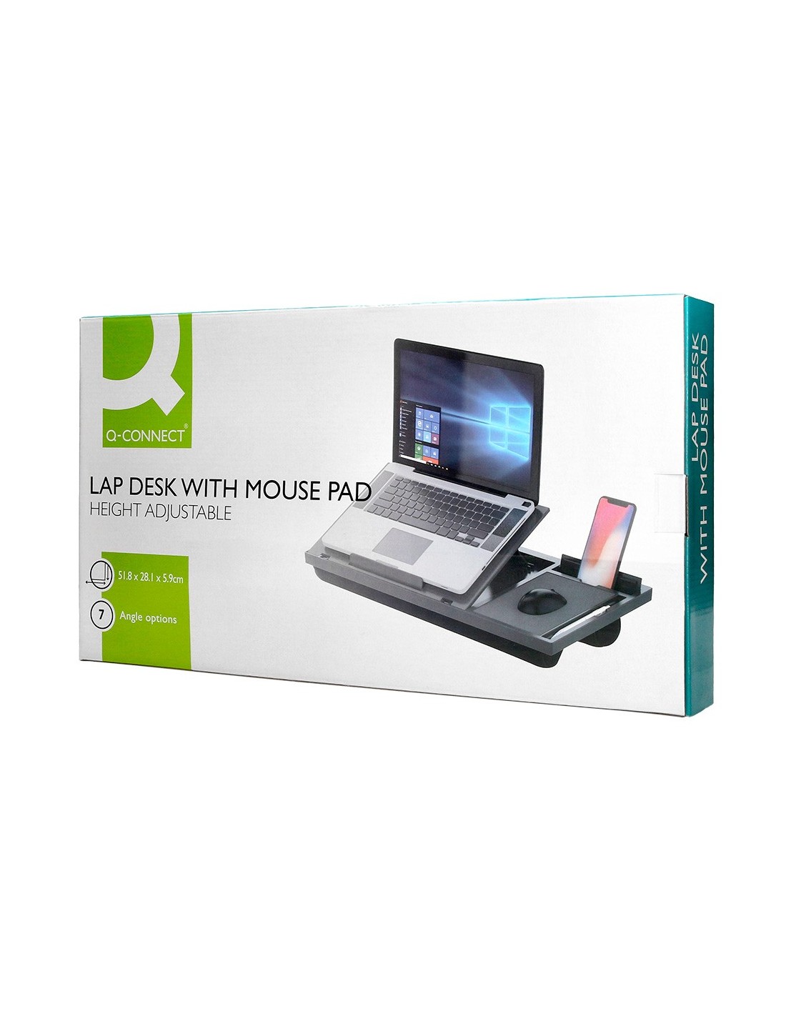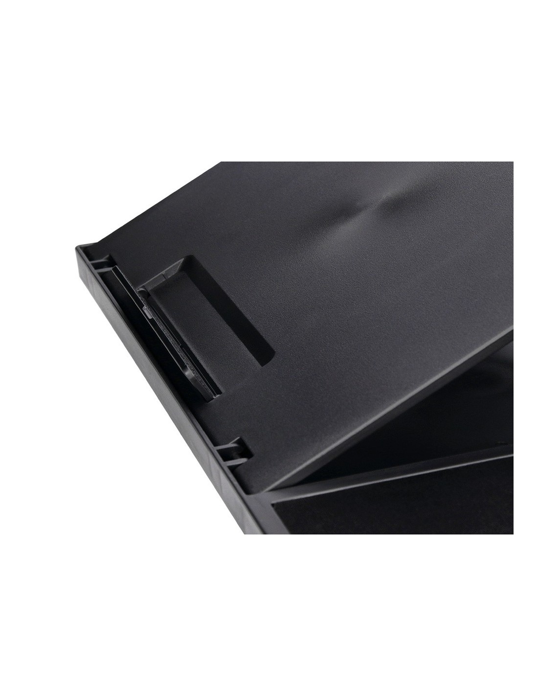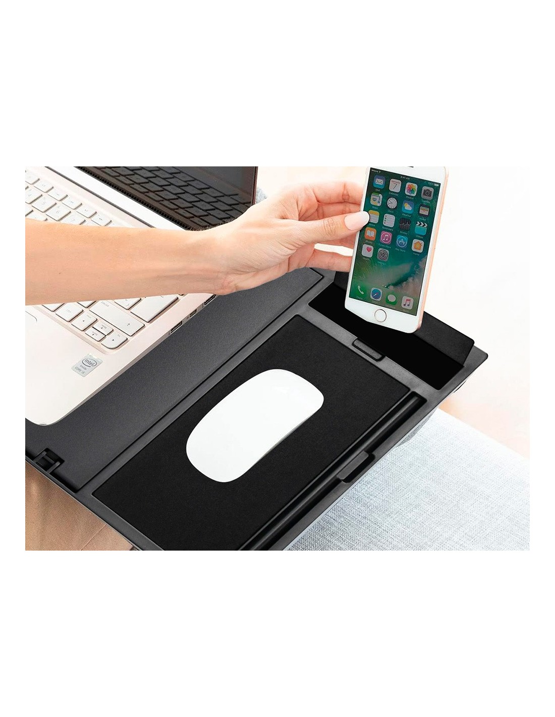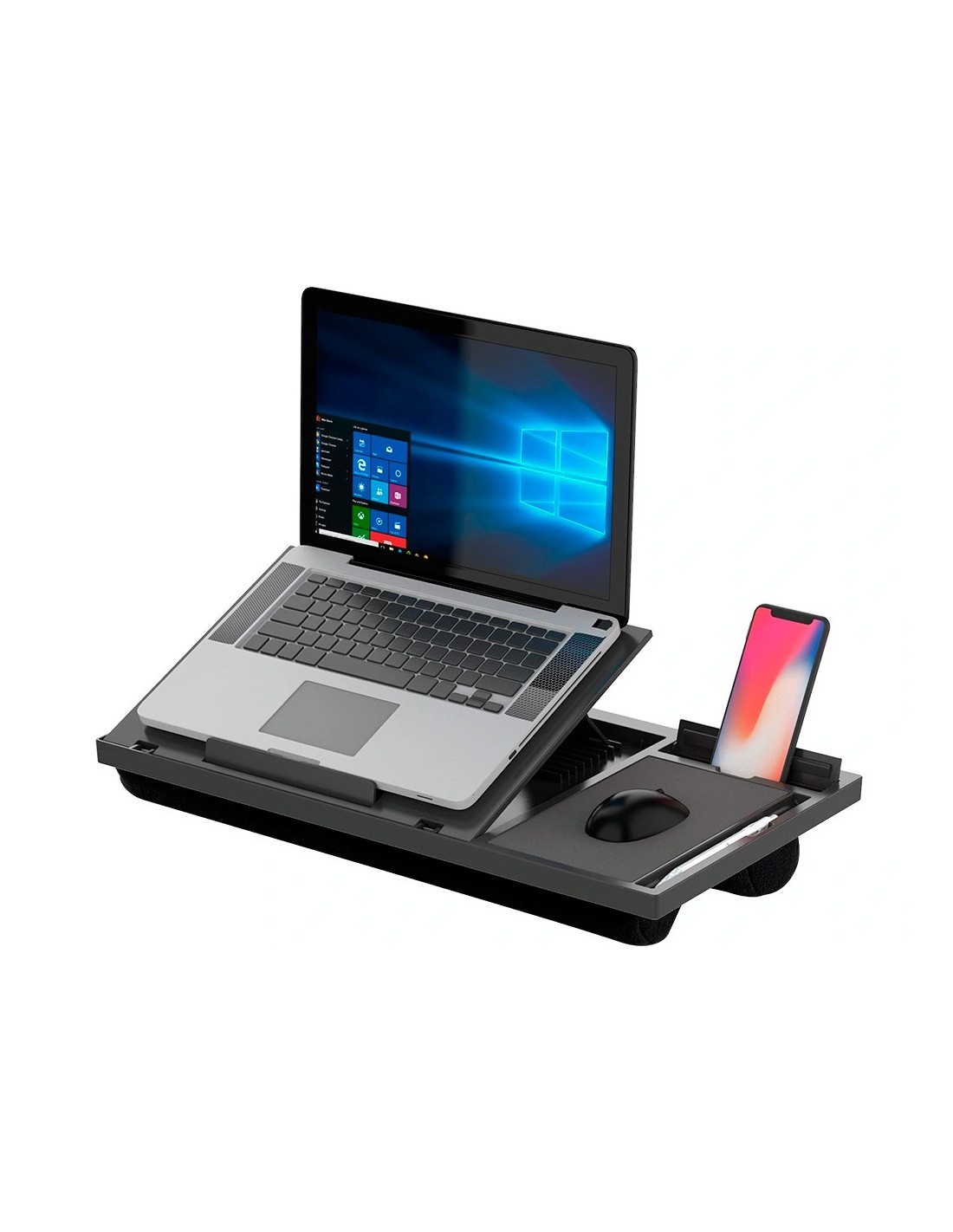 Soporte para portátil multifuncional. Este soporte para monitor se compone de una base para portátil ajustable en 7 posiciones. Con un tope frontal para evitar la caída del portátil, 1 soporte para móvil y una alfombrilla de ratón grande. Se puede utilizar como soporte para portátil, soporte de trabajo, mesa de lectura o para cualquier situación que necesite. Se puede utilizar en la cama, en el sofá o en viajes. Para portátiles hasta 17 pulgadas o 5 kg. Color negro. Medidas: 520 x 280 x 60 mm. Peso: 1,6 kg.