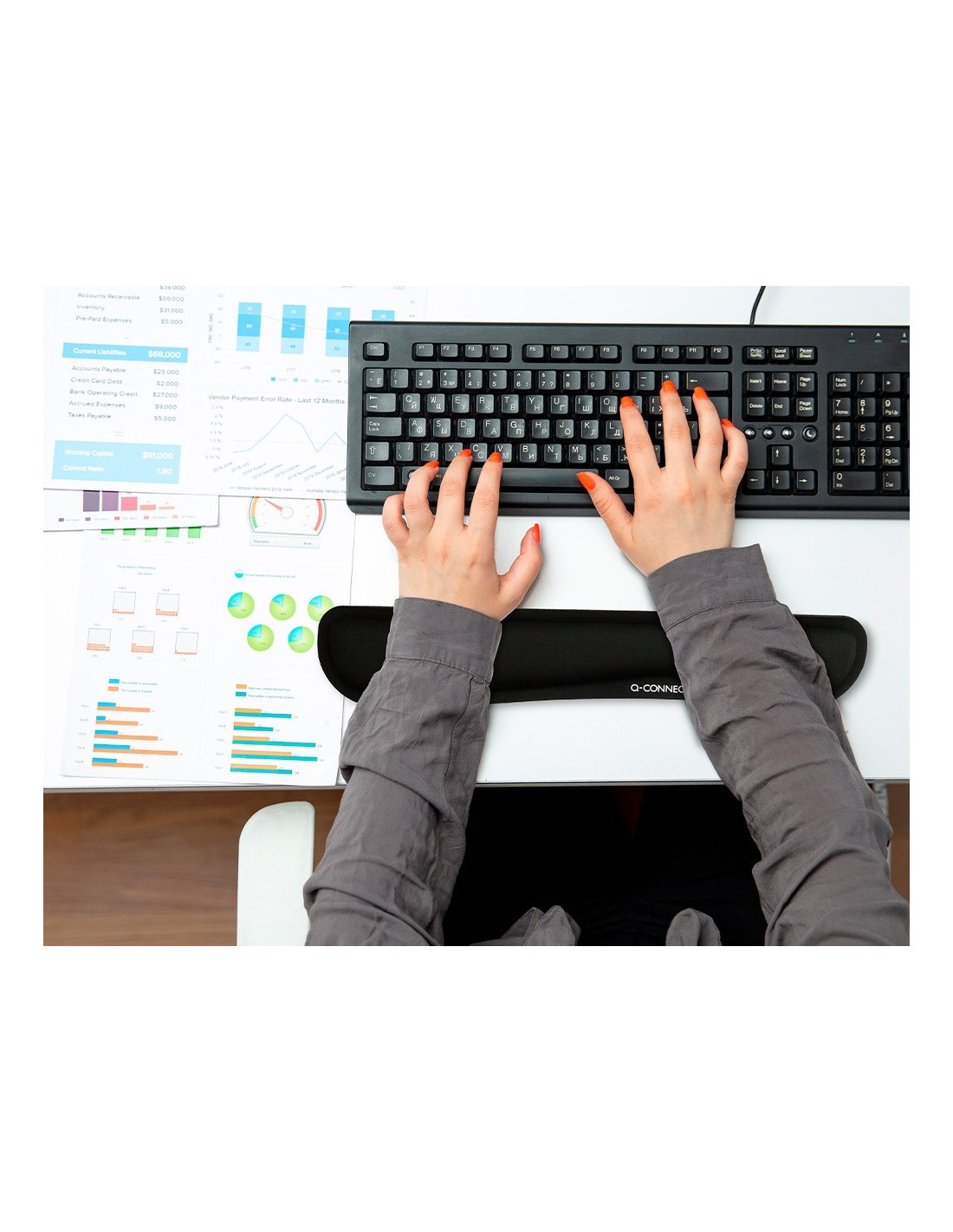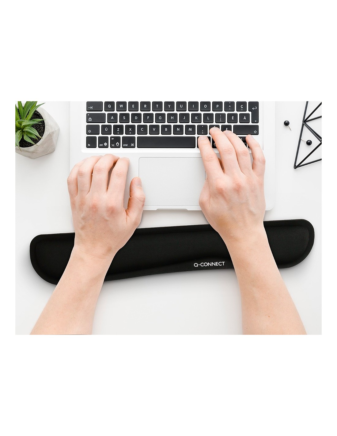 Reposamuñecas Memory Foam para teclado. Proporciona el apoyo adecuado parala muñeca, ayudando a reducir la tensión en la misma. Fabricado en espuma de alta densidad. Base antideslizante. Superficie que mejora la tracción del ratón. 460 x 85 x 25mm. Color Negro.