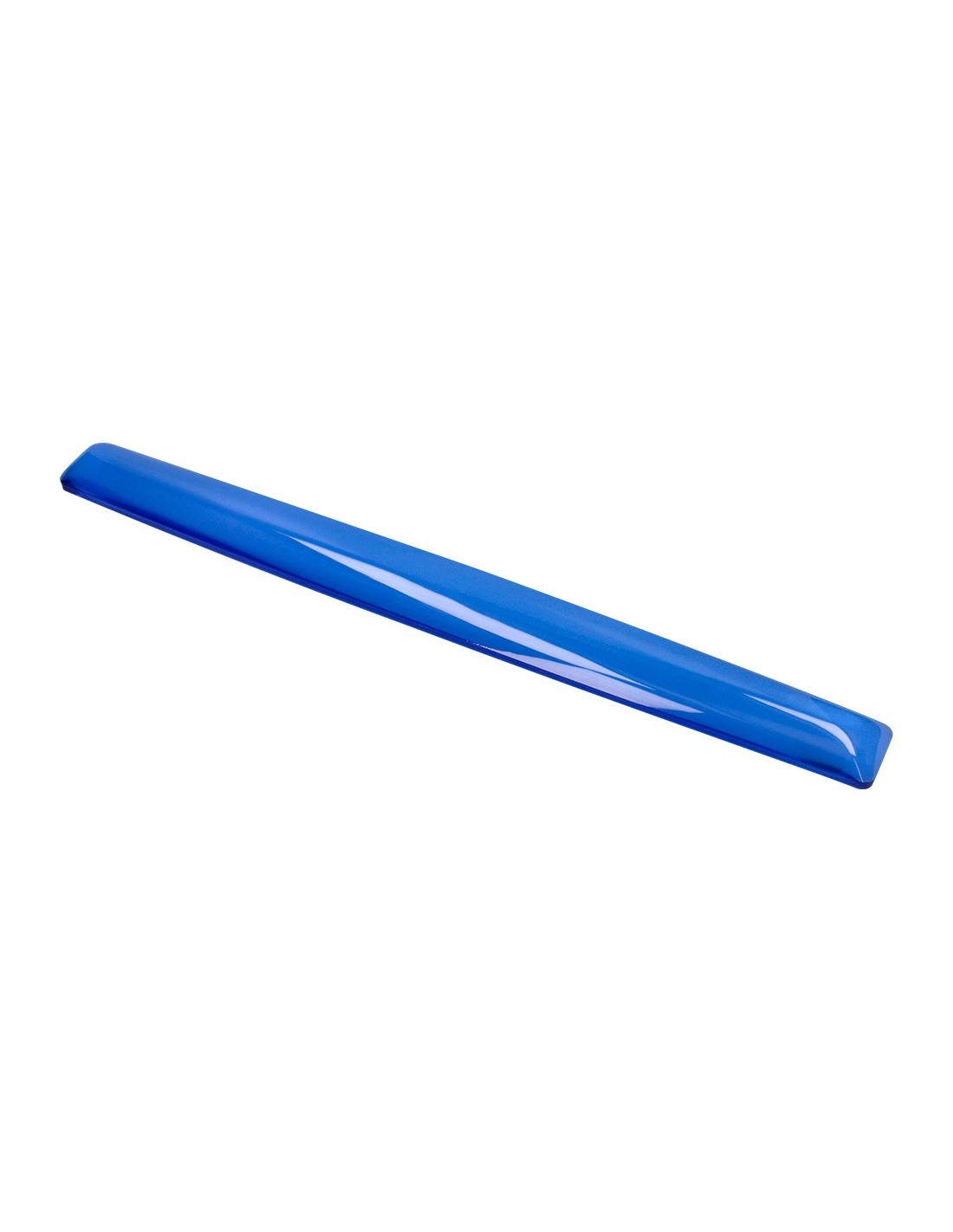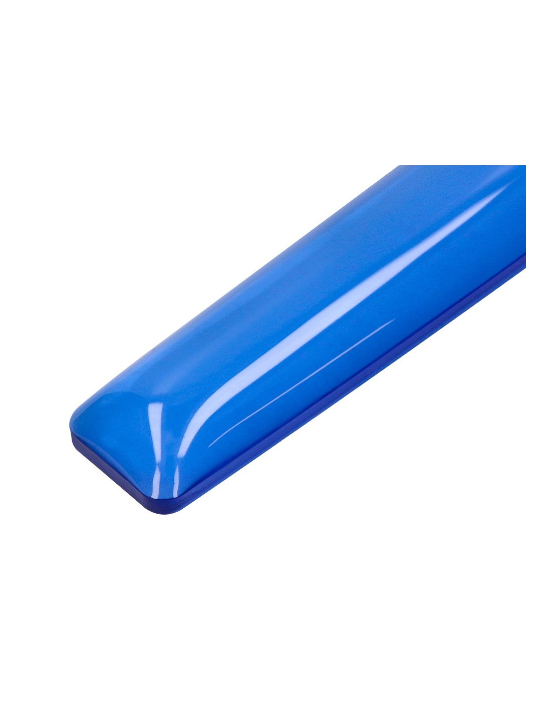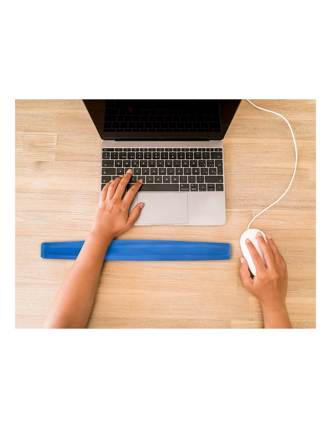 Reposamuñecas de gel para teclado. Laterales biselados. Materiales: TPU y base PU. Medidas: 525 x 58 x 17 mm. Color azul.