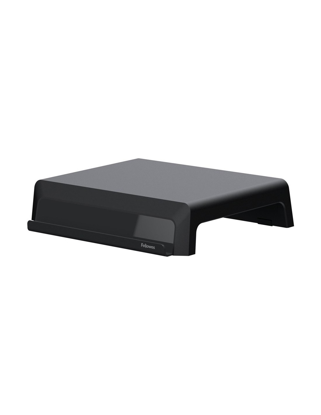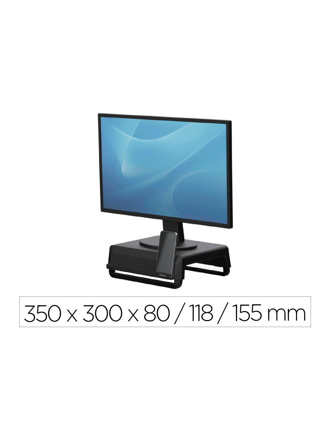 Soporte monitor con 3 ajustes de altura. Diseño compacto, liviano y portátil que es fácil de configurar, ajustar, y almacenar ideal para trabajos híbridos. Estética de diseño moderno y simple disponible en opciones de color blanco y negro. Soporte frontal para dispositivos como móviles y tablets. Fabricado de 98% ABS reciclado post-consumo,100% Reciclable y duraderos con una garantía extendida de 5 años. Soporta pantallas de hasta 30 kg de peso. Medidas: 350 x 80/118/155 x 300 mm. Peso 1,4 kg.