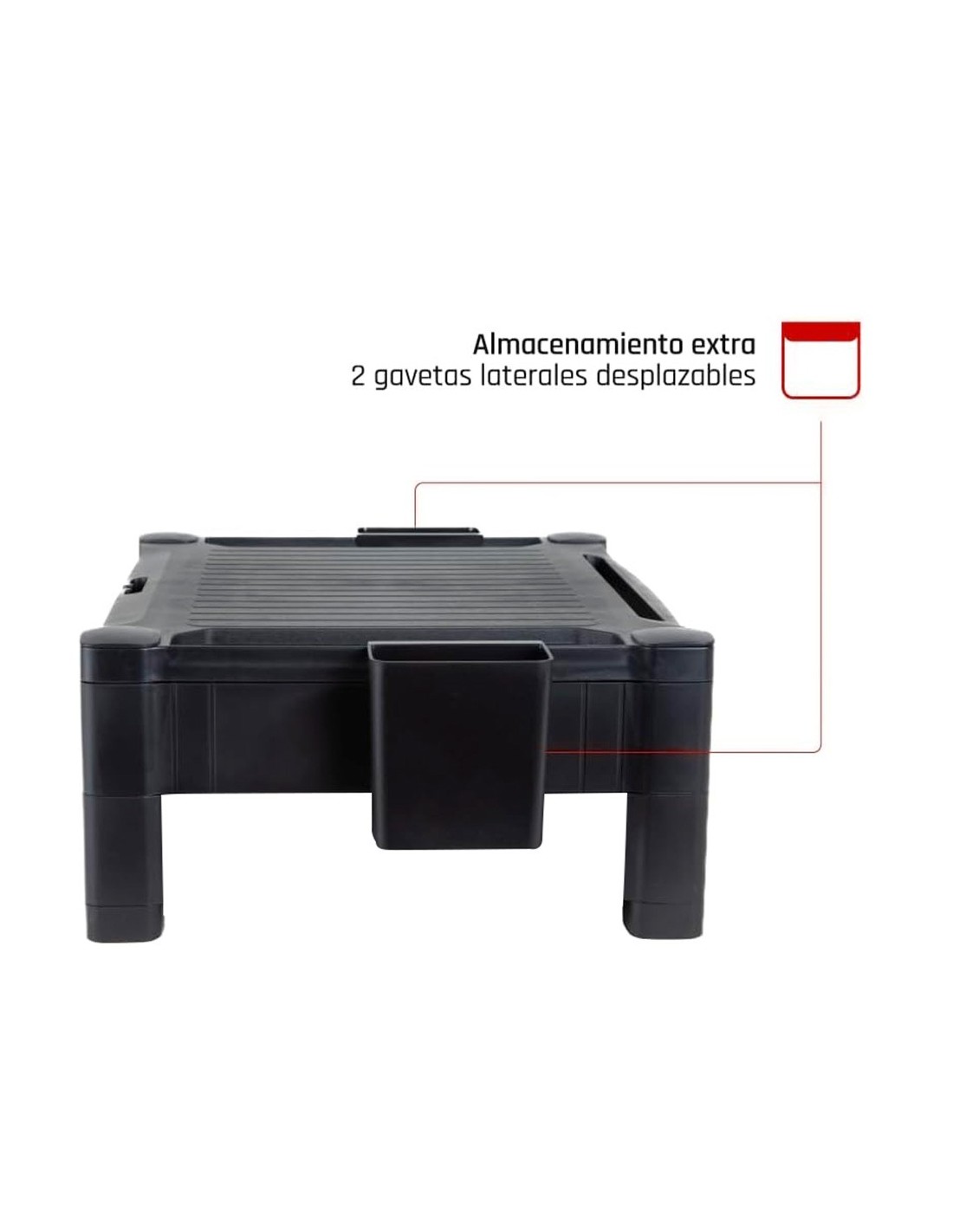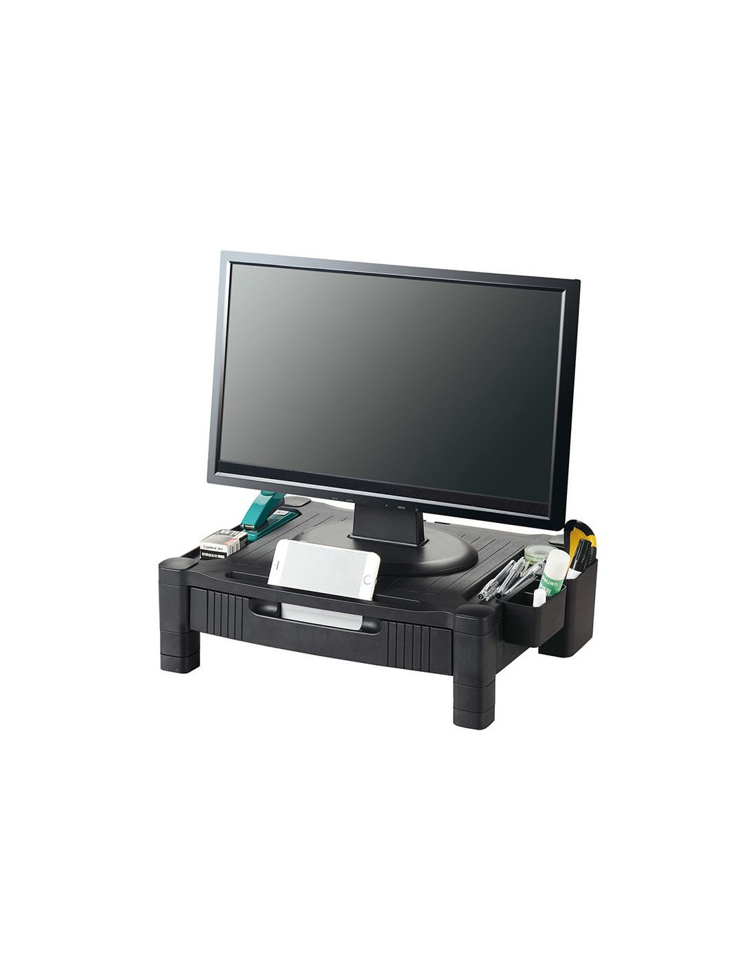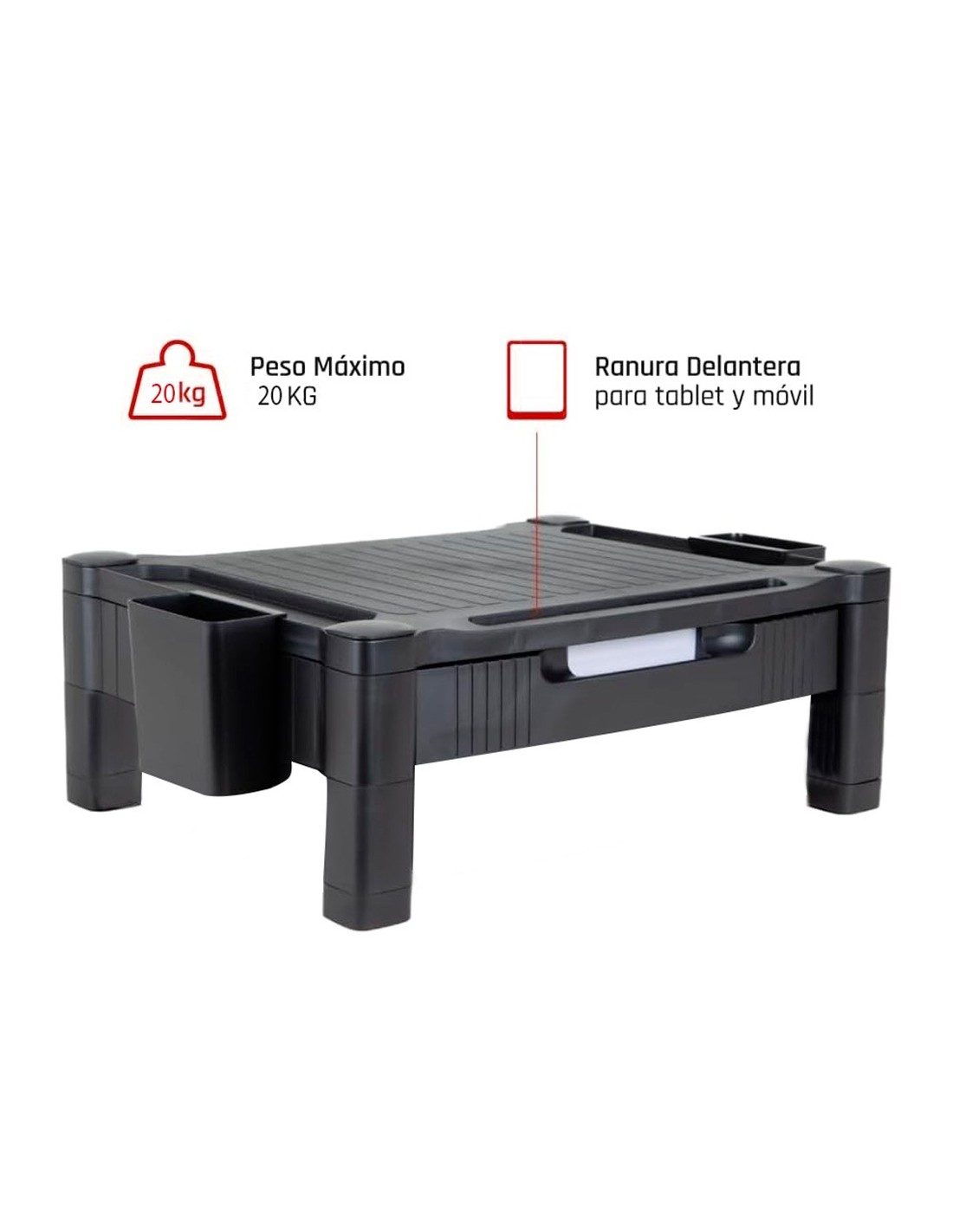 El soporte para monitor/impresora Q-Connect ofrece una solución versátil yeficiente para organizar su espacio de trabajo. Con un diseño ajustable e n dos alturas (10,3 y 13,3 cm), este soporte proporciona una plataforma resistente y antideslizante, capaz de sostener monitores o impresoras de hasta 20 kg y de hasta 22 pulgadas. Equipado con un cajón que cuenta con dos divisiones extraíbles para crear tres compartimentos pequeños o adaptarse a papeles tamaño A4, y dos organizadores laterales móviles para almacenar pequeños productos de oficina, este soporte maximiza la eficiencia y la comodidad en su entorno laboral. Su construcción de HIPS (High Impact Polystyreney) garantiza durabilidad y resistencia, mientras que su diseño elegangante en color negro complementa cualquier espacio de trabajo con estilo yfuncionalidad.