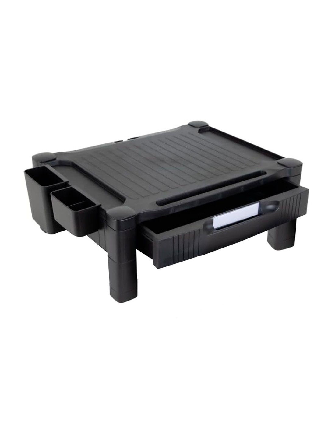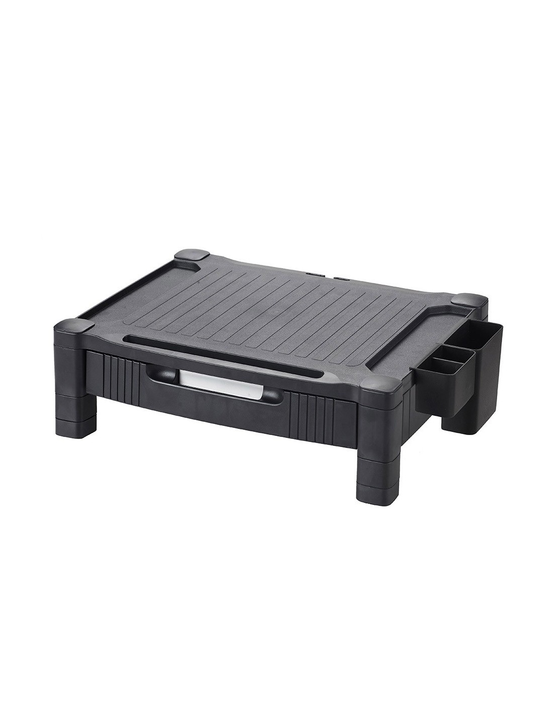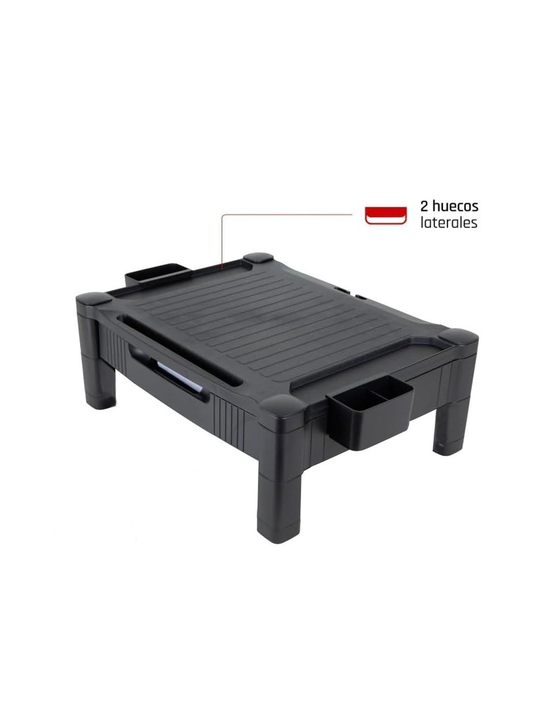 El soporte para monitor/impresora Q-Connect ofrece una solución versátil yeficiente para organizar su espacio de trabajo. Con un diseño ajustable e n dos alturas (10,3 y 13,3 cm), este soporte proporciona una plataforma resistente y antideslizante, capaz de sostener monitores o impresoras de hasta 20 kg y de hasta 22 pulgadas. Equipado con un cajón que cuenta con dos divisiones extraíbles para crear tres compartimentos pequeños o adaptarse a papeles tamaño A4, y dos organizadores laterales móviles para almacenar pequeños productos de oficina, este soporte maximiza la eficiencia y la comodidad en su entorno laboral. Su construcción de HIPS (High Impact Polystyreney) garantiza durabilidad y resistencia, mientras que su diseño elegangante en color negro complementa cualquier espacio de trabajo con estilo yfuncionalidad.