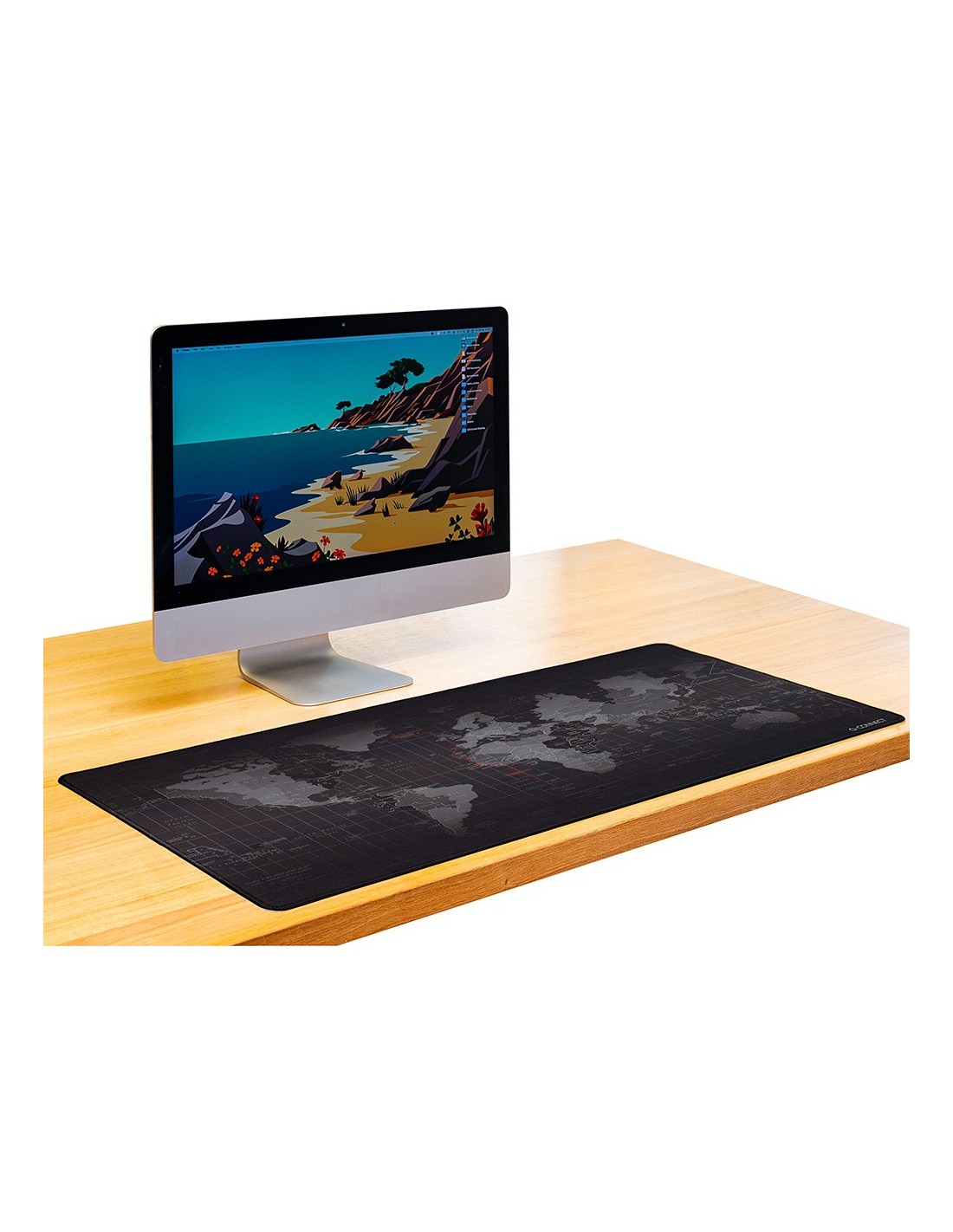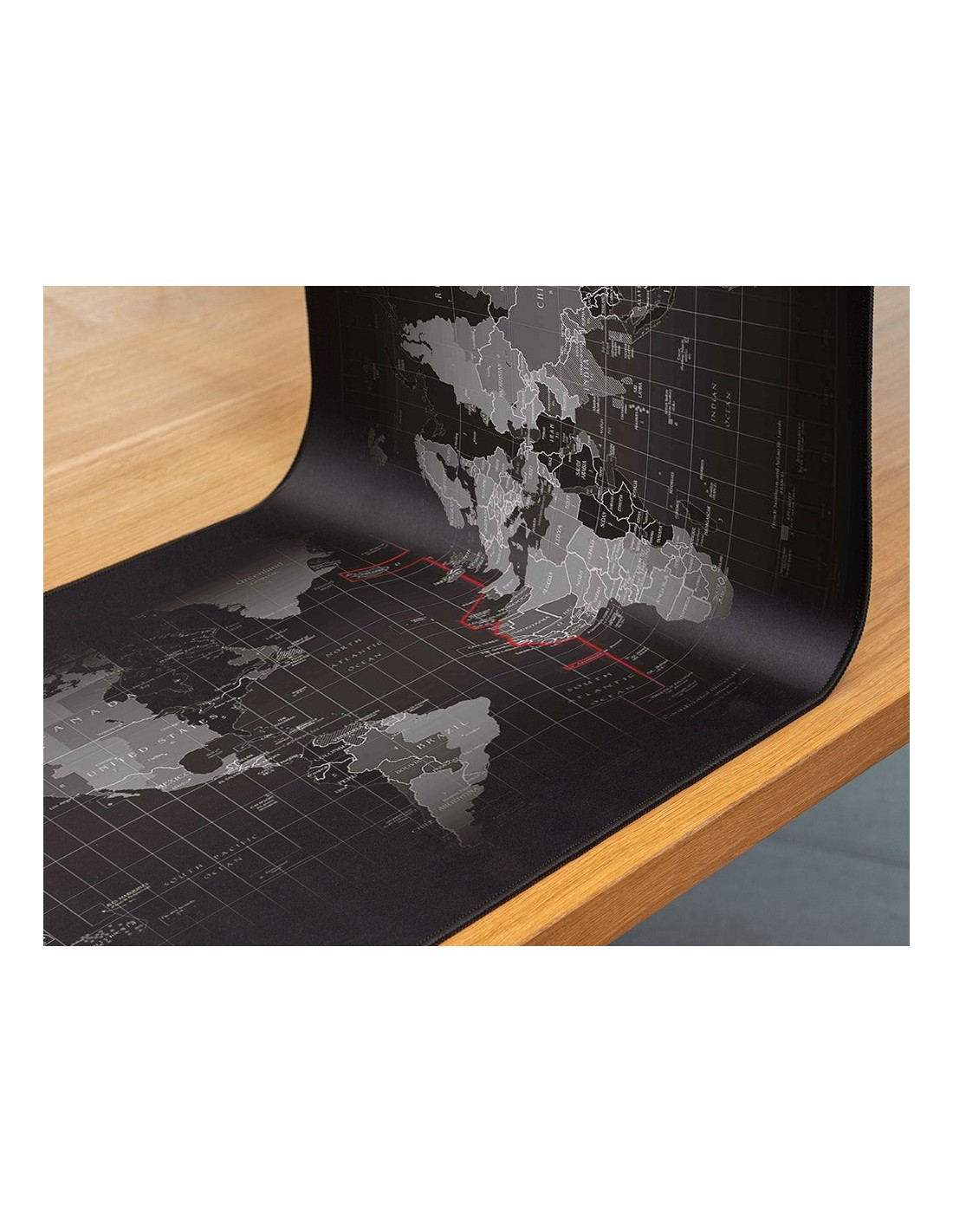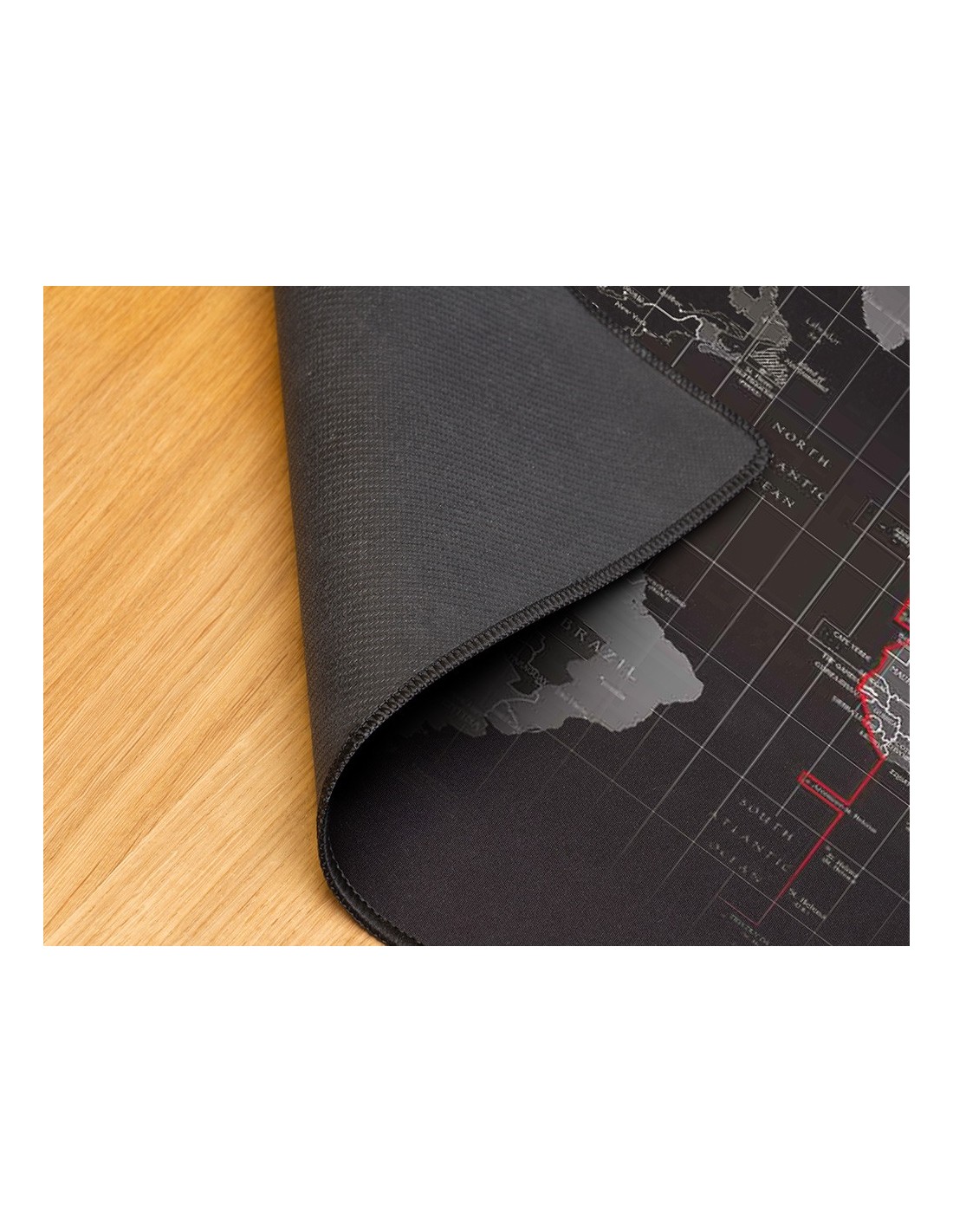 Alfombrilla de gran tamaño para ratón. Esquinas redondeadas. Superficie fabricada en poliéster para un buen rodamiento del ratón. Bordes cosidos para soportar una mayor abrasión por roce y aguantar el desgaste por uso. Parte inferior antideslizante y semiflexible, para aumentar el agarre y la sujeción estable en superficies lisas. Color negro y diseño mapa del mundo. Medidas: 900 x 400 mm.